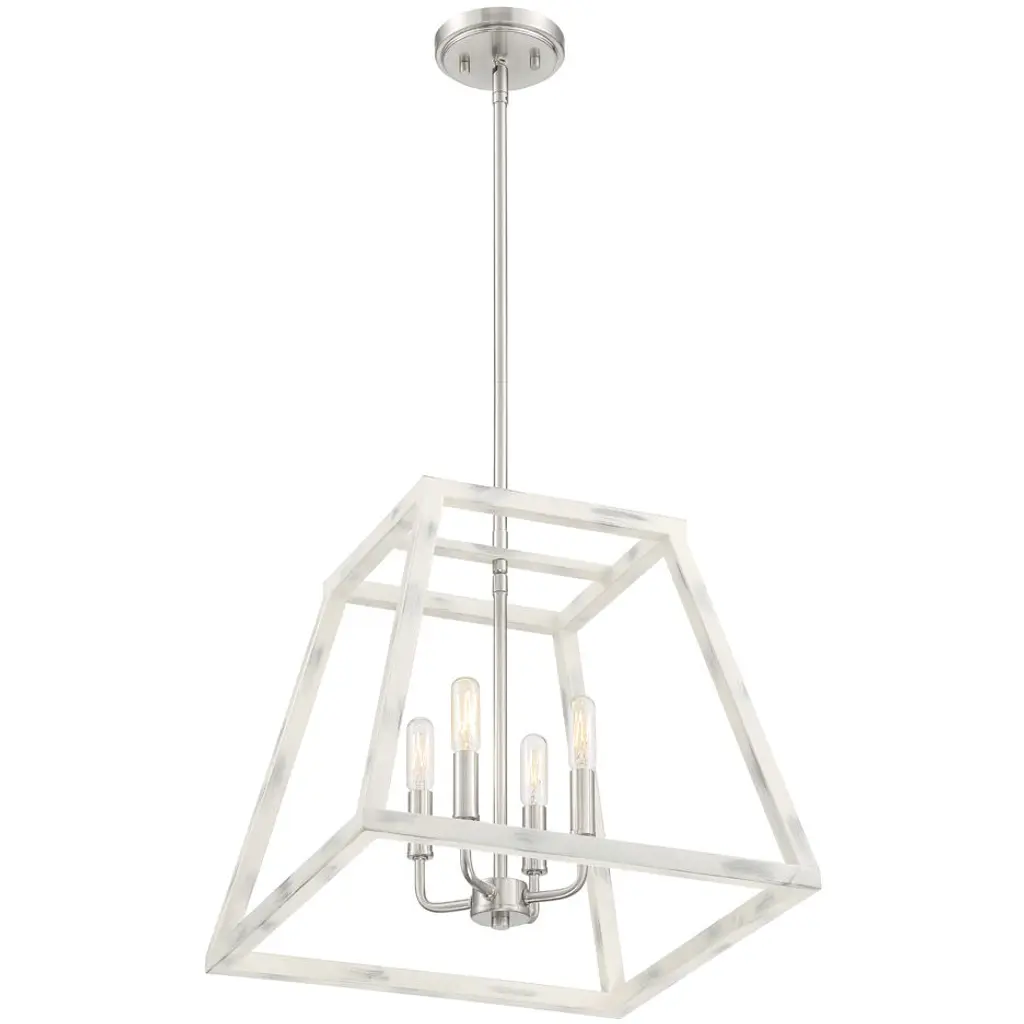 Satin Platinum finish silhouetted by a hand painted Coastal Weathered White Wood cage. The Rhode collection offers a modern elegance with timeless appeal. This hanging pendant is designed to be the star of your room. It's designed for easy installation in dining and living areas. Satin Platinum finsh silhouetted by a hand painted Coastal Weathered White Wood cage. The Rhode collection offers a modern elegance with timeless appeal.