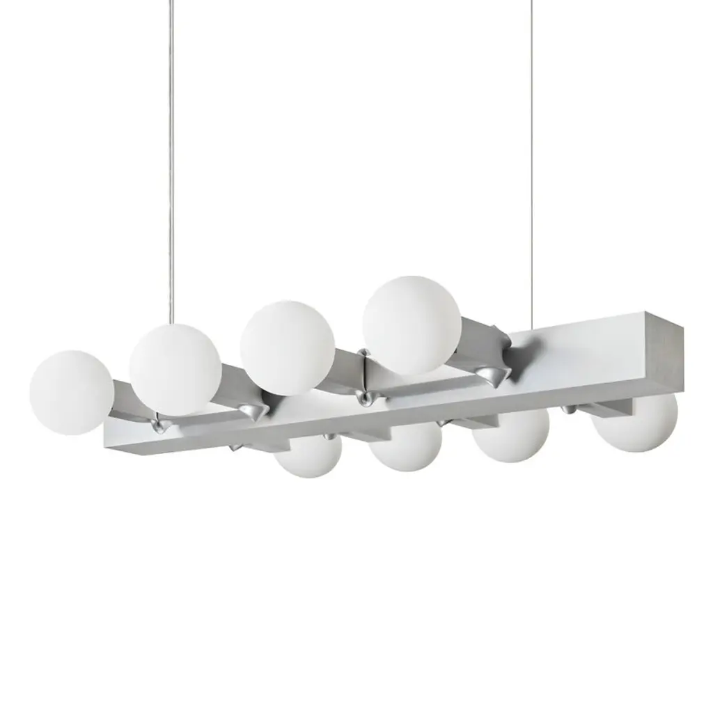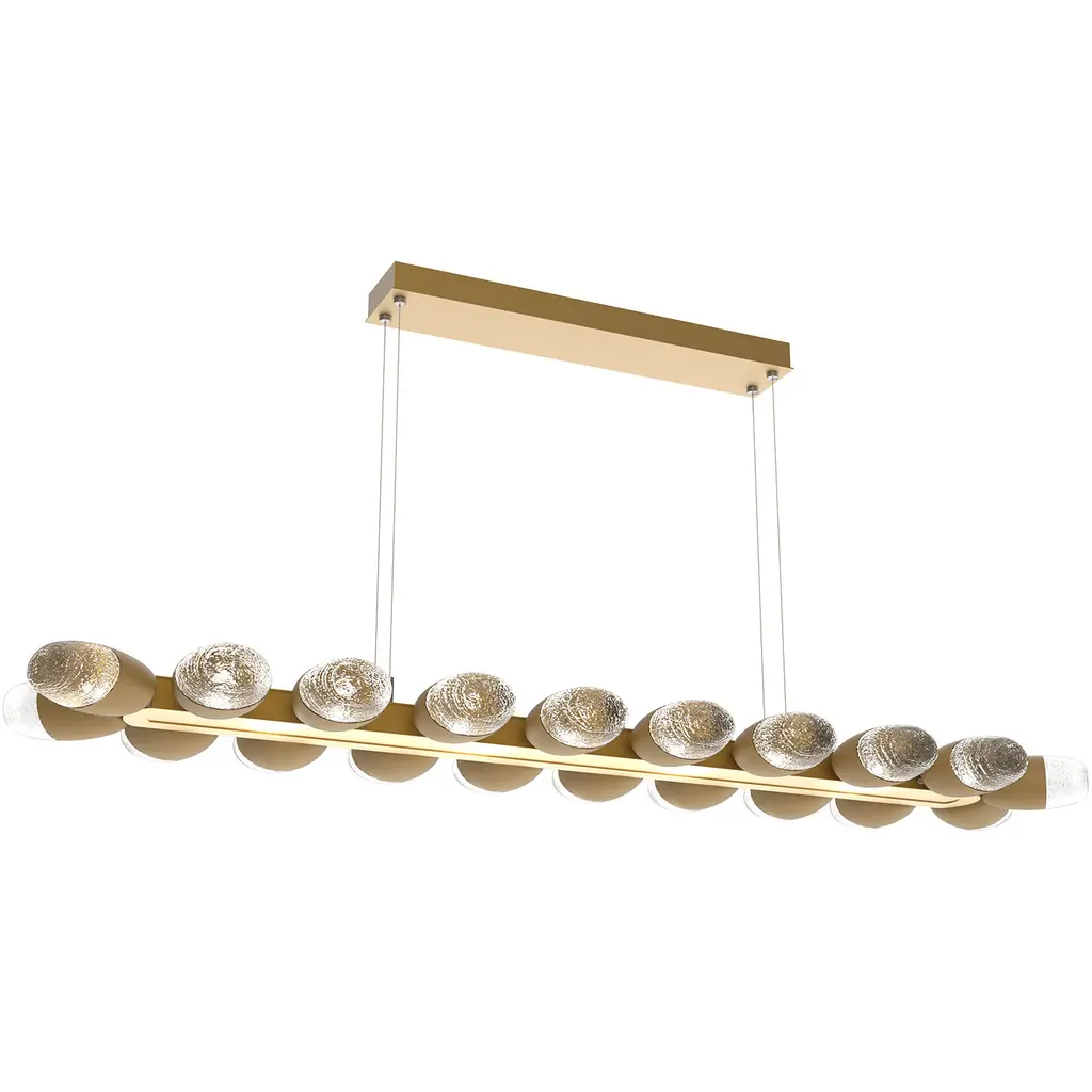 Rhythm is a metal pendant lamp with pyrex spheres. Available in 2 variants:- RHYTHM 88 G9 24W - 3000°K - 220 Vdc - 2240 lm- RHYTHM 44 G9 12W - 3000°K - 220 Vdc - 1120 lmFinish | satin gold, opaque brown tin. Other finishes on request.Color | pyrex spheres in satin brown color. Other colors on request.Details | pyrex spheres with satin decoration. The metal structure is produced handmade. The suspension S8 is an example to indicate the modularity: by multiplying the base module S4 it’s possible to obtain different lengths and different number of lights.