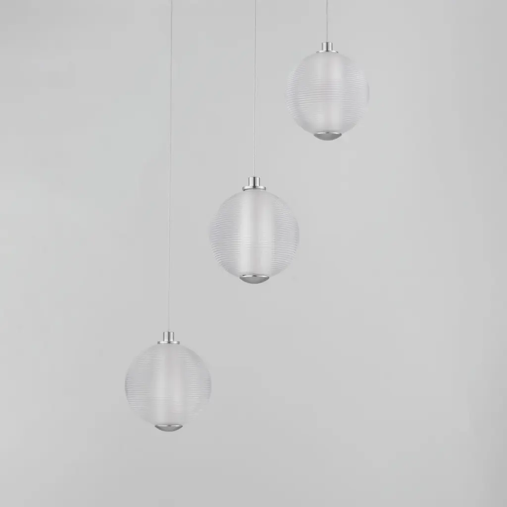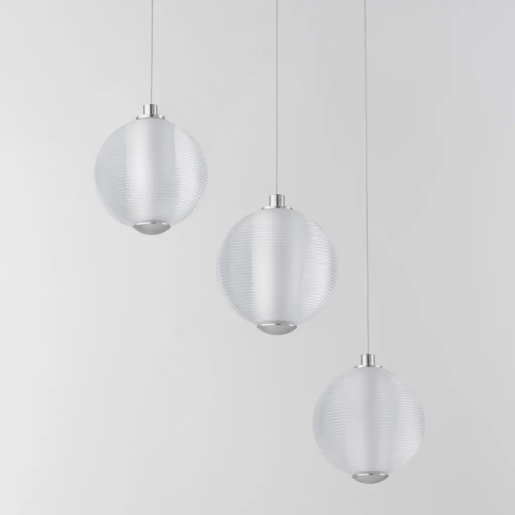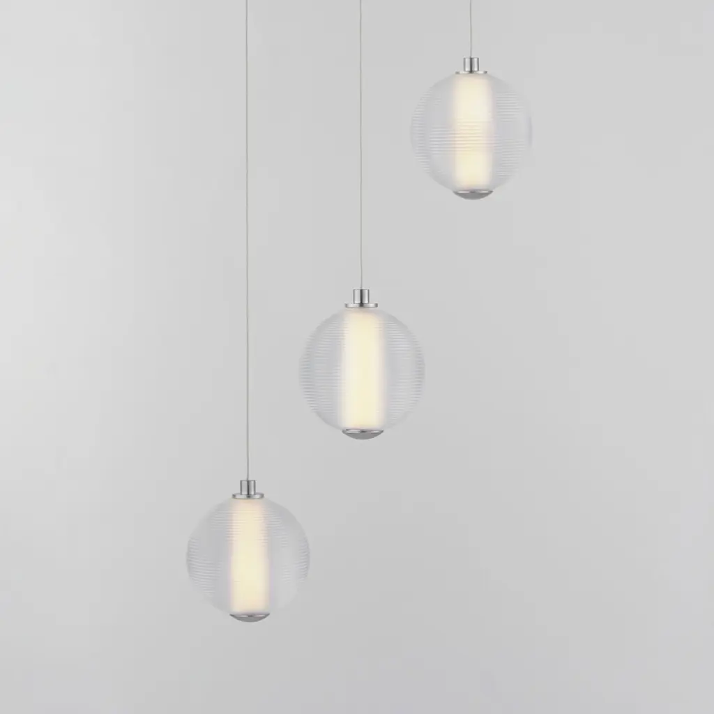 Ablaze with omnidirectional LED light radiating from the center of perfectly ribbed spheres, the lustrous glow within accentuates the repeating pattern on the glass' exterior. With minimal hardware visible outside the glass, select from Polished Chrome or Gold to match your interior's decor.