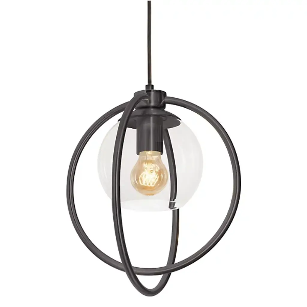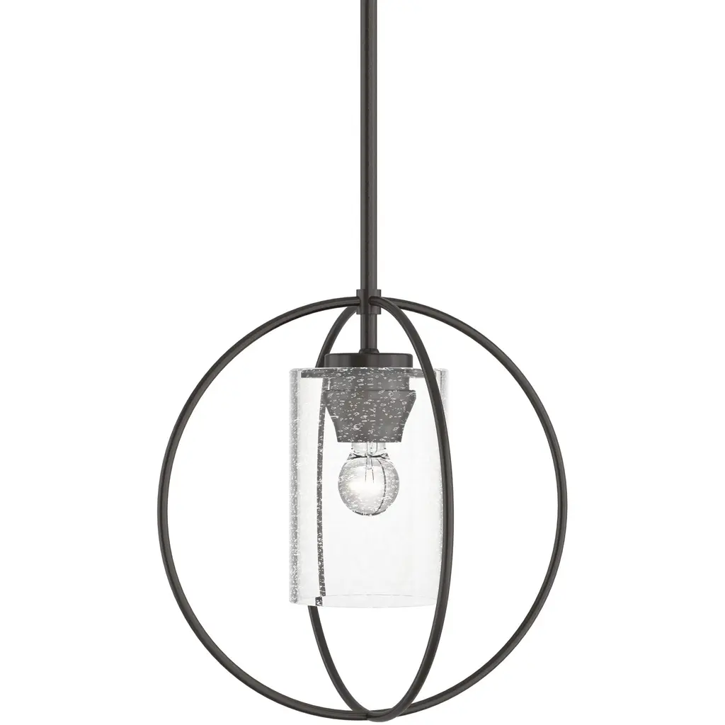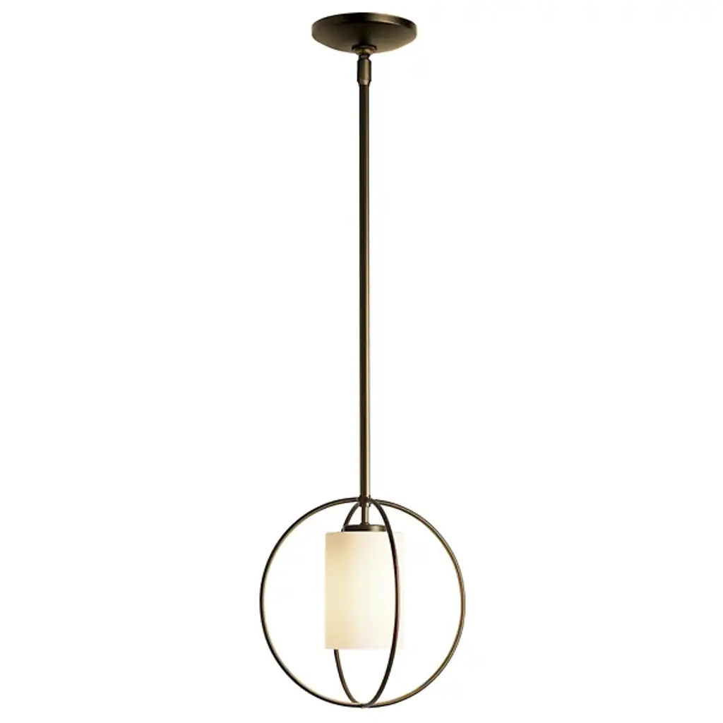 The Hubbardton Forge Rhythm Pendant features a clean and geometric piece that centers around beautiful glass. Two wrought iron rings form a sphere shape around the glass shade, the illumination peacefully diffused through the delicate cylinder. The minimalism in the piece makes it great for contemporary spaces, while the classic mixture of glass and iron make it great for more traditional spaces as well.