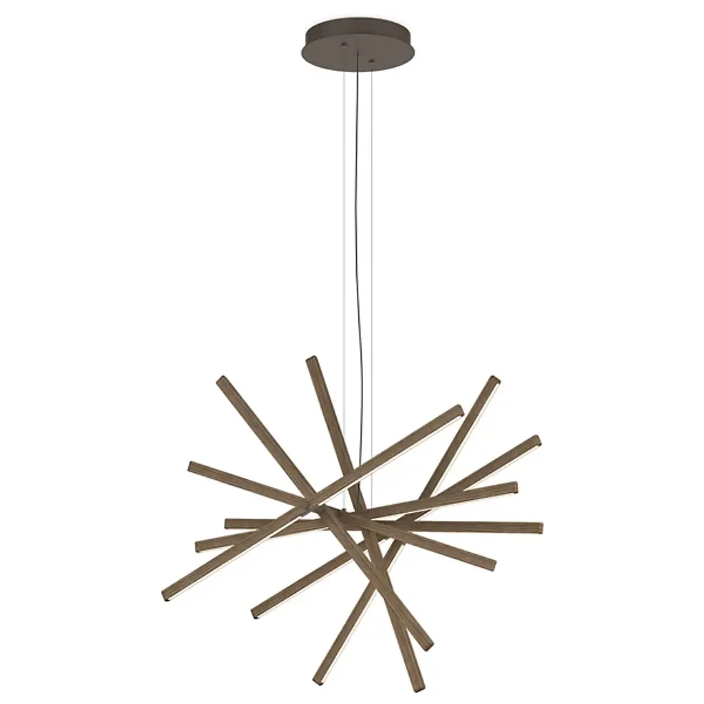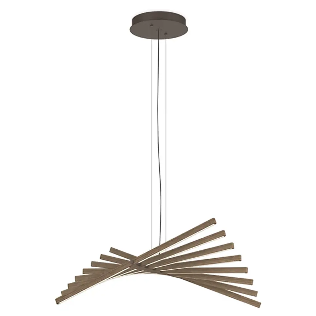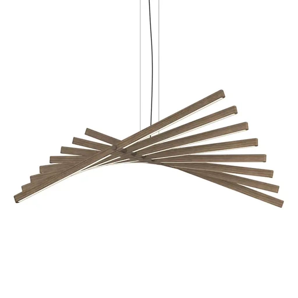 The Rhythm Wood LED Pendant from Vibia adds a striking, sculptural appeal to inside ceilings. A vibrant design from Arik Levy, it’s made in Spain and leverages its adaptability, sending out wood beam housings along a central axis that are able to rotate at will. LED lamping is set inside the narrow end of each wood housing, pouring out a customizable ambiance around the adjustable fixture. The fixture can take on the characteristics of a smooth waveform or a chaotic abstract sculpture at will, while the natural woodgrain makes each fixture unique.