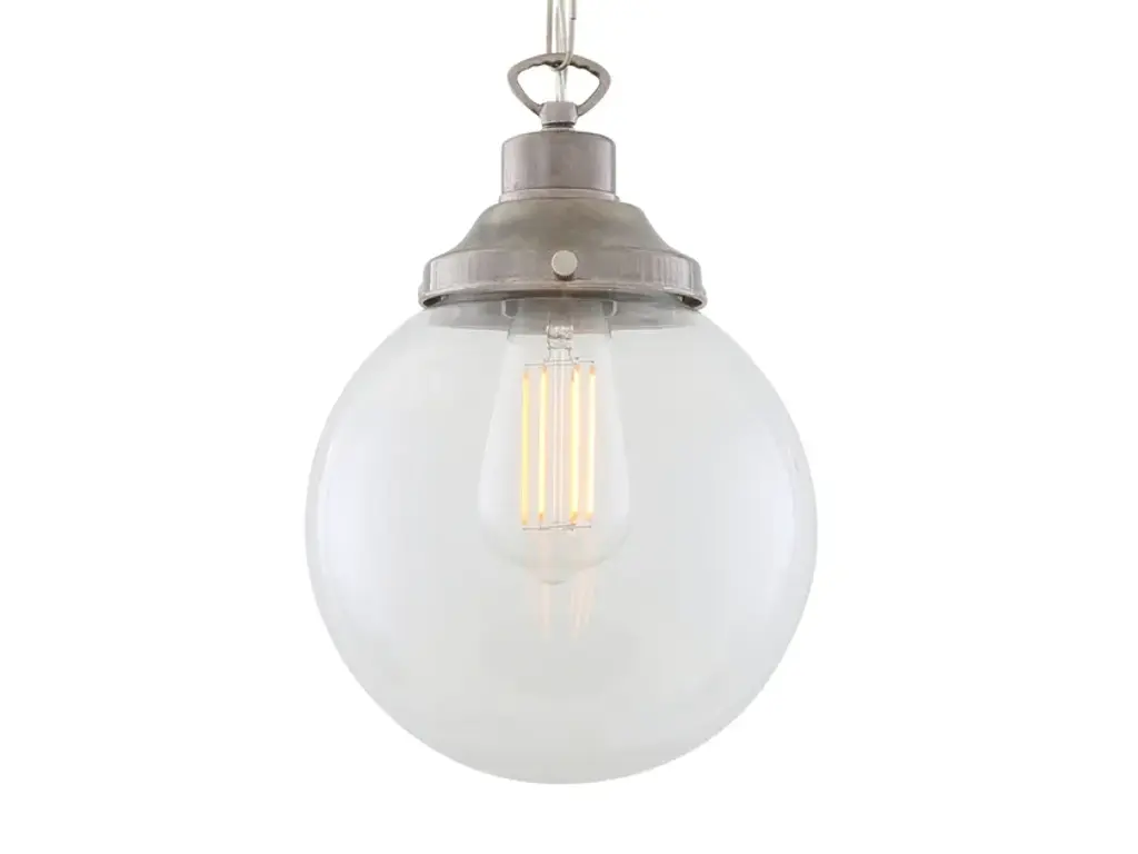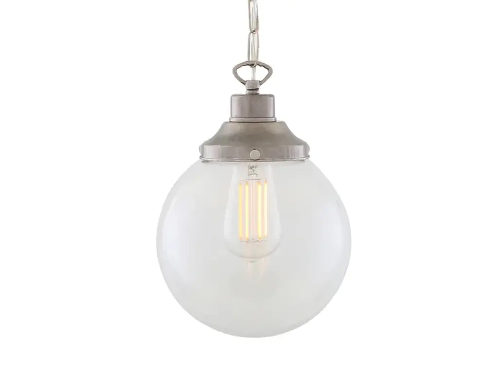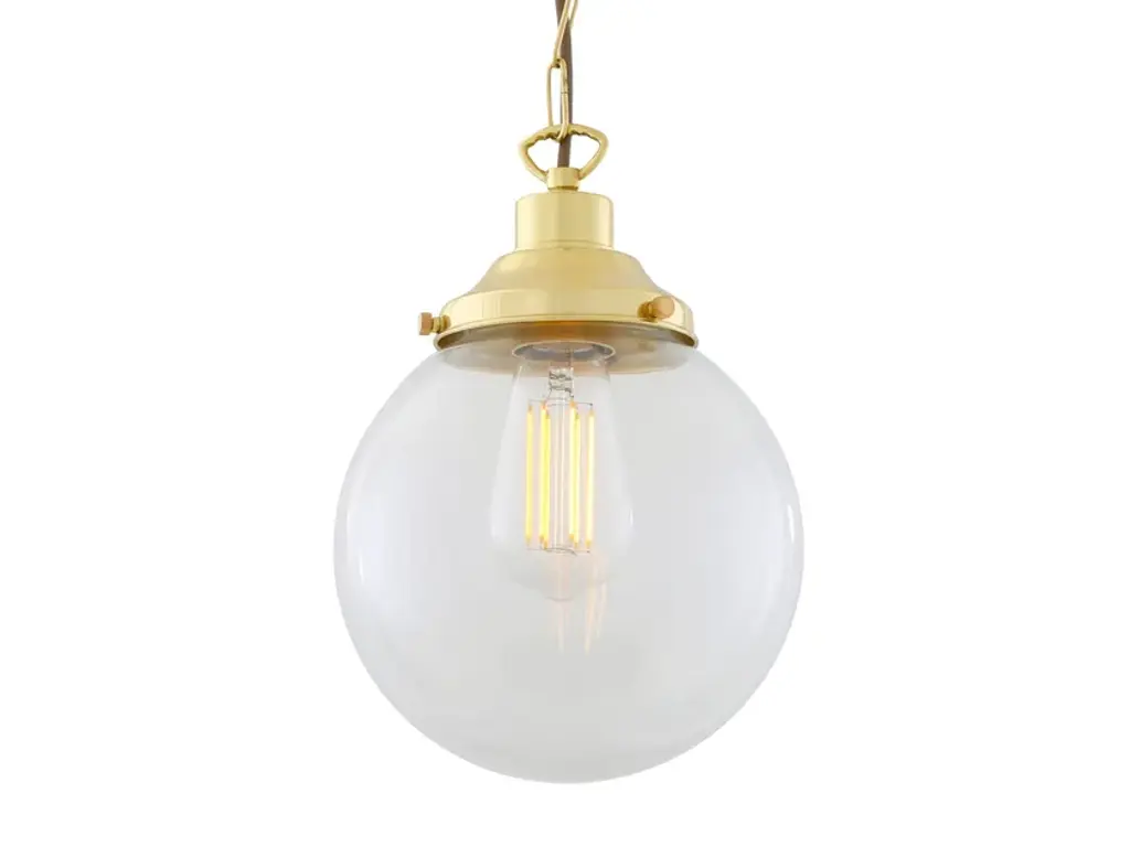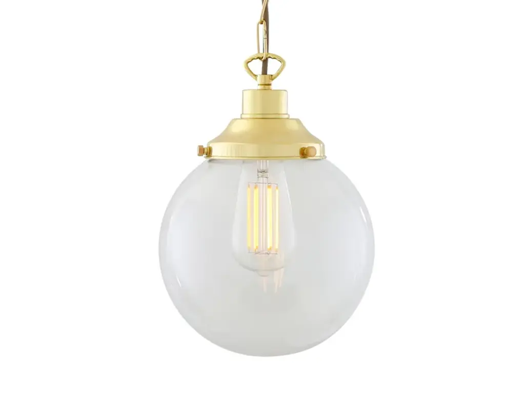 Evoking early 20th-century industrial lighting, the Riad 20cm Clear Globe Pendant retain the classic lines and exposed hardware of the originals. This globe pendant light is a simple design full of style with a modern industrial look for your kitchen, bar or restaurant. Suspended from a simple chain, hang it as individual pendant over a desk or kitchen work space or cluster several together for a more modern look.Suitable for any minimalist or industrial interiors, this glass pendant light looks fantastic when lit with an Edison squirrel cage bulb for a soft lighting. Bulbs are sold separately.Product Weight: 0,8 kg / 1.8 lbCE Approved: YesUKCA Approved: YesCeiling Rose: MLROSE05 | 10cm DiameterGlass Code: GL131IP Rating: IP20Lampholder: E27 | Plastic | ES | Edison ScrewMaterial: Brass, GlassMax Wattage: 60WProtection Class: Class IStandard Cable/Chain Length: 100cmVoltage: 110/120V or 220/240V (depending on delivery location)