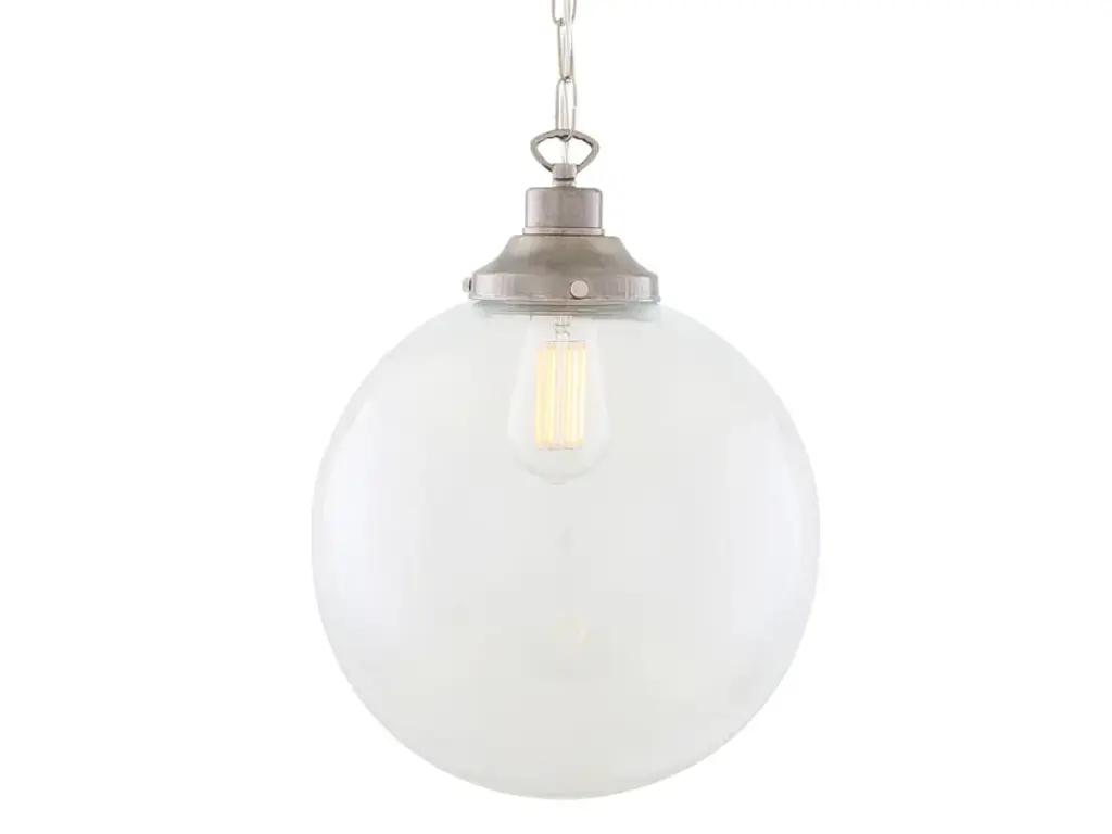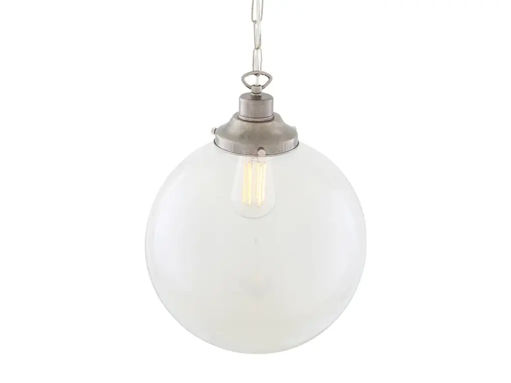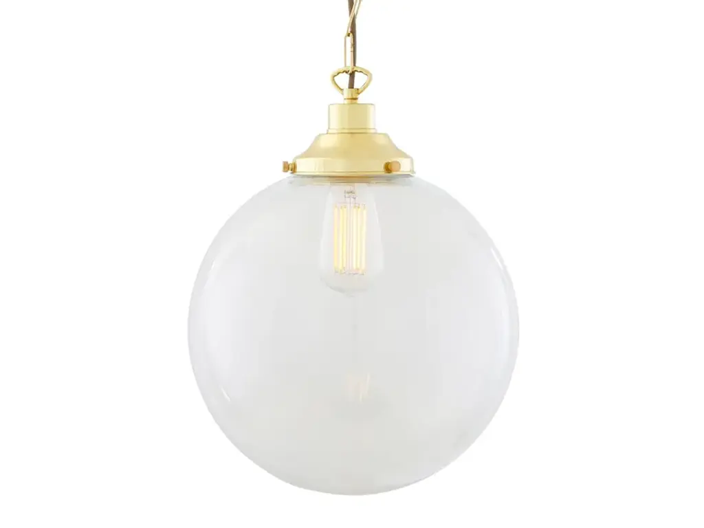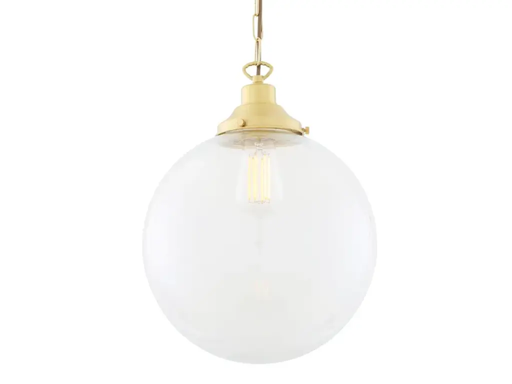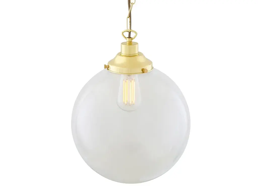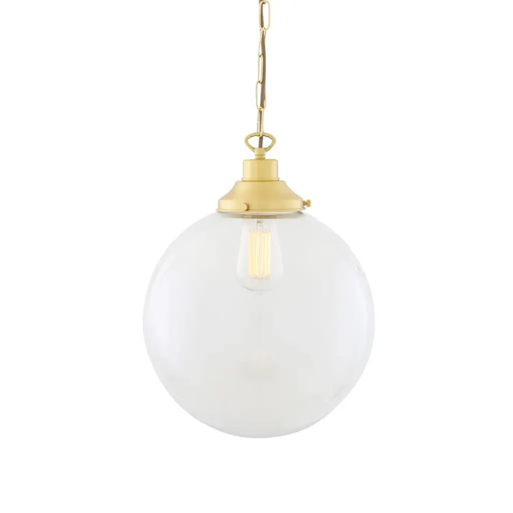Evoking early 20th-century industrial lighting, the Riad 30cm Clear Globe Pendant retain the classic lines and exposed hardware of the originals. This globe pendant light is a simple design full of style with a modern industrial look for your kitchen, bar or restaurant. Suspended from a simple chain, hang it as individual pendant over a desk or kitchen work space or cluster several together for a more modern look.Suitable for any minimalist or industrial interiors, this glass pendant light looks fantastic when lit with an Edison squirrel cage bulb for a soft lighting. Bulbs are sold separately.Product Weight: 2,1 kg / 4.6 lbLight Bulb Base: E27CE Approved: YesUKCA Approved: YesCeiling Rose: MLROSE05 | 10cm DiameterGlass Code: GL136IP Rating: IP20Lampholder: E27 | Plastic | ES | Edison ScrewMaterial: Brass, GlassMax Wattage: 60WProtection Class: Class IStandard Cable/Chain Length: 100 cmVoltage: 110/120V or 220/240V (depending on delivery location)