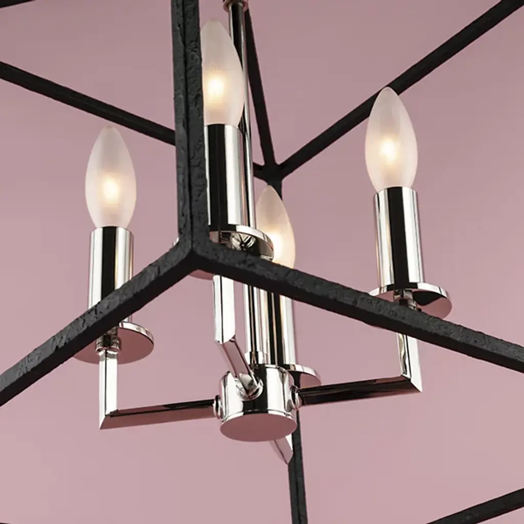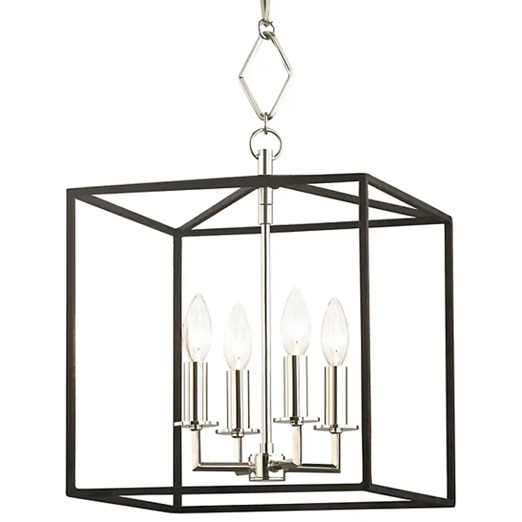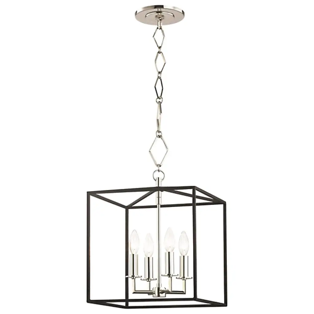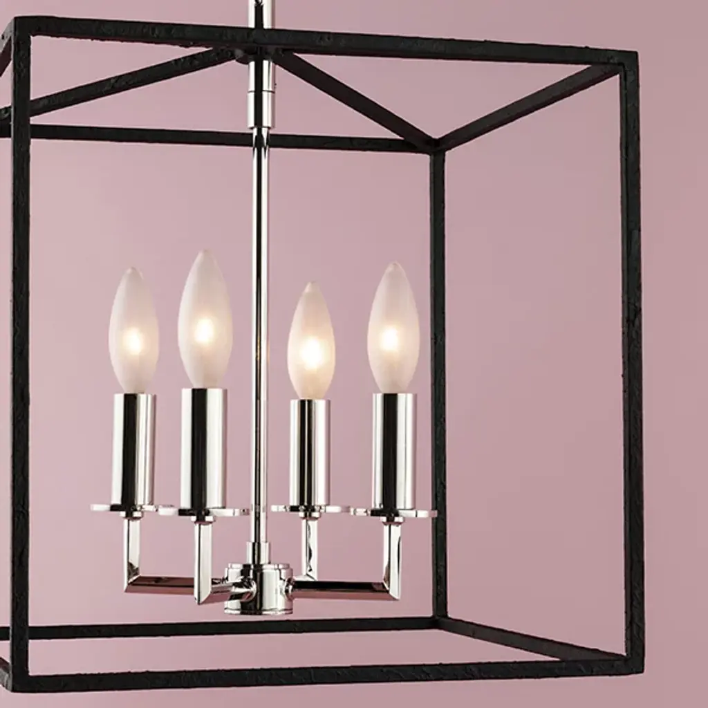 Geometry lights the way in subtle sophistication. The Richie Pendant by Becki Owens for Hudson Valley Lighting is the perfect mix of coastal industrial styling in a breezy minimalist design. Crafted from Metal, it features an openwork cube-shaped cage framing the angled-up candelabra base. The round bobeches juxtapose the sharp angular composition, inviting the laidback elegance of candlesticks to the occasion. A versatile design with universal appeal, this symmetric ceiling mount light offers a breezy geometric aesthetic to a modern dining room or kitchen eating nook and brings warm ambient illumination to a master bedroom, foyer or lofty staircase.