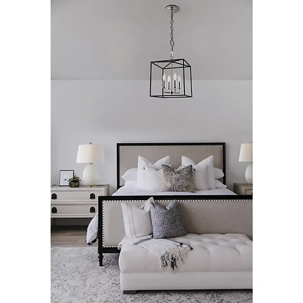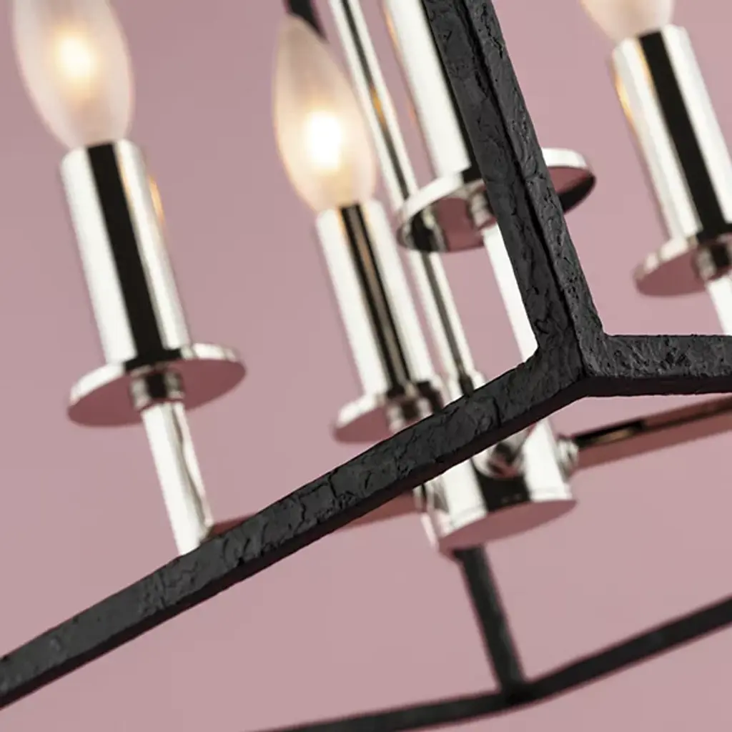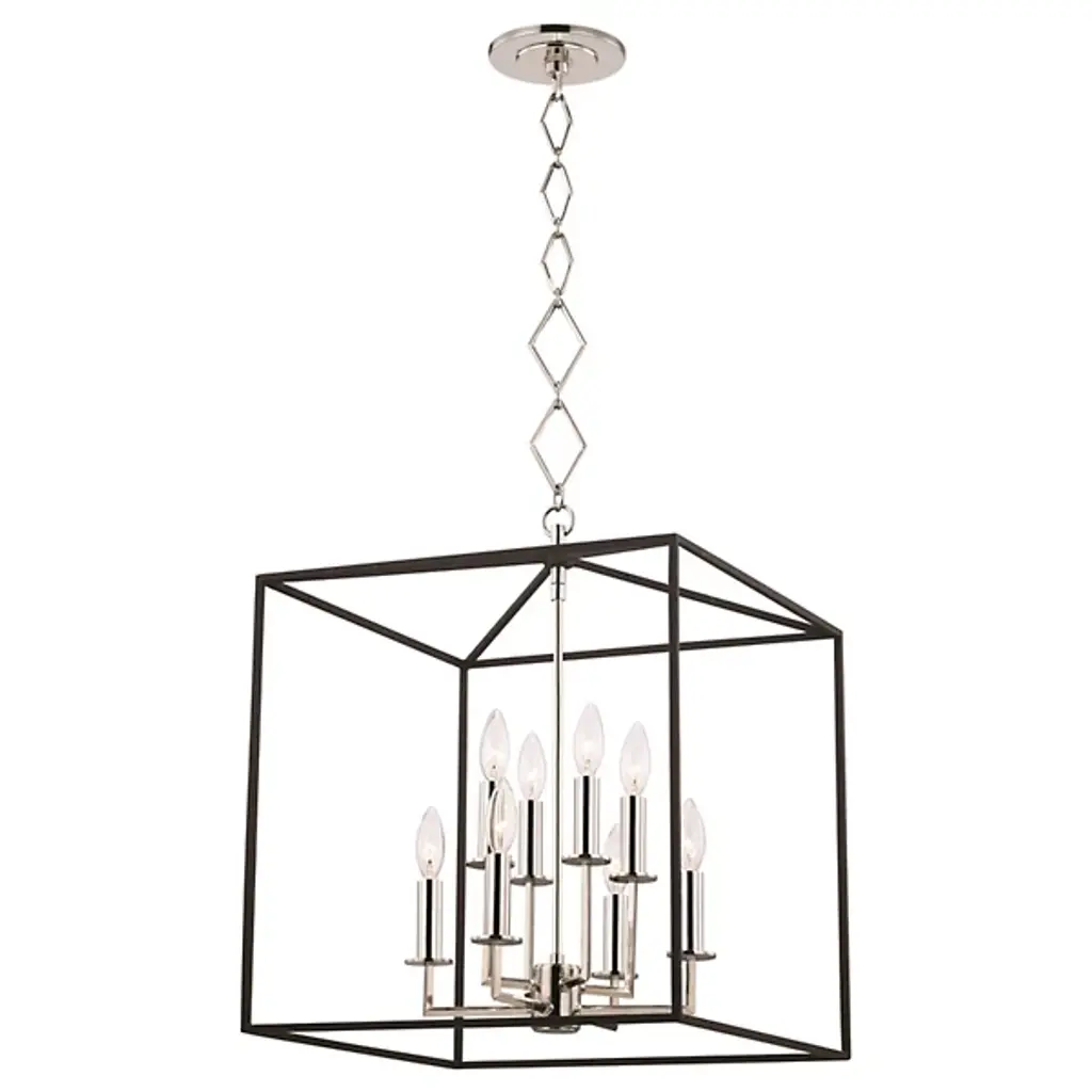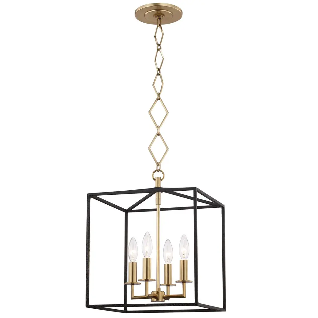 Geometry lights the way in subtle sophistication. The Richie Pendant by Becki Owens for Hudson Valley Lighting is the perfect mix of coastal industrial styling in a breezy minimalist design. Crafted from Metal, it features an openwork cube-shaped cage framing the angled-up candelabra base. The round bobeches juxtapose the sharp angular composition, inviting the laidback elegance of candlesticks to the occasion. A versatile design with universal appeal, this symmetric ceiling mount light offers a breezy geometric aesthetic to a modern dining room or kitchen eating nook and brings warm ambient illumination to a master bedroom, foyer or lofty staircase.