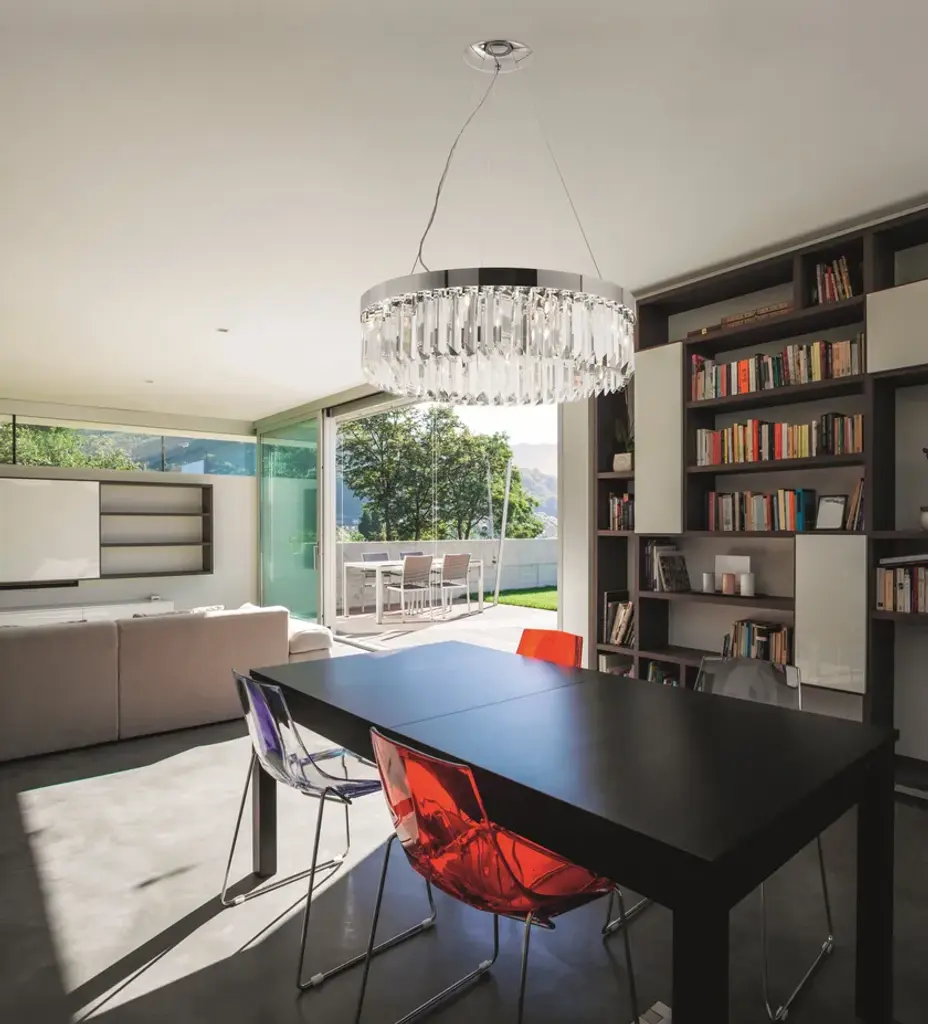 Light source: 8 x G9 / 10 x G9 / 12 x G9 halogen energy saving - 8 x G9 / 10 x G9 / 12 x G9 LED bulbs.A precious, clean and modern line with antique shades, a bright and particularly shiny crystal wrapped in a metal band, a perfect marriage between design, beauty and quality; a bright spot that conveys value, style, and uniqueness to every ambient it is added to.Available finishes: Polished chrome, Tortora, Brushed Burnished.
