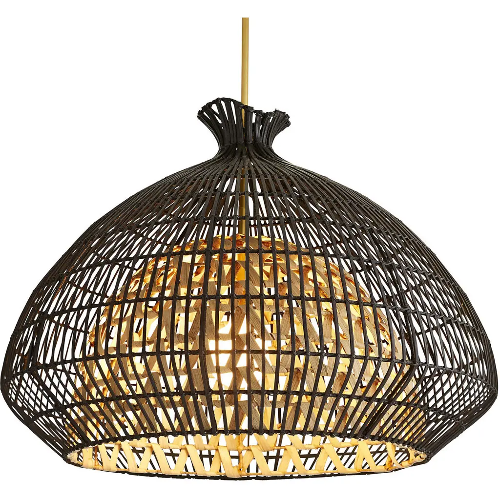 Svelte. Sleek. Sophisticated. This large-scale pendant brings romantic and moody light to a space while showcasing its own curvy and sultry style. It's built with two layers; the interior form is made of naturally finished woven rattan slats on a metal frame and the outer shade is woven with rattan core strips that are finished in black. The top flair has an organic wavy edge recalling the look of a pomegranate or vintage dress form. Additional pipe available (PIPE-101).