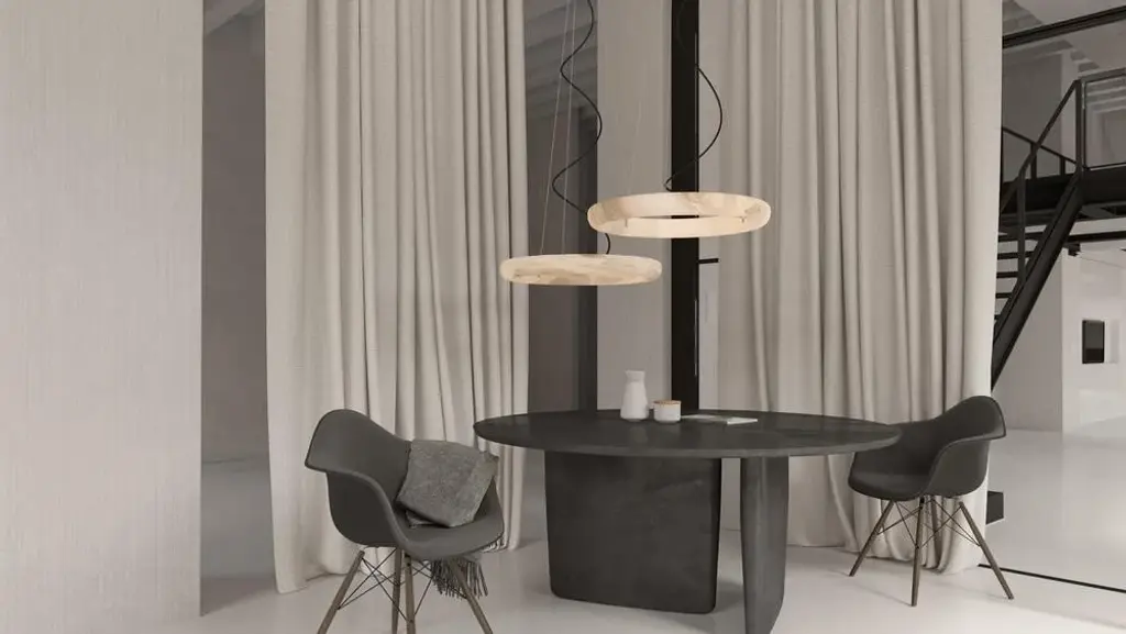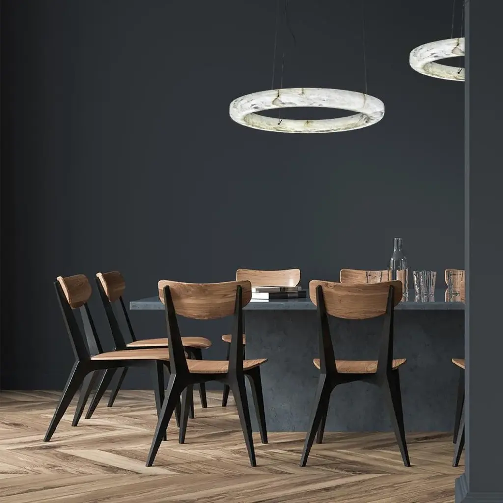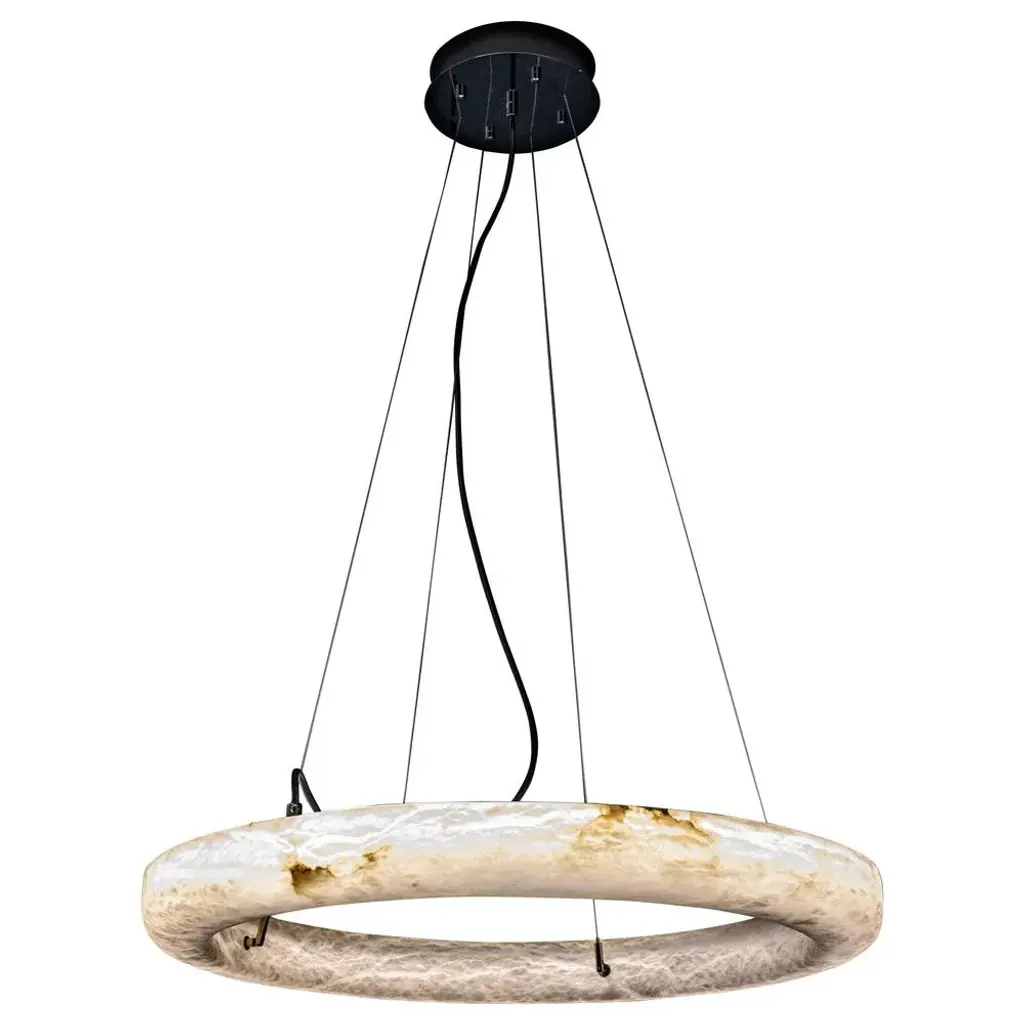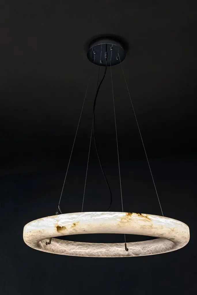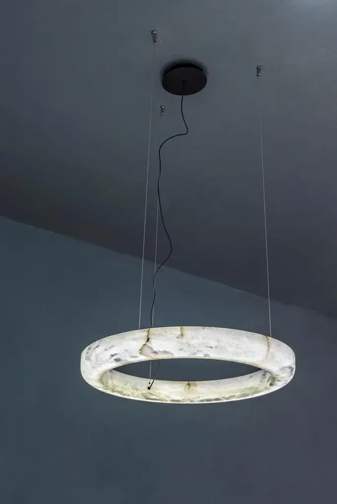 Ring 100 pendant lamp by united alabaster dimensions: d 100 x h 200 cm materials: alabaster all our lamps can be wired according to each country. If sold to the usa it will be wired for the usa for instance. A suspended alabaster ring with a minimalist structure, fully illuminated to appreciate all the details of each unique piece. This model of ring suspension lamp has height-adjustable suspension cables. Dimmable. Create a unique lighting by joining several luminaires, with which a great decorative effect is achieved with quality light. The lamp designed in alabaster has different configuration possibilities, being able to choose the finish of the ceiling base and the size of the luminaire. Give your space a unique lighting design with this ring pendant lamp model designed by joan casanyes. up to 250v (europe/uk standard).
