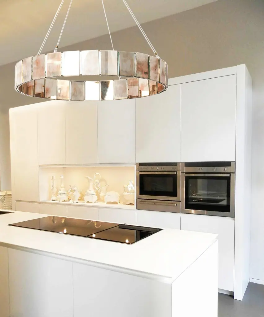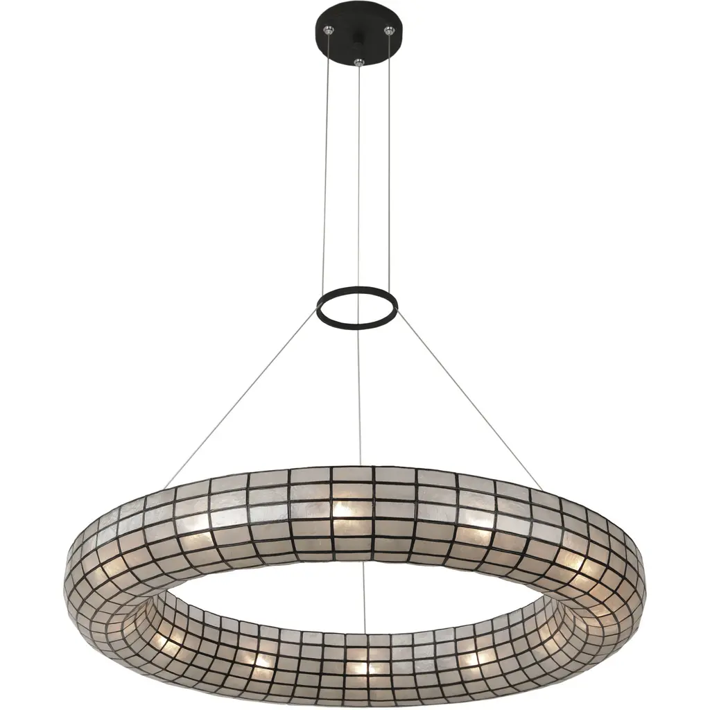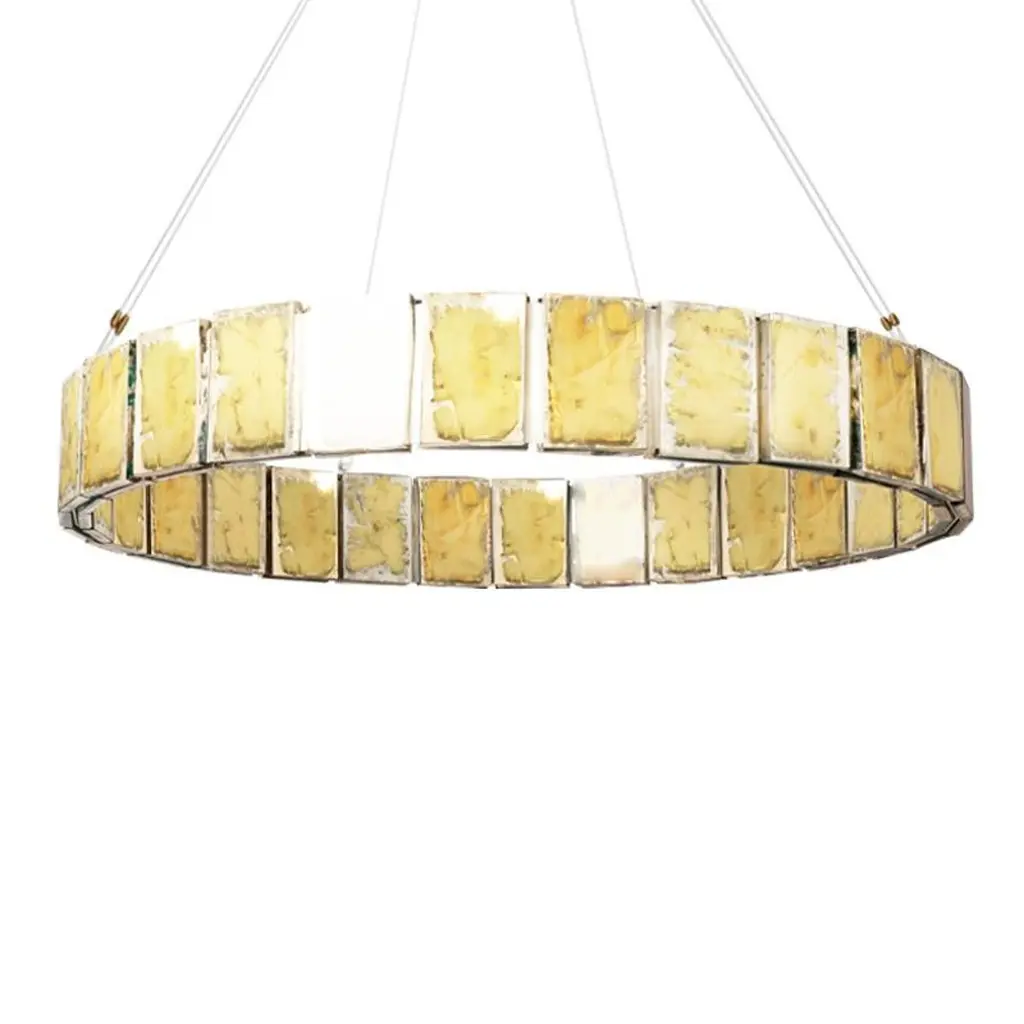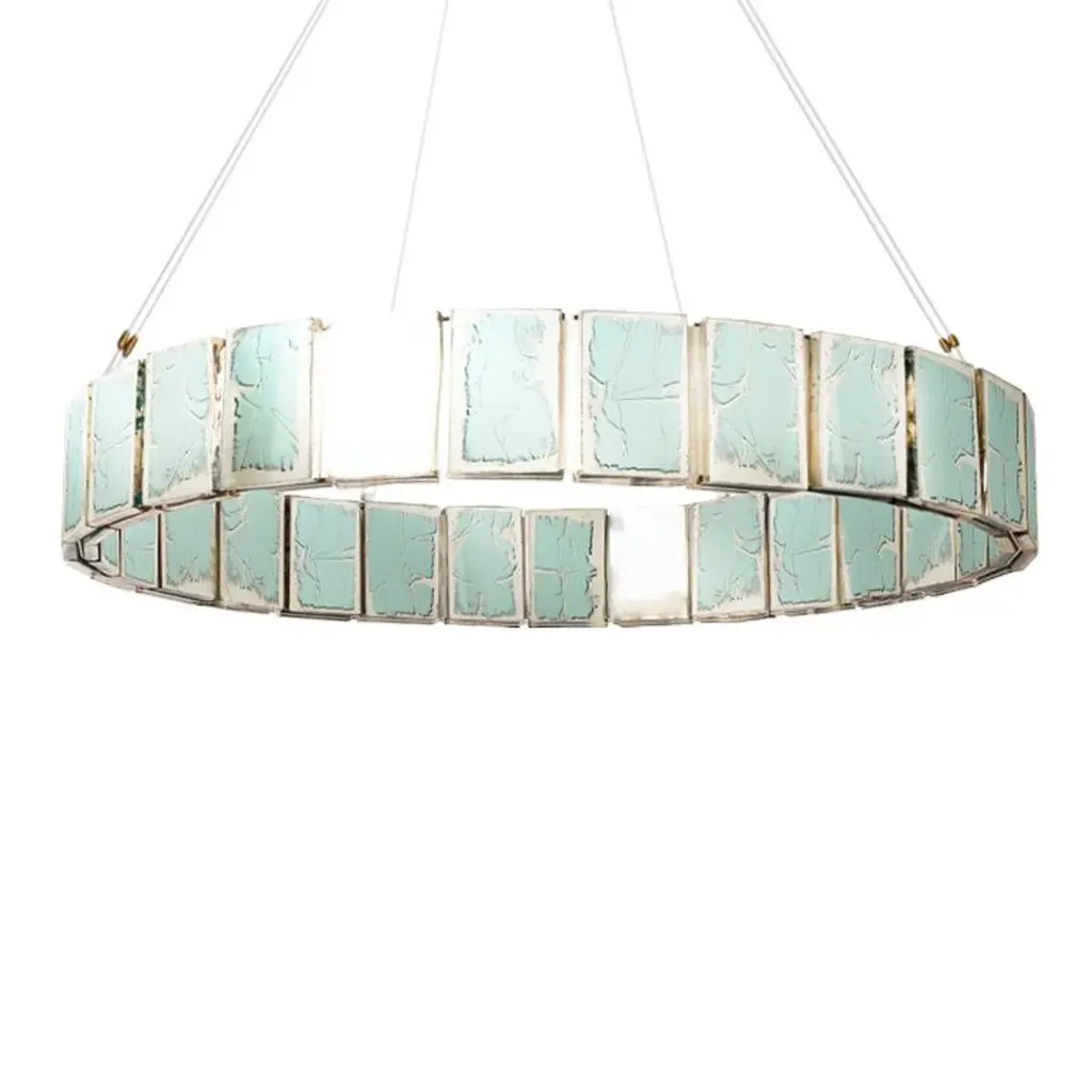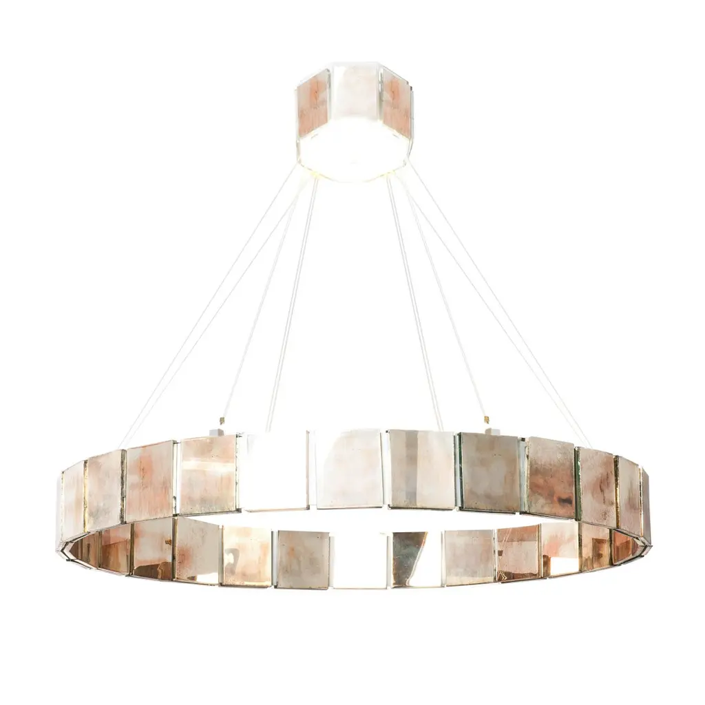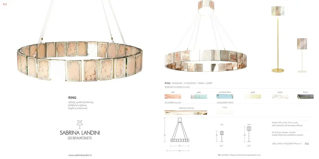RINGInfinity, symbol of eternity Welcome to the brilliant new Gem at home!More than just a pendant lamp, Sabrina Landini’s Ring embodies a symbol of eternity while retaining all its modernity.Expertly crafted in silvered glass slabs, like hand-set colored diamonds, our Ring pendant echoes the solitary wedding ring. Suspended from an invisible link cable, this design uses negative space to make the ultimate statement.Echoing the antique charm of estate jewels, the micropavé pendant lamp shines with a breathtaking round diamond light center set in a geometric multi facet canopy.Ring is the fiery expression of love. A striking center light source surrounded by silvered glass tiles, like set diamonds, that gather light into the diamond, magnifying its brilliance. Celebrate the promise of together ever after with exquisite engagement “Ring” by Sabrina Landini. No one enjoys a love story more than we do. Make it an unforgettable!Customizable clear cable Lenght on requestAvailable in a wide range of silvered glass colors :Sabrina's silvering, jade, sun, black, white, smoky grey, aquamarine, roseCE certified and Electrified : US, EU, UK , 1x16W led flat bulbs, dimmable