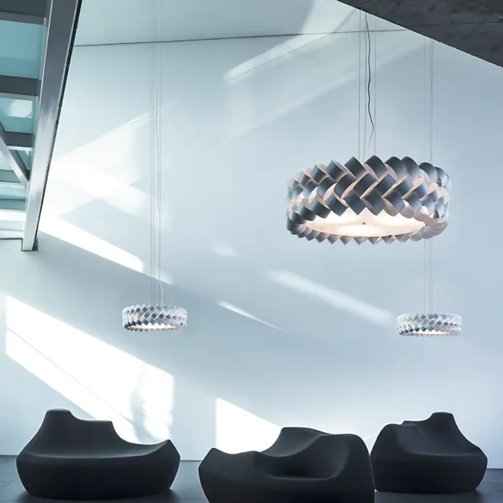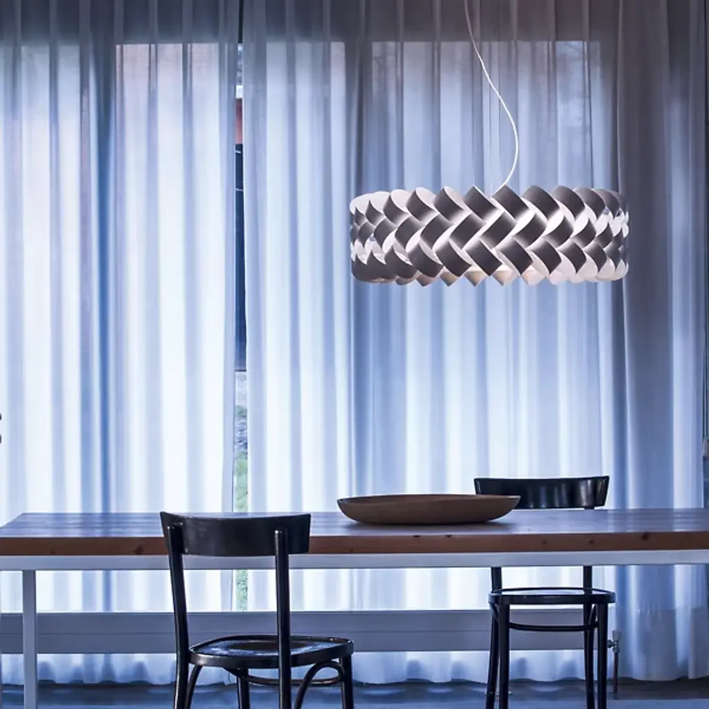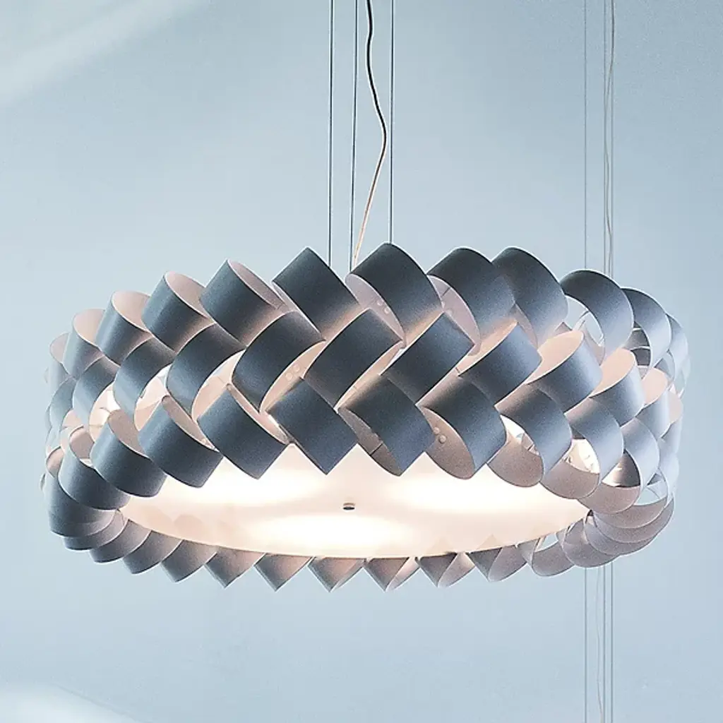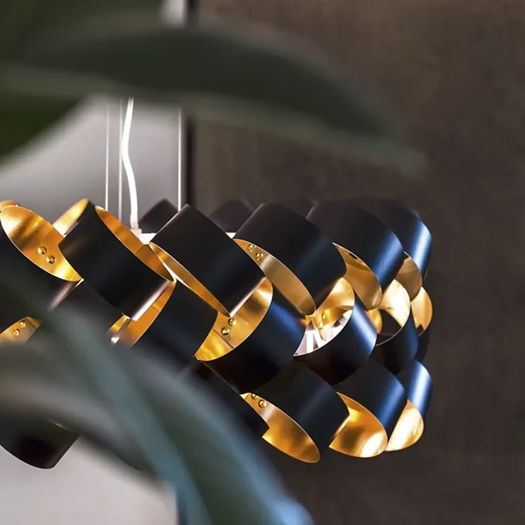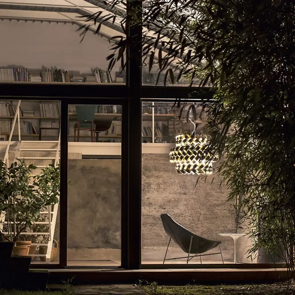 Give a golden glow to interiors with the subtle intricate lines of the Ring Mix Pendant Lamp from Pallucco. A subtle, memorable creation from Brian Rasmussen, their shape echoes their name, incorporating a series of woven rings descending via an array of evenly spaced cable to a single larger ring. This construction intrigues as much as it distributes light, forging a braid pattern burnished from within by the light, and contrasting ambiance with a central touch of downlight.