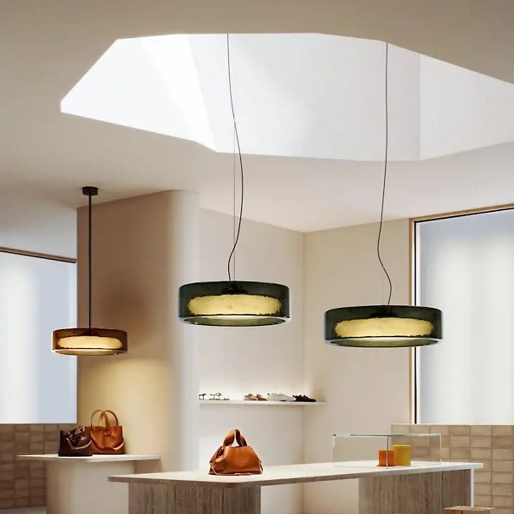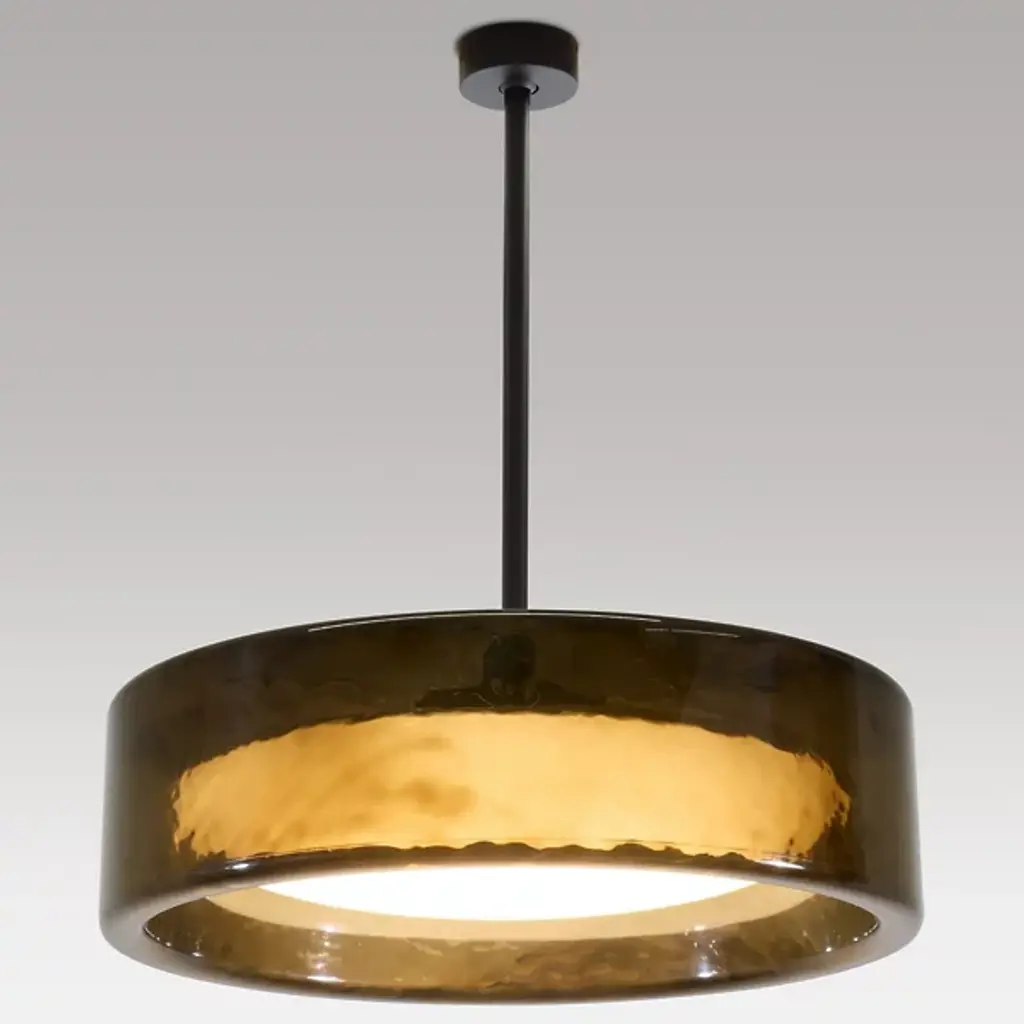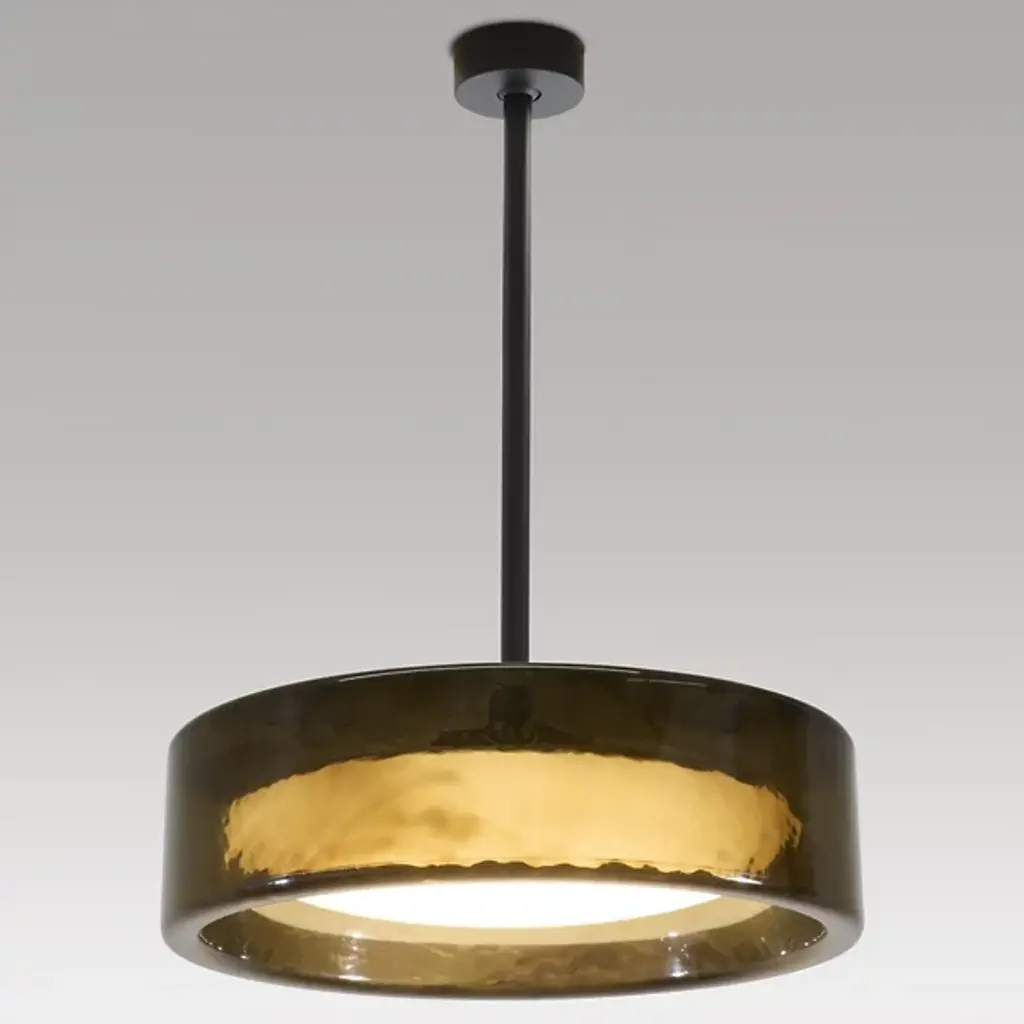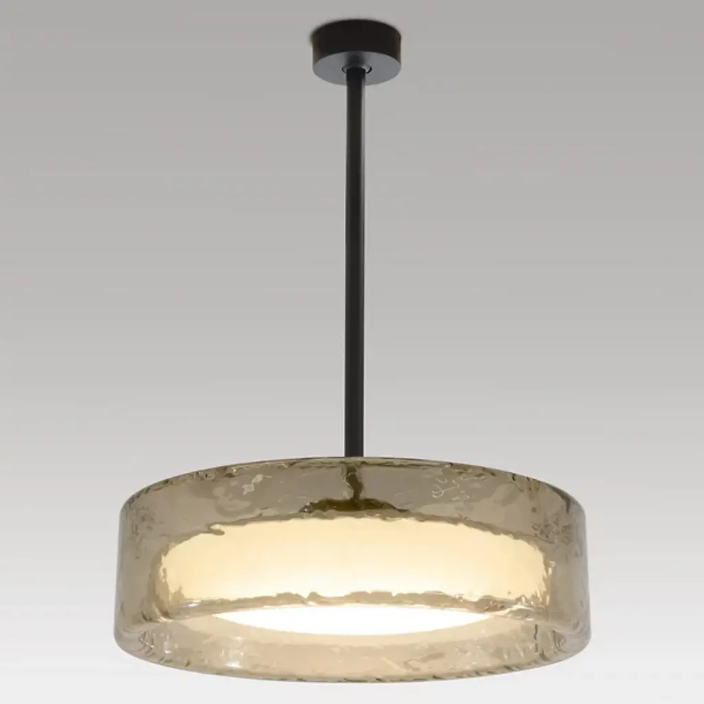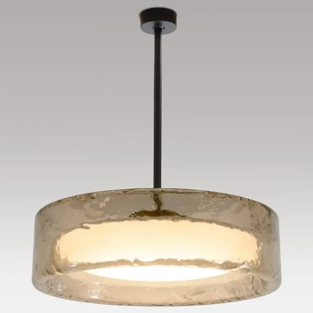 The Ringo LED Drum Pendant from Marset is a large, commanding fixture with precise and restrained artistry that centers light. Designed by Joan Gaspar and made in Spain, it expresses a design philosophy rooted in clarity and restraint. A slim stem suspends an efficient LED light, surrounded by a rotomoulded polycarbonate shade. The shade calls to mind the translucent structure of solid ice that refracts light from within. The fixture emphasizes simple geometry, creating a dialogue between form and light that is at once solid and weightless.
