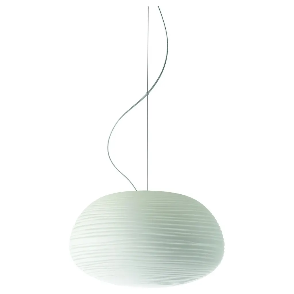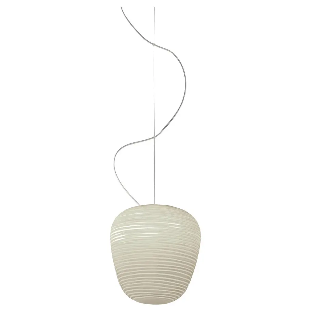 Rituals 3 is a pendant lamp made of blown engraved satin glass and varnished metal.LIGHT SOURCE220 / 240 VLED retrofit, Fluo 15WE27Halo 70WE27IP 20Not dimmableBulb not includedResembling the paper lanterns of oriental culture, but made with handcrafted blown glass with a pleasantly chalky appearance enhanced by slender incisions, in different and complementary forms. The horizontal lines are decorative but also filter the light, spreading its soft warmth into the room.
