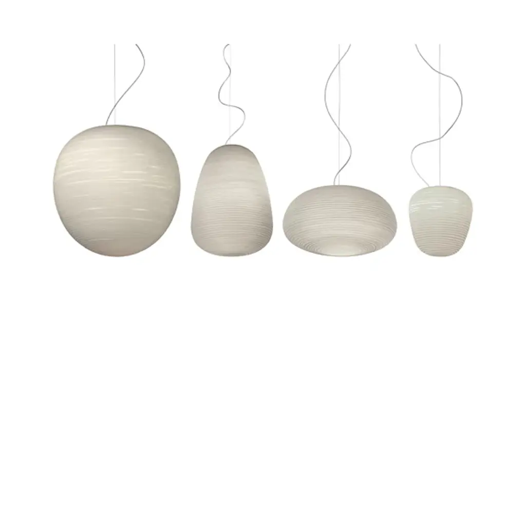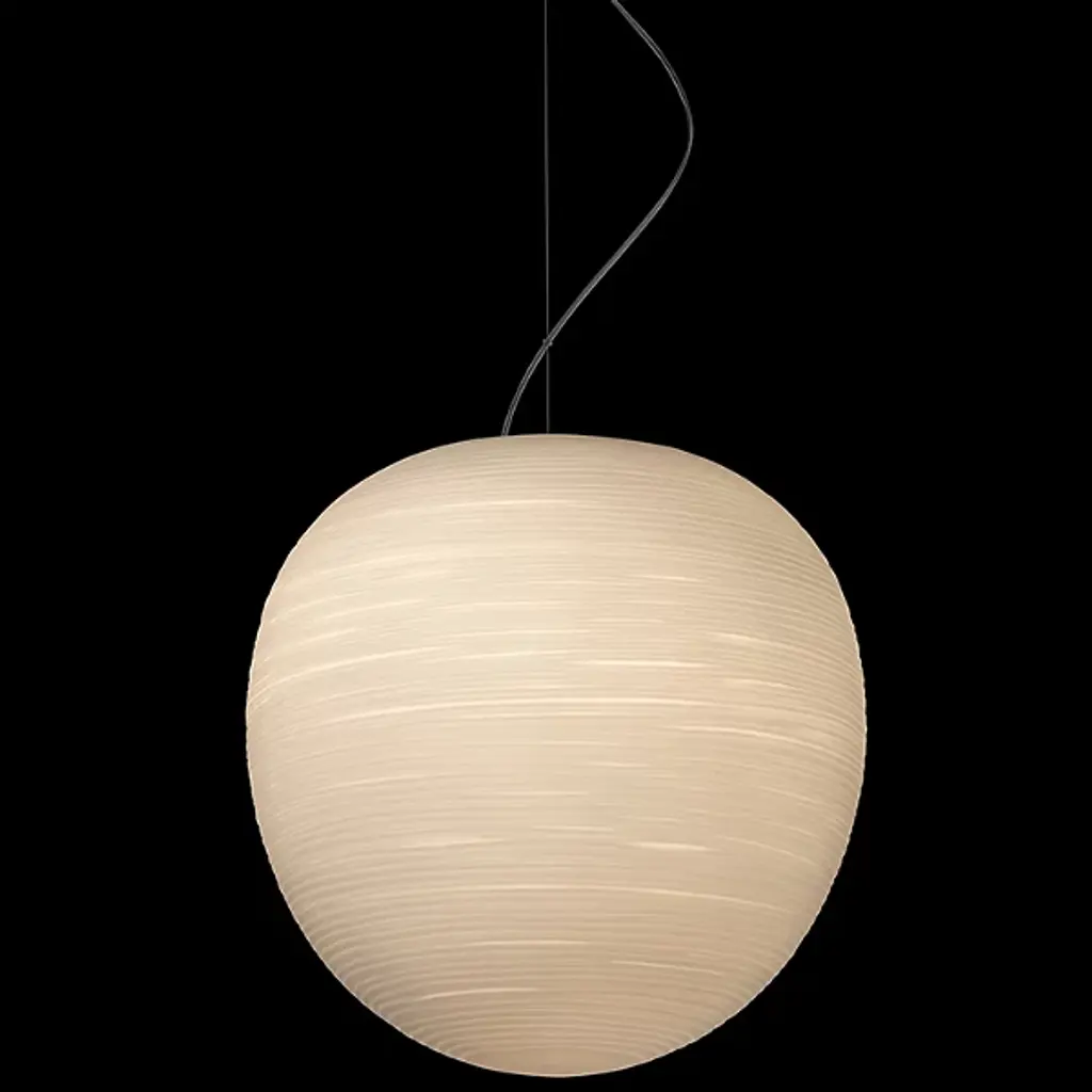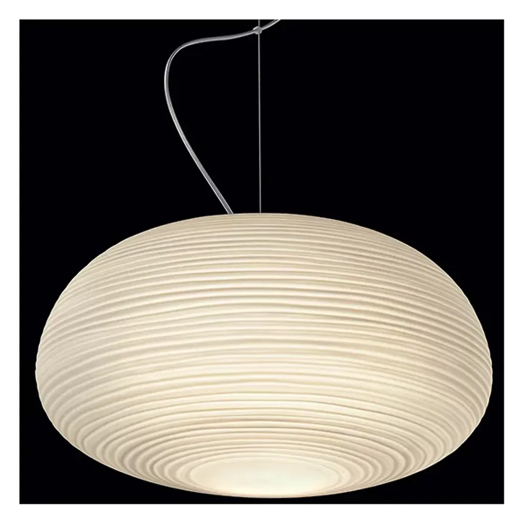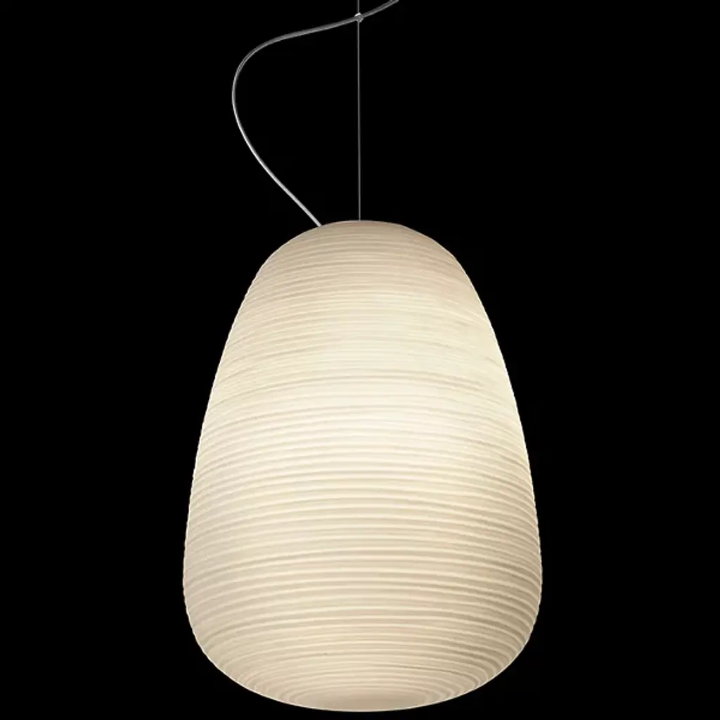The Foscarini Rituals XL Pendant is inspired by the texture of oriental rice paper lanterns but is actually created by a highly technical glass blowing process. The traditional Venetian blown glass has a profile with paper lantern folds created with a mold which is then translated to the surface of the glass. Immersing the glass in acid gives the chalky finish, diffusing the light subtly. The cocoon-like structure manages to be substantial yet delicate in the soft light it produces.