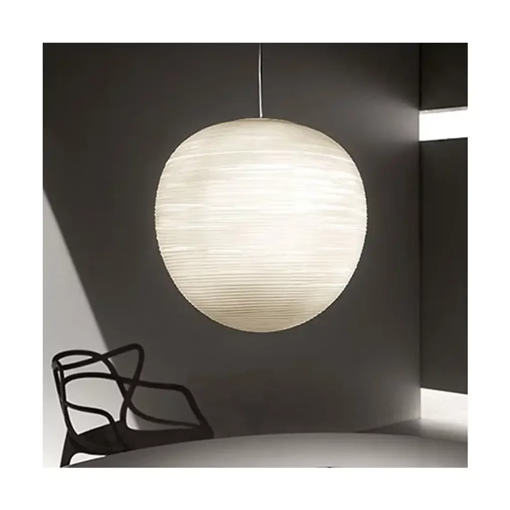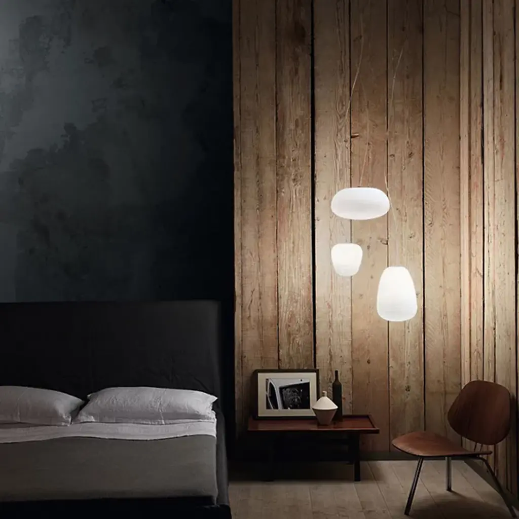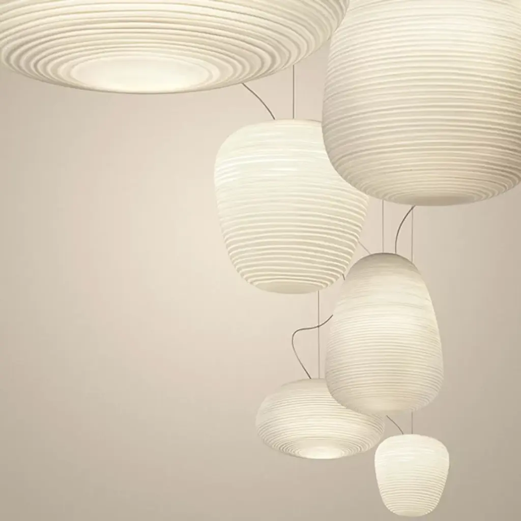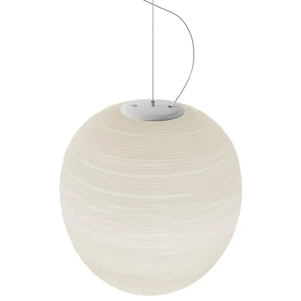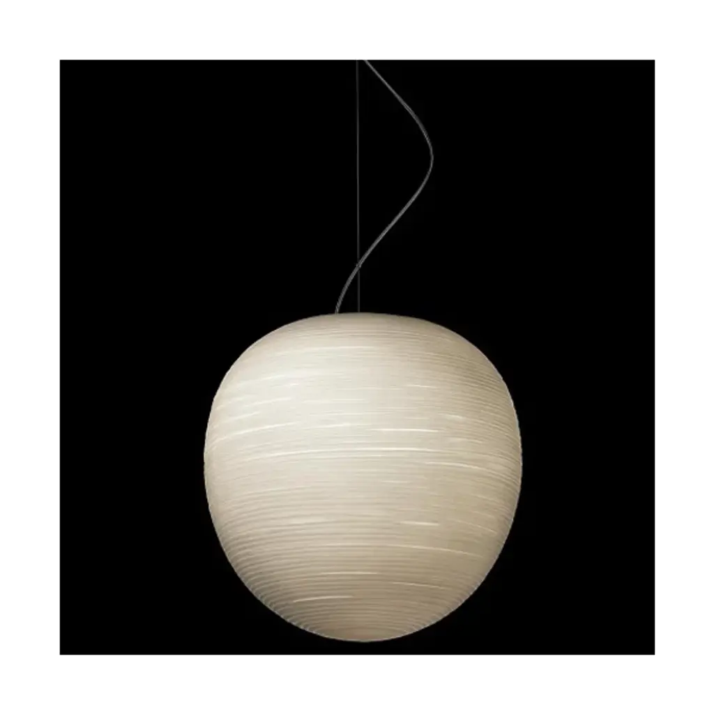 The Foscarini Rituals XL Pendant is inspired by the texture of oriental rice paper lanterns but is actually created by a highly technical glass blowing process. The traditional Venetian blown glass has a profile with paper lantern folds created with a mold which is then translated to the surface of the glass. Immersing the glass in acid gives the chalky finish, diffusing the light subtly. The cocoon-like structure manages to be substantial yet delicate in the soft light it produces.