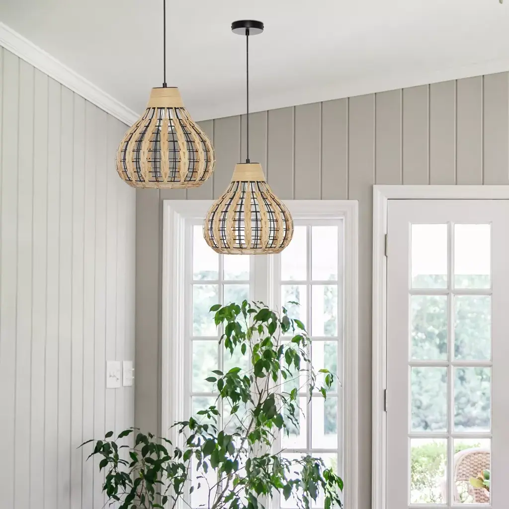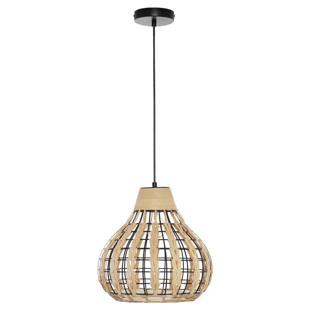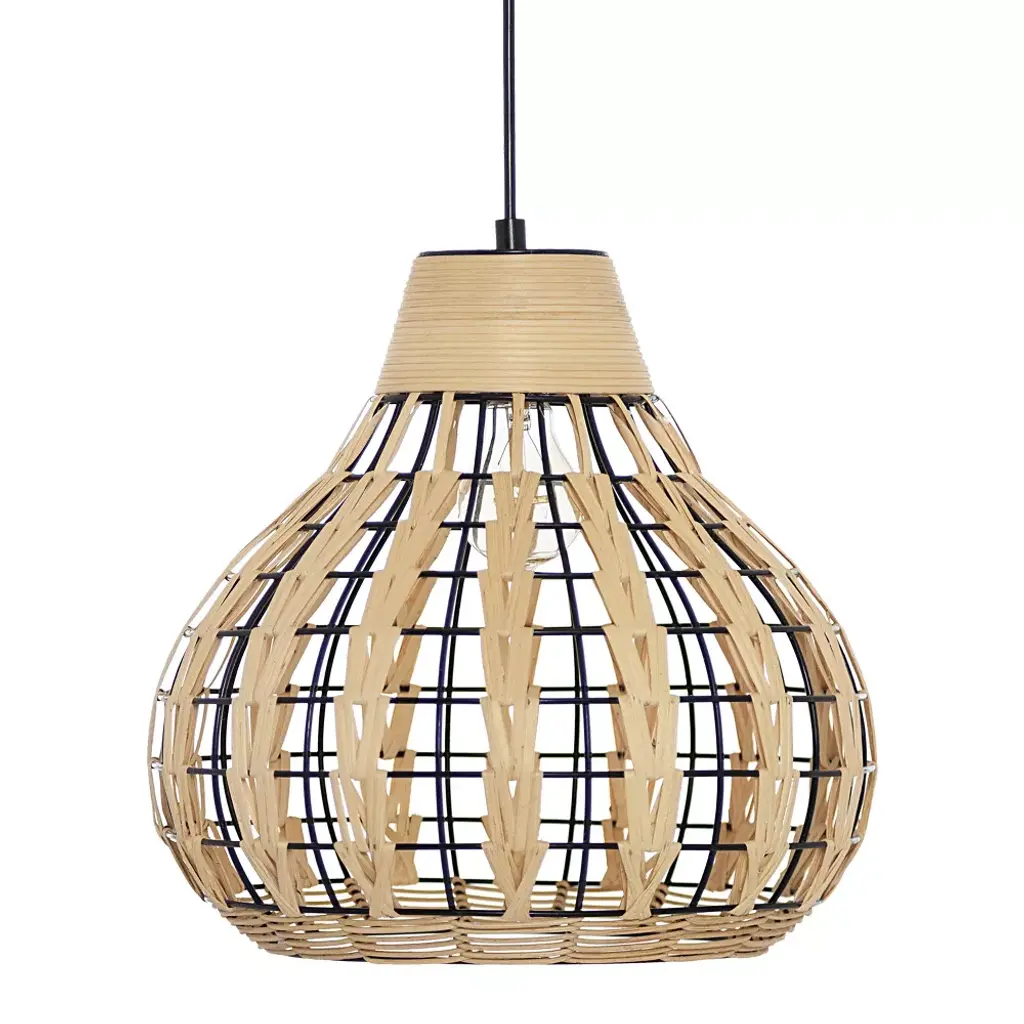The 13" W Charlene Metal Pendant Light with Rattan Shade from River of Goods will bring a Bohemian vibe to your favorite room. Featuring a black-painted circular metal fixture matched in style with a gourd-shaped black metal and tan rattan shade, this hanging pendant light adds a casual, relaxed vibe to a range of interior decor styles. The rattan shade's open weave design will create a glow when the single 60W bulb (not included) shines through. Thanks to its adjustable height design, you can install this pendant light directly into your ceiling at your ideal drop length between 15 and 63 inches.