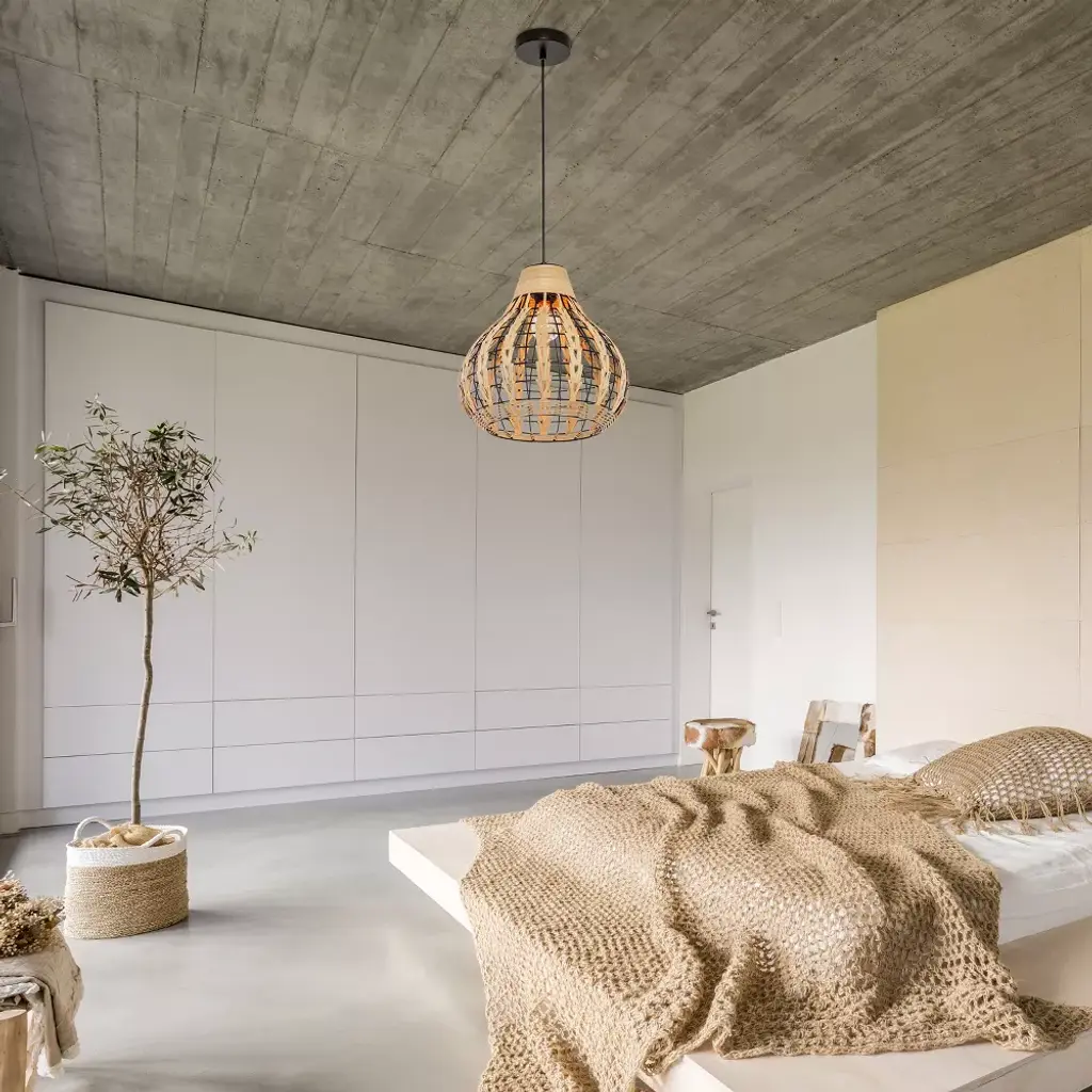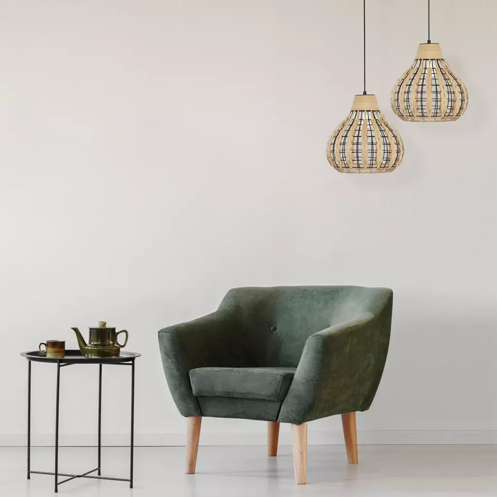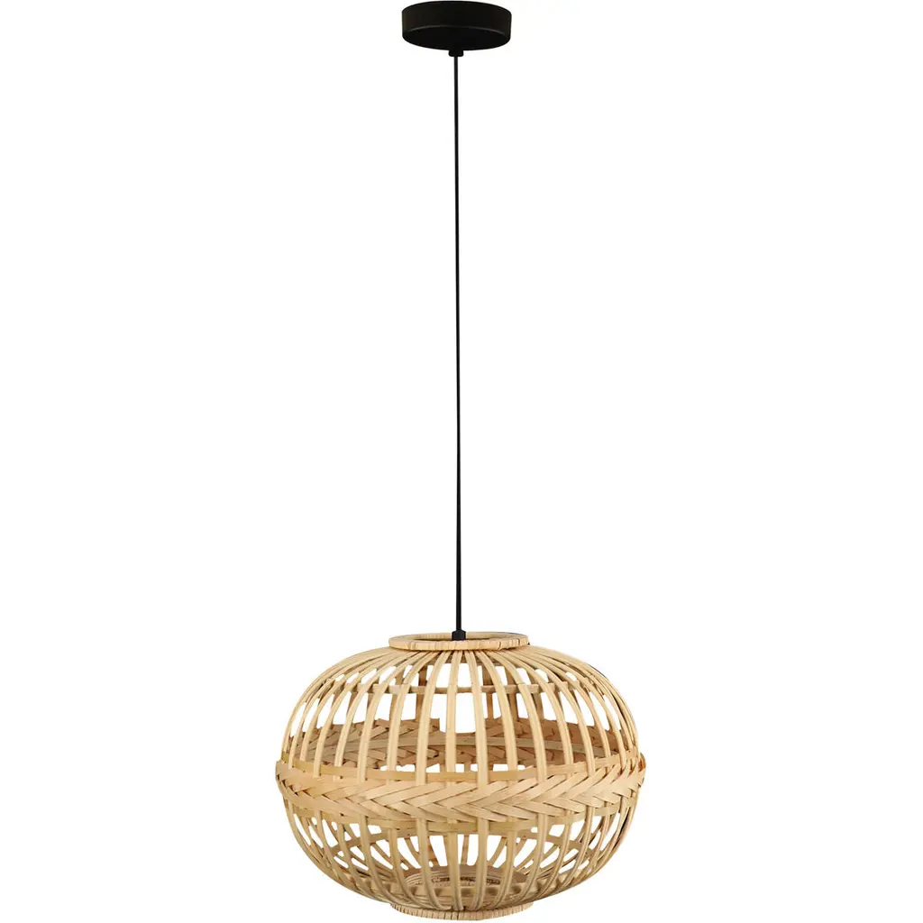 The 13" W Charlene Metal Pendant Light with Rattan Shade from River of Goods will bring a Bohemian vibe to your favorite room. Featuring a black-painted circular metal fixture matched in style with a gourd-shaped black metal and tan rattan shade, this hanging pendant light adds a casual, relaxed vibe to a range of interior decor styles. The rattan shade's open weave design will create a glow when the single 60W bulb (not included) shines through. Thanks to its adjustable height design, you can install this pendant light directly into your ceiling at your ideal drop length between 15 and 63 inches.