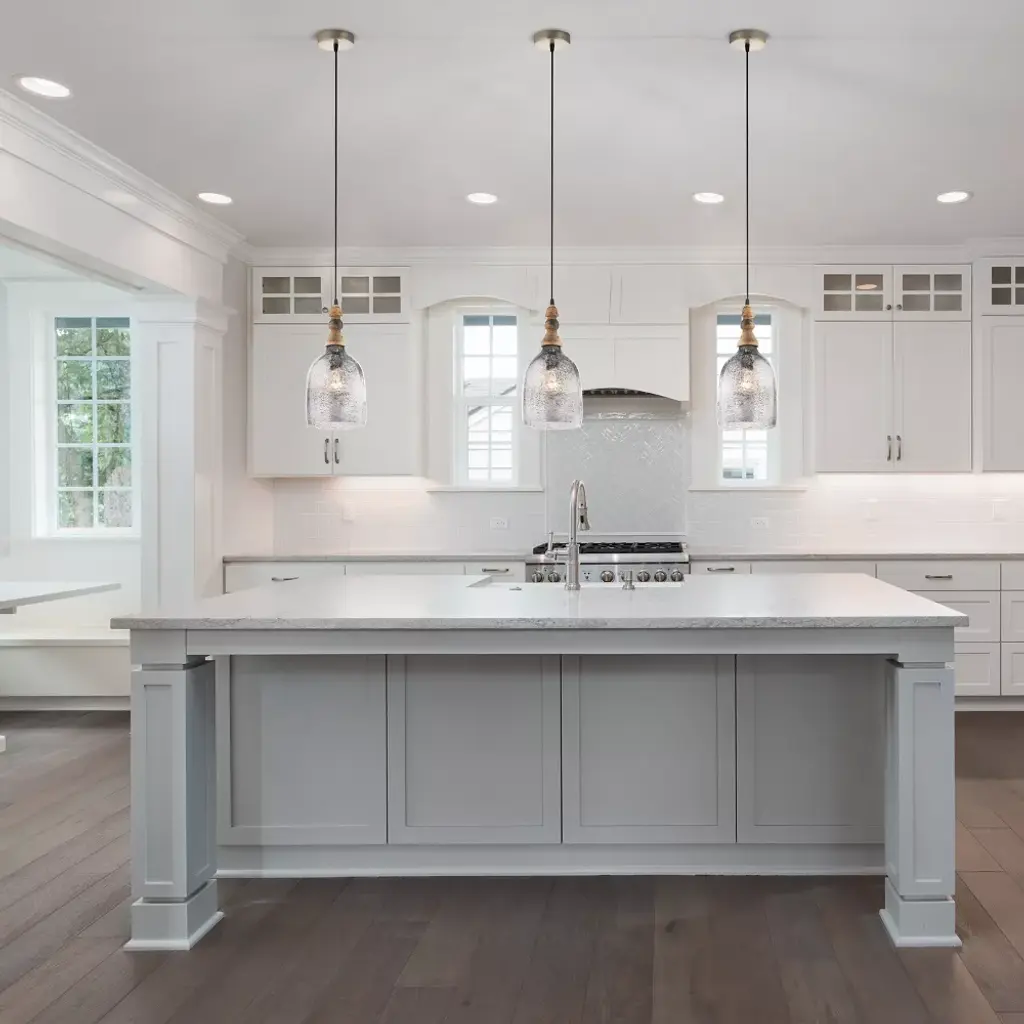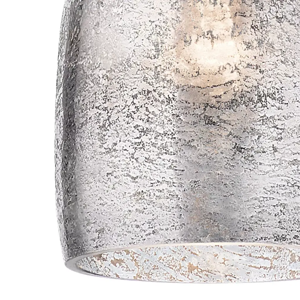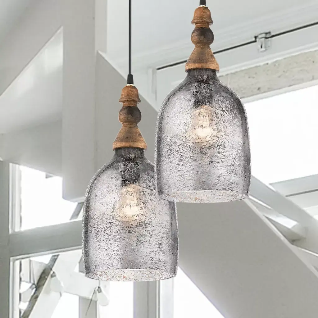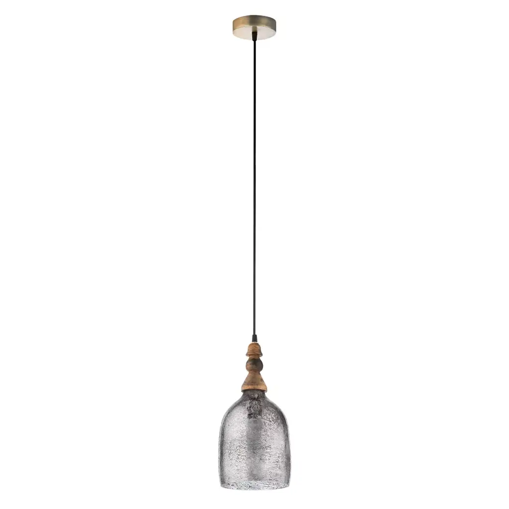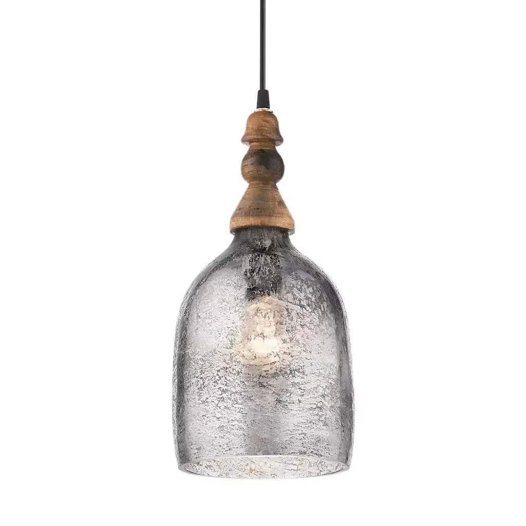 The 7" Coralie Textured Silver Glass Bell-Shaped Pendant Lamp from River of Goods will bring romance, style and sophistication to any room in your home. The 7-inch bell-shaped shade is crafted from silver-colored textured glass and secured into the unique, carved mango wood fitting, allowing light from a 40W E26 light bulb (not included) to show through. A magical addition to everything from a corner of your bohemian bedroom to illuminating a sitting area in a living room with a modern, contemporary vibe, its light is both beautiful and functional. Hardwire this pendant lamp into your ceiling for an adjustable-height installation.
