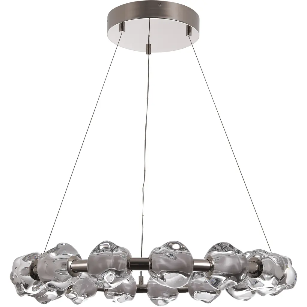 A riverbed of light. Stunning heavily-textured, clear poured artisanal glass in varying sizes are formed and shaped, then positioned on a round LED light-guide platform to stunning visual effect. Inspired by the cold icy streams of Vermont, adorned with ice-covered rocks and boulders, designer Andy Morter envisioned the Riverbed Collection to be like the frozen stones set along the rivers edge.