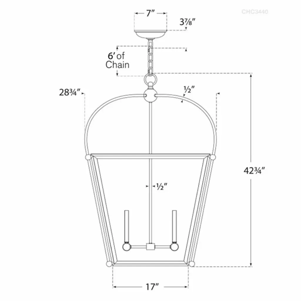 A modern farmhouse feel encompasses the Riverside Large Square Pendant from the popular brand Visual Comfort Signature, formerly known as Visual Comfort, The chain-link drops from the canopy and leads to an elegantly arched cage-type structure that wraps down and around the clear glass enclosure. A candelabra fixture within casts out generous lighting onto the surrounding surfaces. It’s an exquisite example of practical illumination intersecting with elevated design, resulting in a timeless look that would serve an array of interiors.