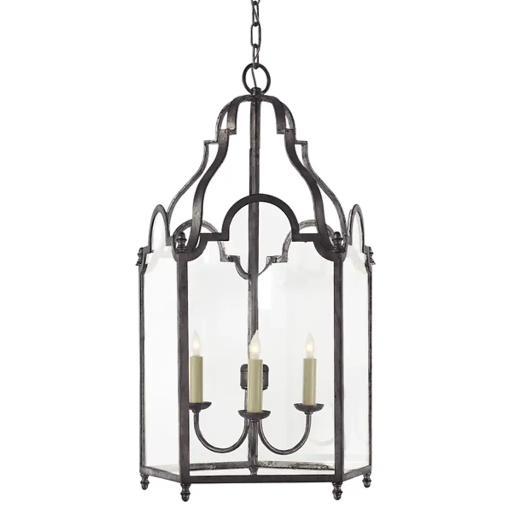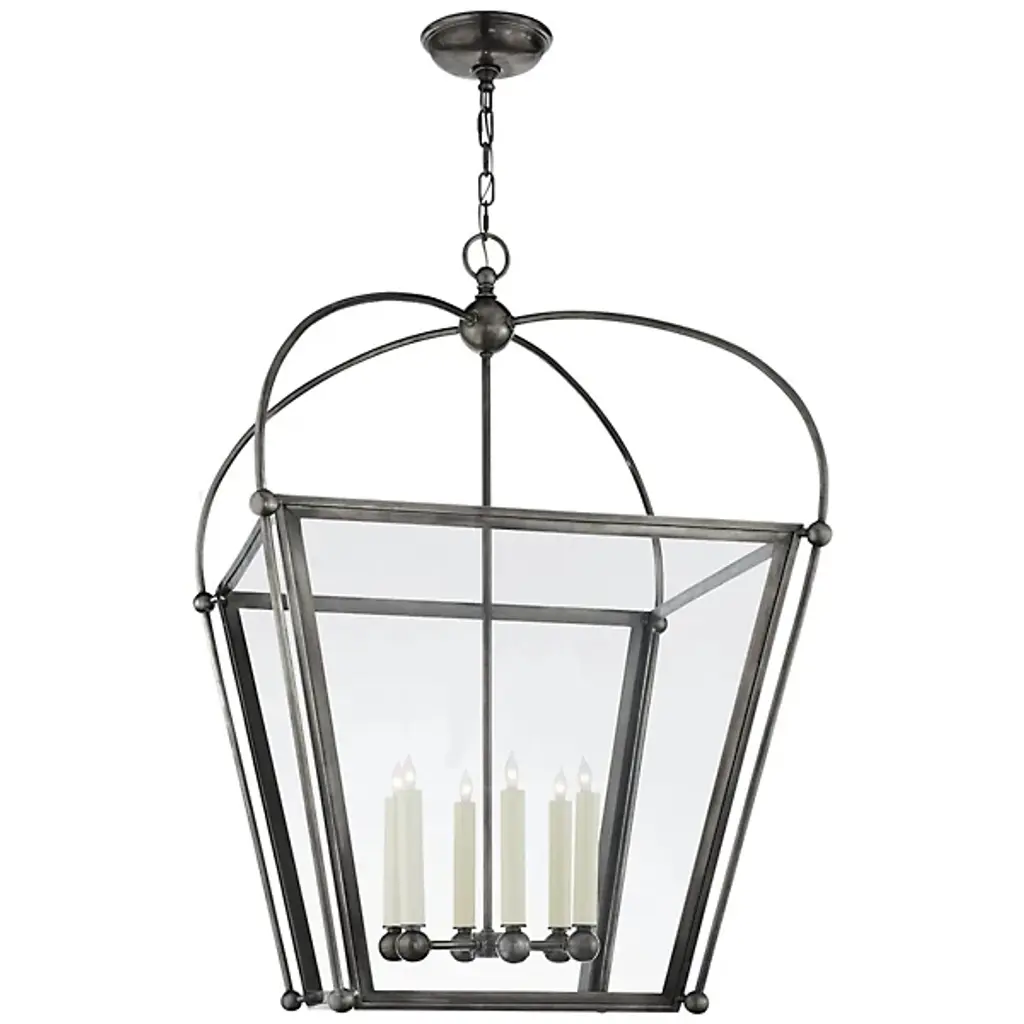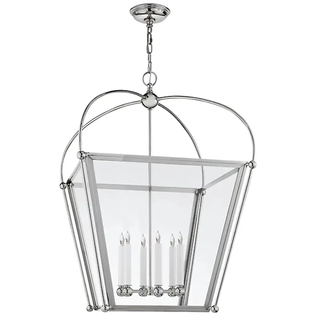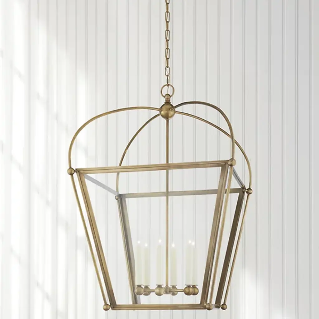 A modern farmhouse feel encompasses the Riverside Large Square Pendant from the popular brand Visual Comfort Signature, formerly known as Visual Comfort, The chain-link drops from the canopy and leads to an elegantly arched cage-type structure that wraps down and around the clear glass enclosure. A candelabra fixture within casts out generous lighting onto the surrounding surfaces. It’s an exquisite example of practical illumination intersecting with elevated design, resulting in a timeless look that would serve an array of interiors.
