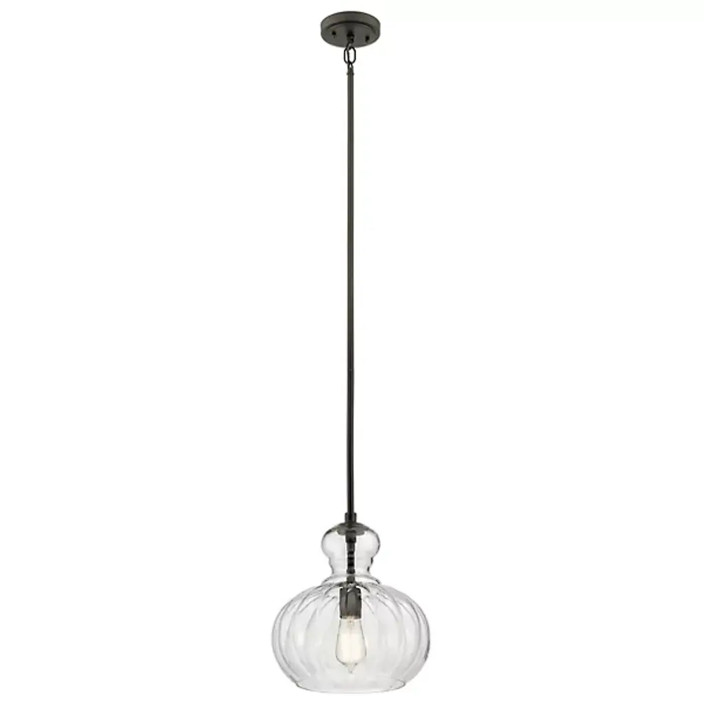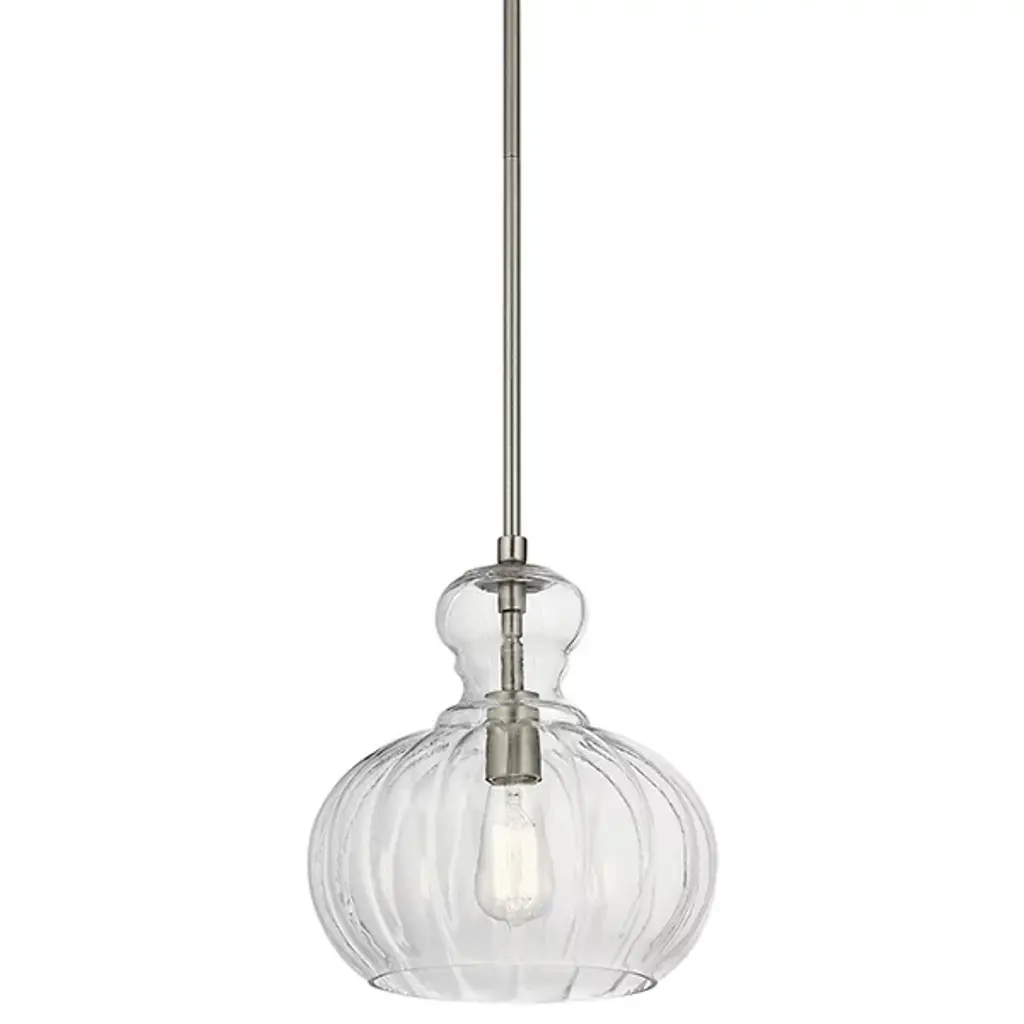 Inspired by antique perfume bottles, The Kichler Riviera Globe Pendant has an air of finesse and refinement. The clear ribbed glass gently obscures the view of the single exposed bulb, as well as diffuses the illumination. Reminiscent of beautiful glass bottles found in Grandma's china cabinet, use as singles or in groups to add a delicate and feminine air to any space.