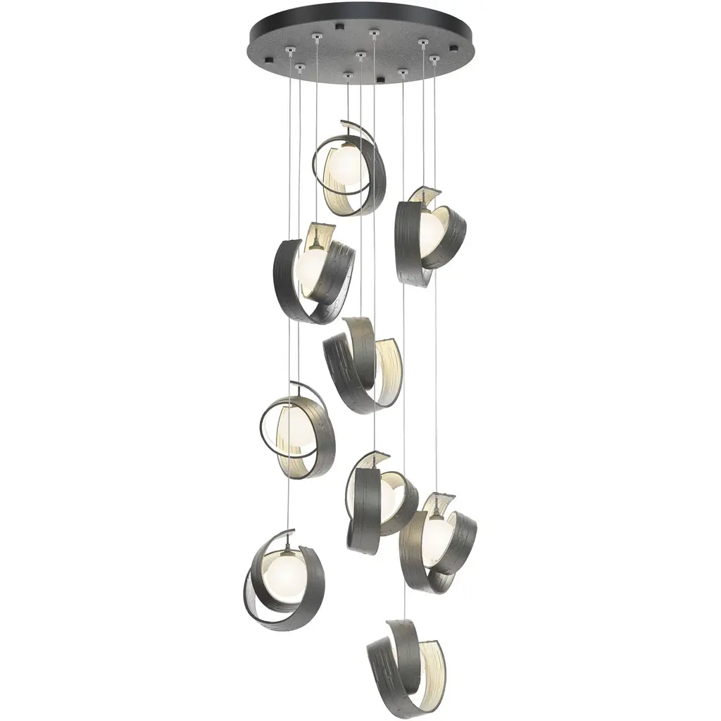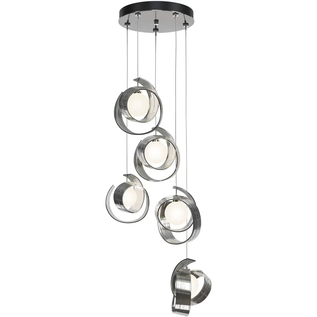 Pendant or semi-flush? The versatile Riza 5-Light can be either! Customizable cable lengths can be shortened to create a dramatic semi-flush; while longer lengths allow you to create a cascade of staggered light, gather them together at one length, or any design that suits the space. The Riza design is striking with its sculptural, modern style. The hammered texture of the shaped aluminum “curls” are handmade by our artisans in Vermont.