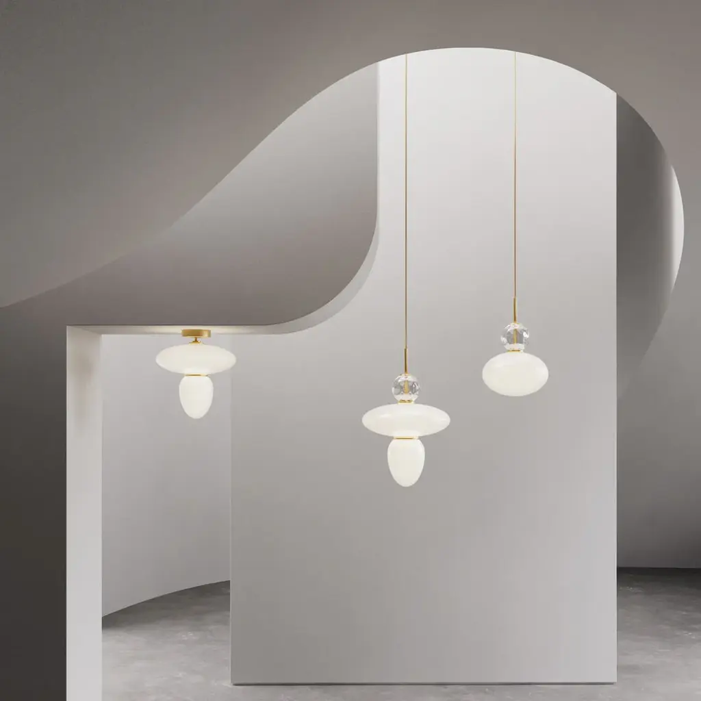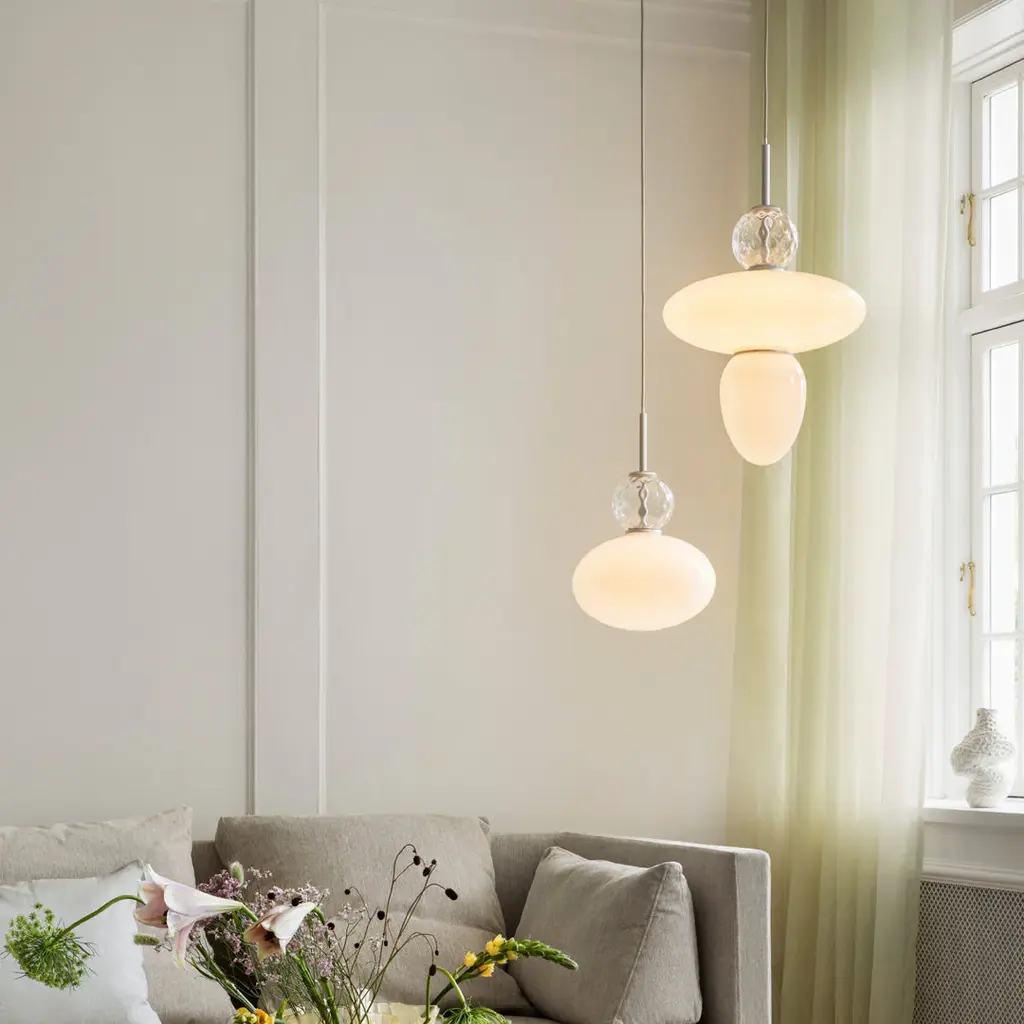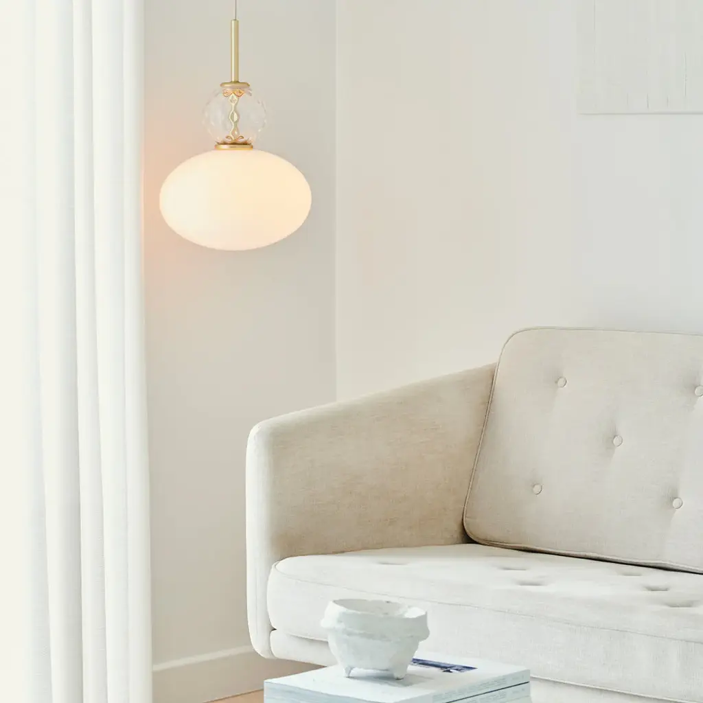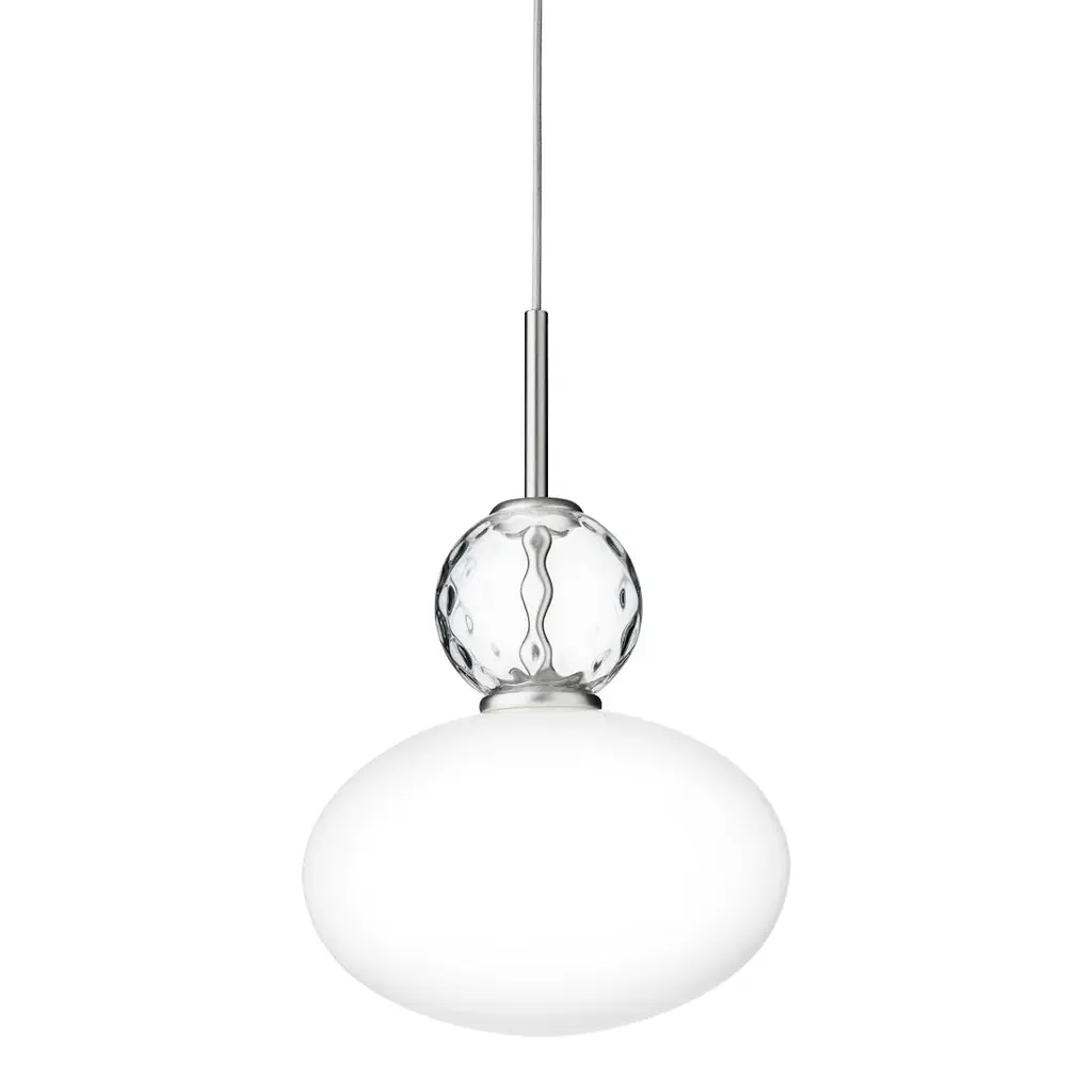 Decorative pendant designed by Italian architect Paolo Rizzatto. The Rizzatto 32 pendant has an organic expression, consisting of an oval shaped opalescent glass shade and a decorative patterned clear glass globe above. The opal white glass offers a soft and even light to a dining table or next to a sofa. Trimmed with satin brass metal details.