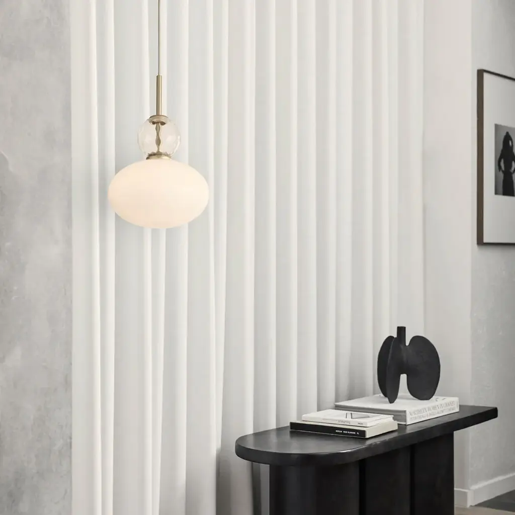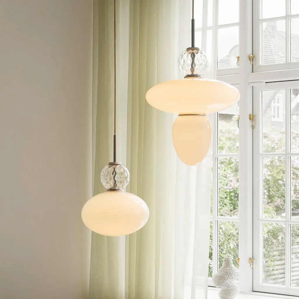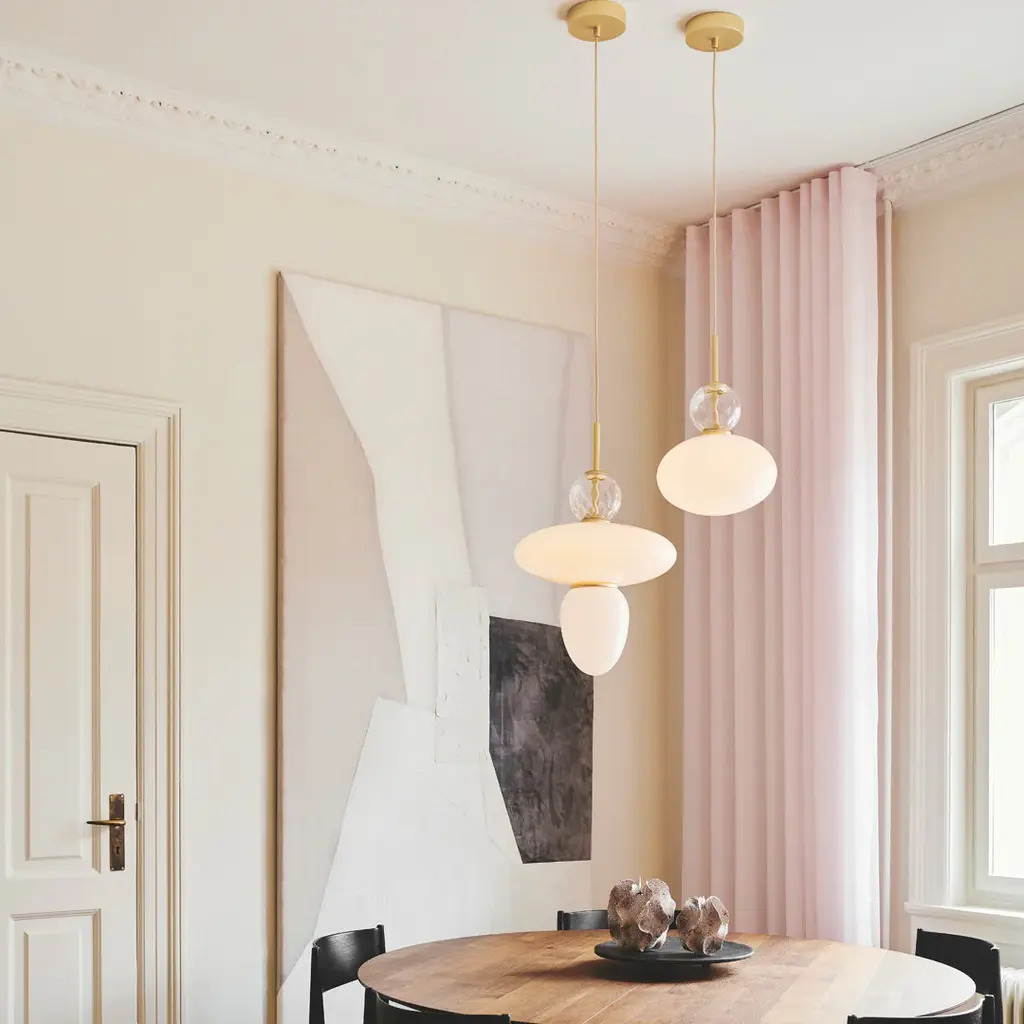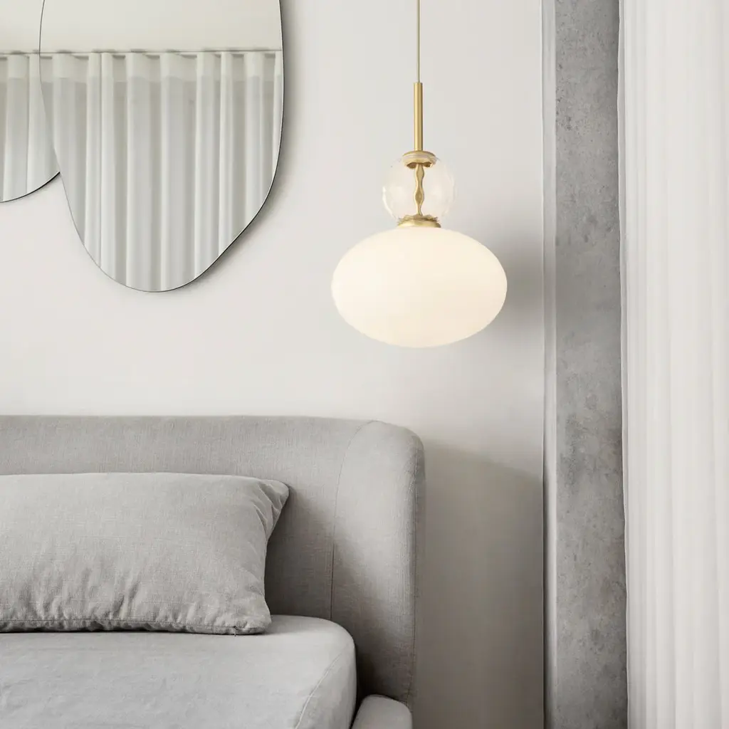 Decorative pendant designed by Italian architect Paolo Rizzatto. The Rizzatto 32 pendant has an organic expression, consisting of an oval shaped opalescent glass shade and a decorative patterned clear glass globe above. The opal white glass offers a soft and even light to a dining table or next to a sofa. Trimmed with satin brass metal details.
