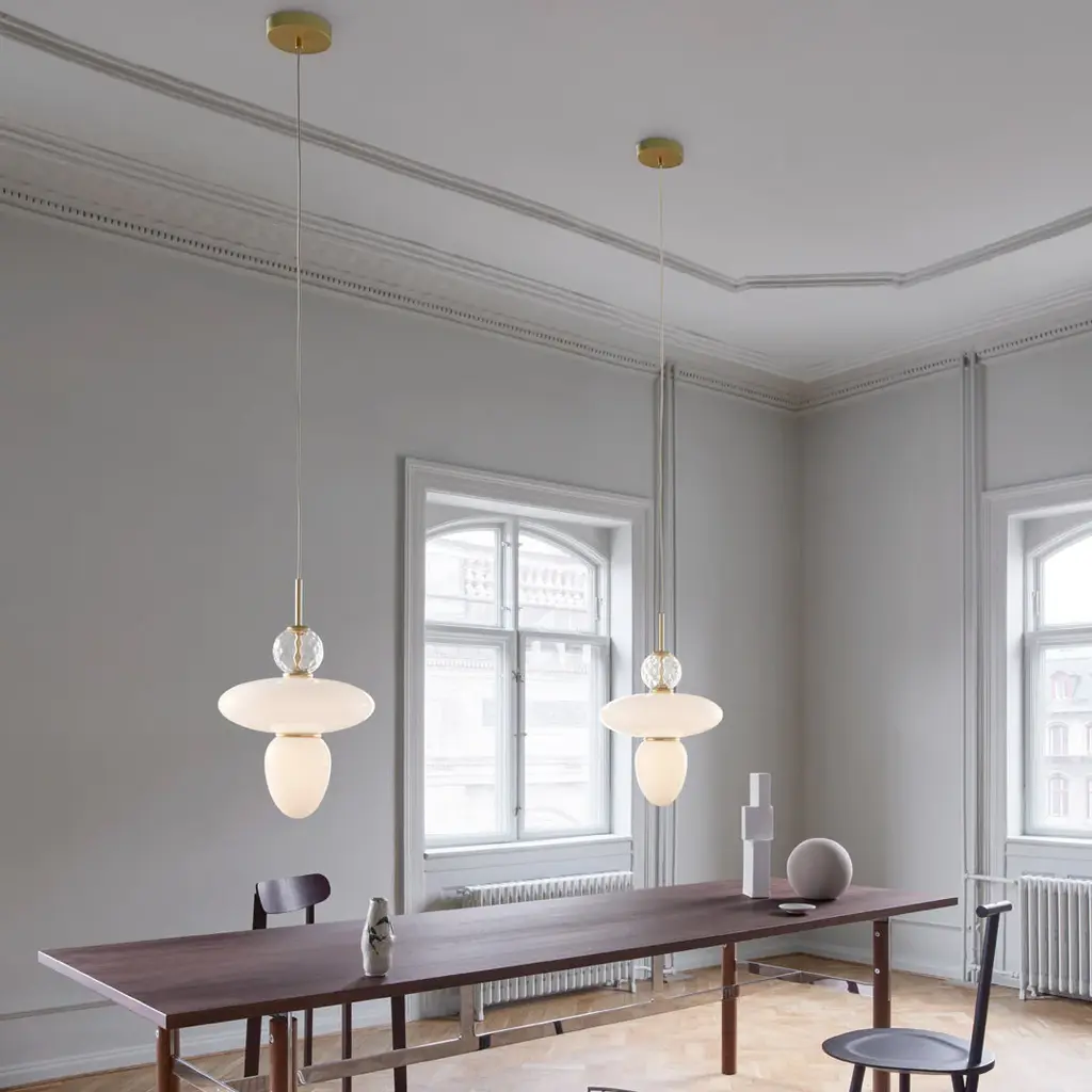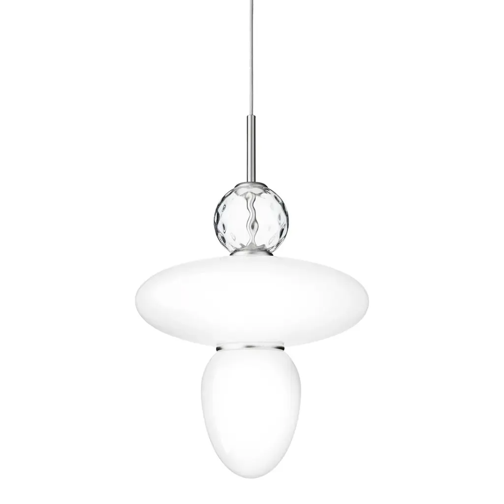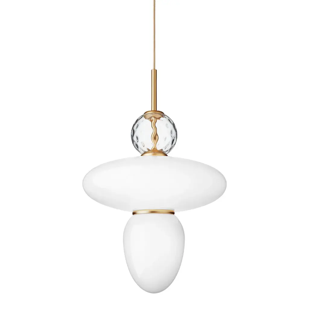 Decorative and geometric pendant by internationally renowned designer Paolo Rizzatto. The Rizzatto 43 pendant is designed with an elliptical glass shade at the center and with a drop shaped glass attached. Decorative details including a clear patterned glass ornament and satin brass metal trimming. The lampshades are made in opal white glass which gives a soft and even light to the room.