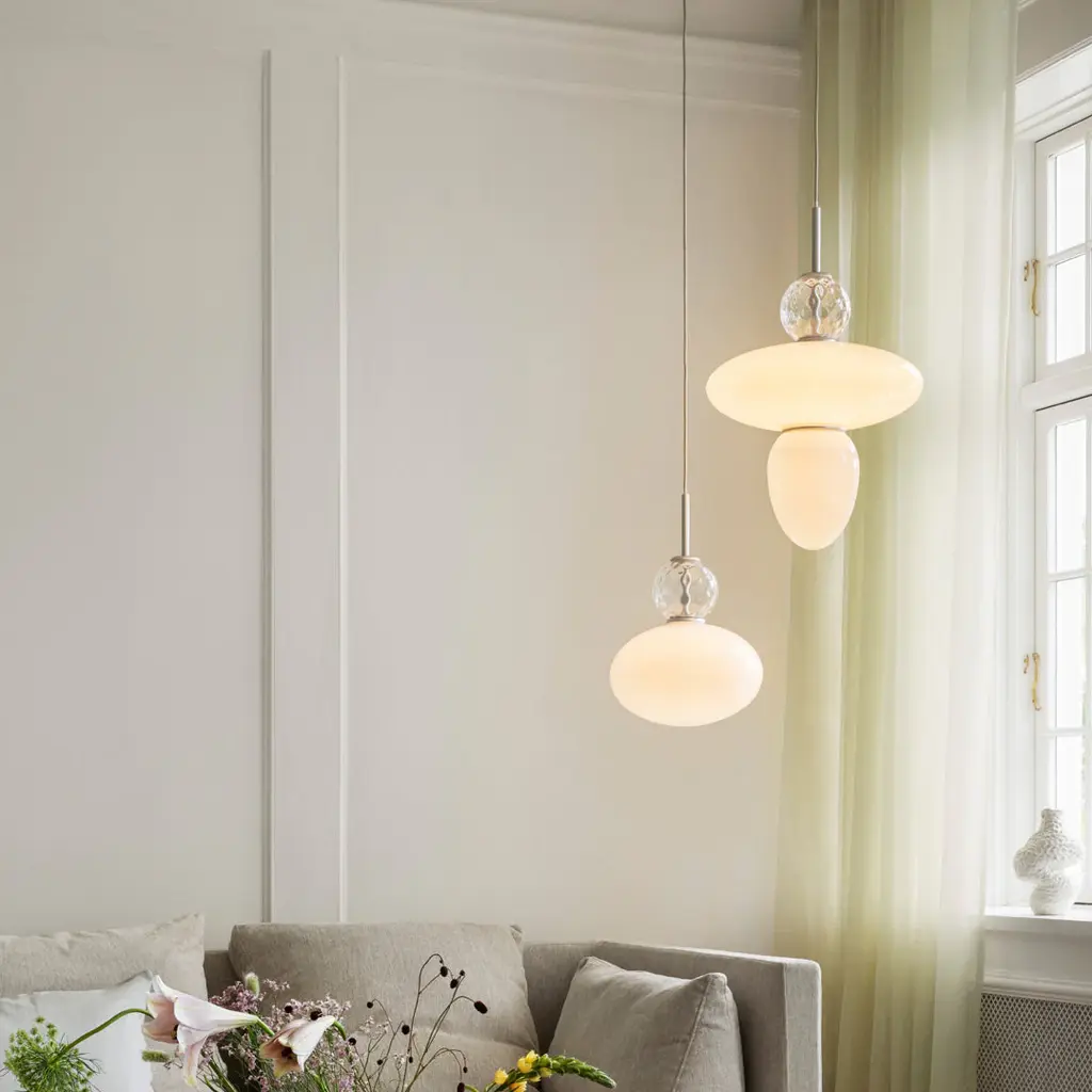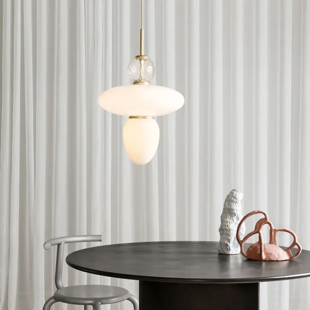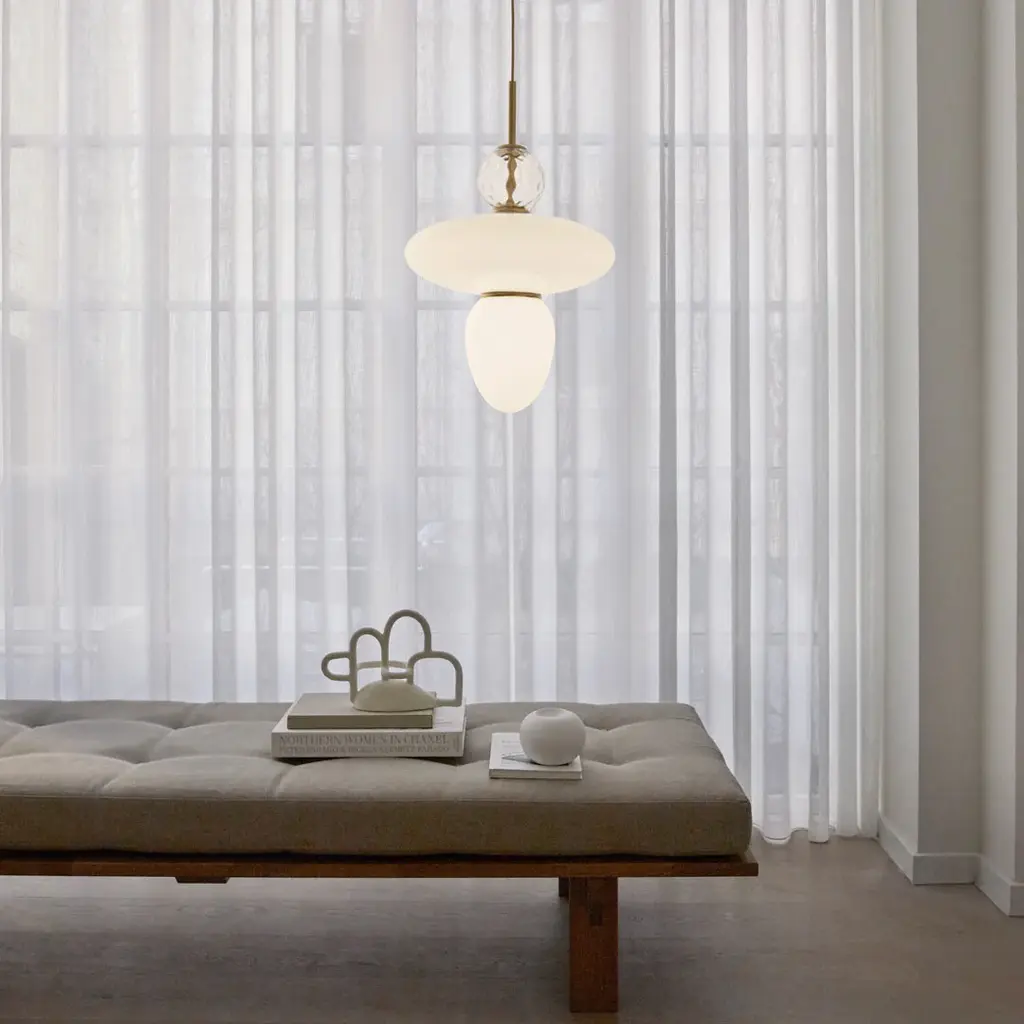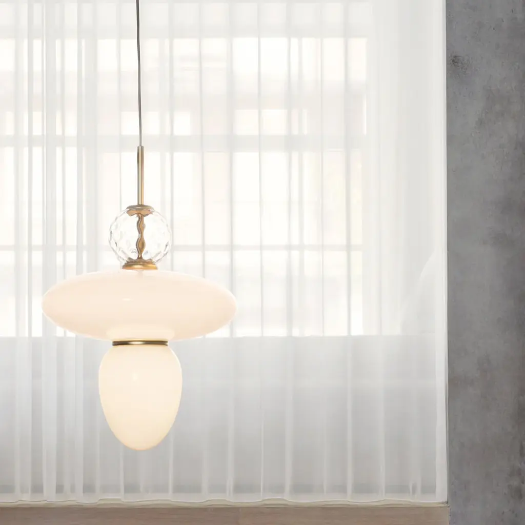 Decorative and geometric pendant by internationally renowned designer Paolo Rizzatto. The Rizzatto 43 pendant is designed with an elliptical glass shade at the center and with a drop shaped glass attached. Decorative details including a clear patterned glass ornament and satin brass metal trimming. The lampshades are made in opal white glass which gives a soft and even light to the room.