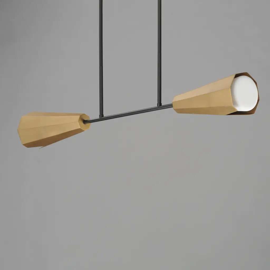 The Rizzo collection exudes stylish flair and spirited design, combining faceted metal shades in Natural Aged Brass with striking Matte Black accents. A flat-bottomed Satin White glass shade protrudes gracefully from the base of each metal shade, delivering soft, inviting light with a touch of elegance. Available in a variety of versatile configurations, the collection includes an articulating 4-arm chandelier, two sizes of stem-hung linear pendants, cord-hung multi-mini pendants, a sleek wall sconce, and a bold, coordinating flush mount. Elevate any space with Rizzo's perfect balance of timeless sophistication and modern edge.
