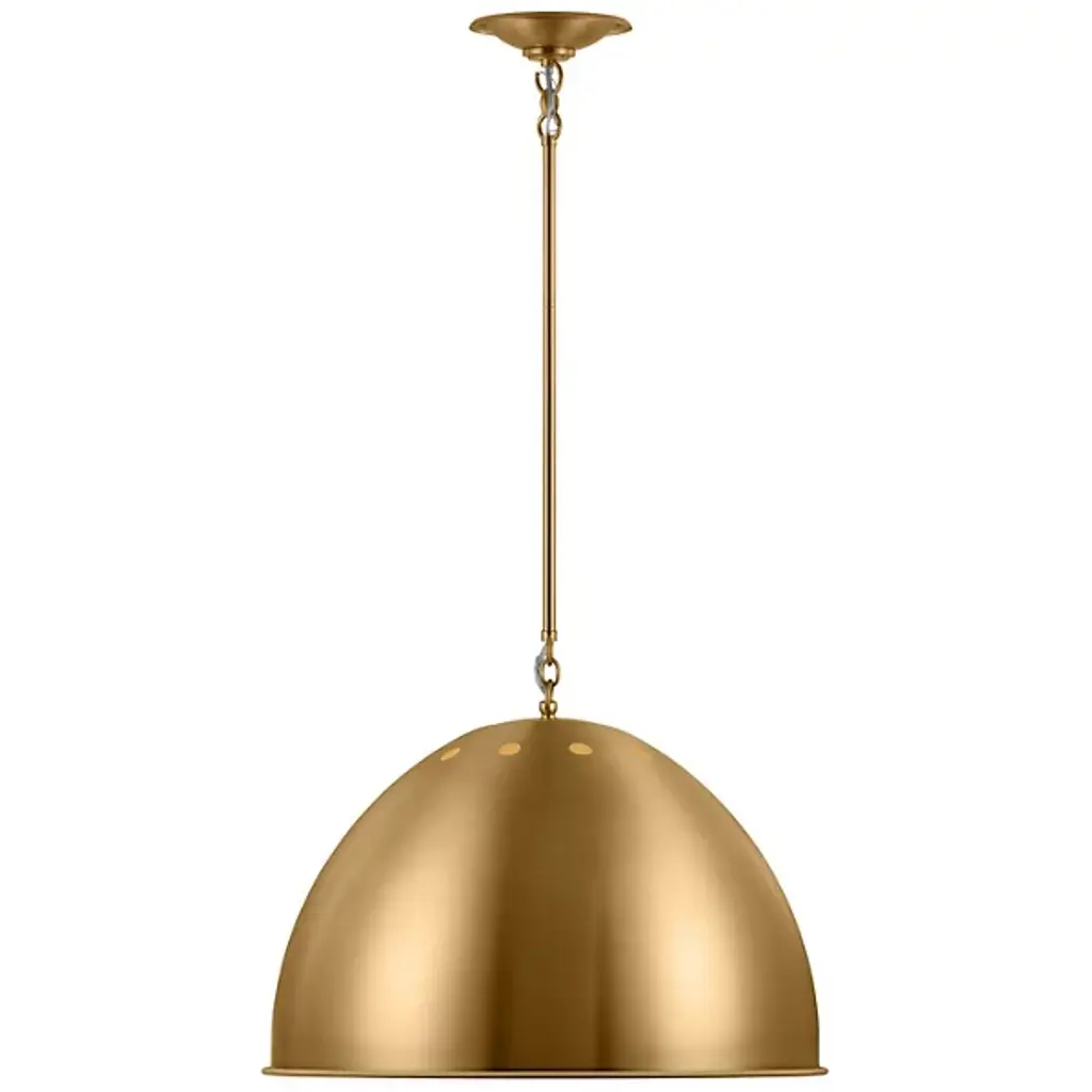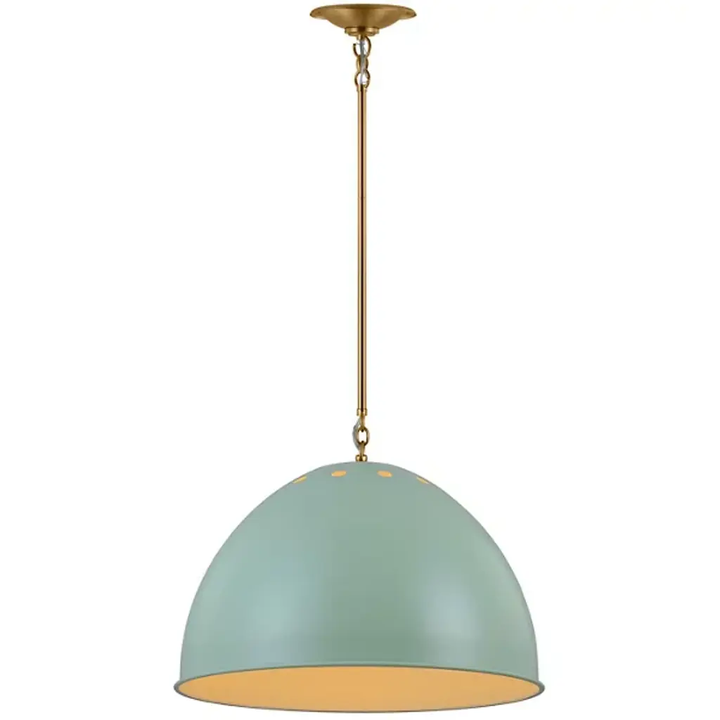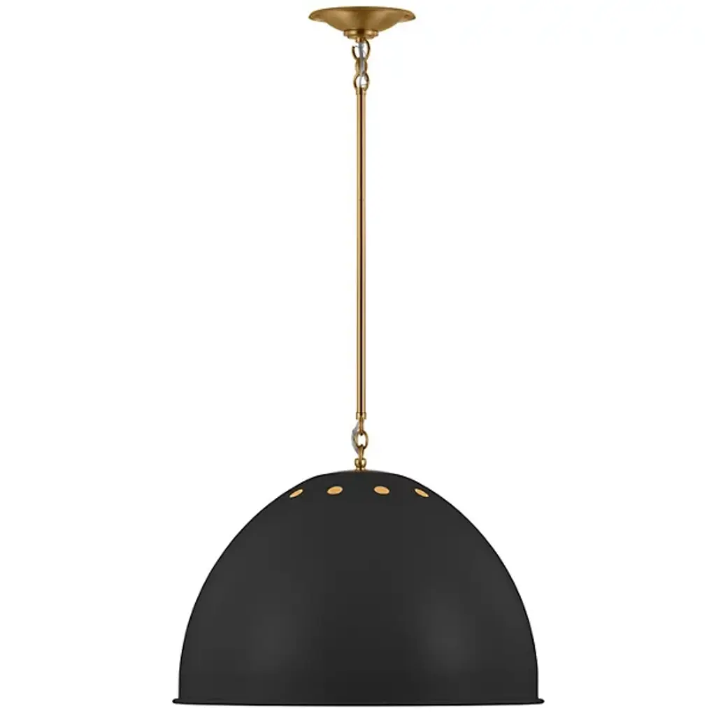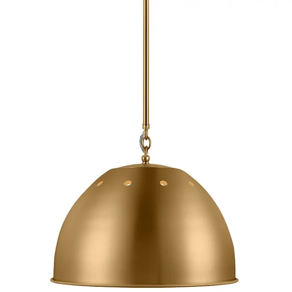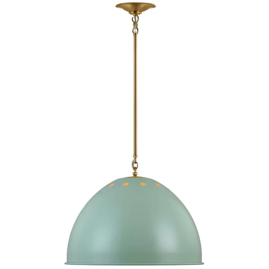Bring sculptural simplicity to ceilings with the arcing lines and expressive design of the Robbie Pendant from Visual Comfort Studio. An intriguing retro piece suspended via slender downrod from a circular canopy, it sets strong, damp-listed lamping inside a steel dome shade embellished by vent holes on its upper surface and a slim ring rim that races around its open base. The vent holes add depth to the fixture’s structure, transmitting small beams of light up and out, accenting the blend of reflected radiance and direct downlight transmitted through the large shade.