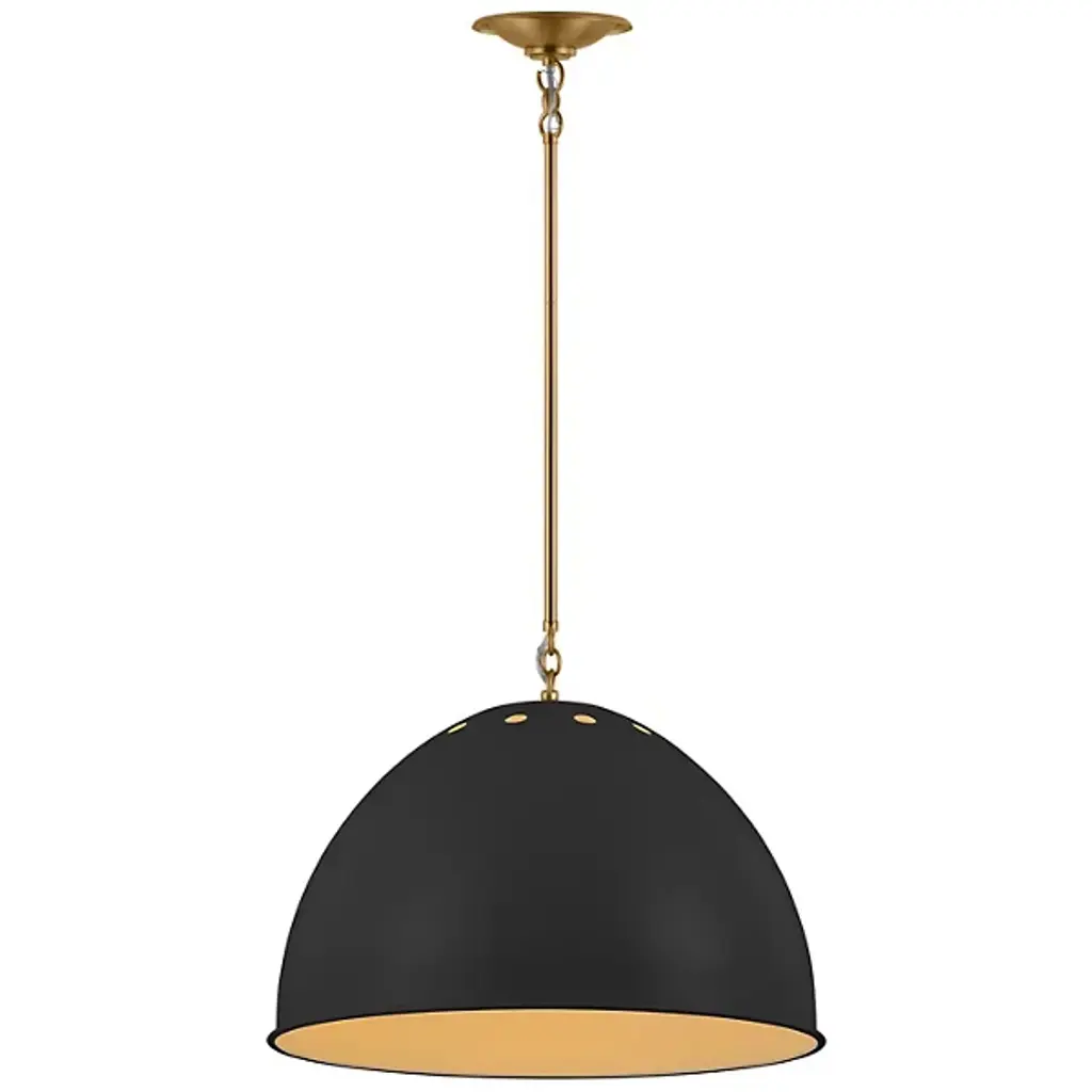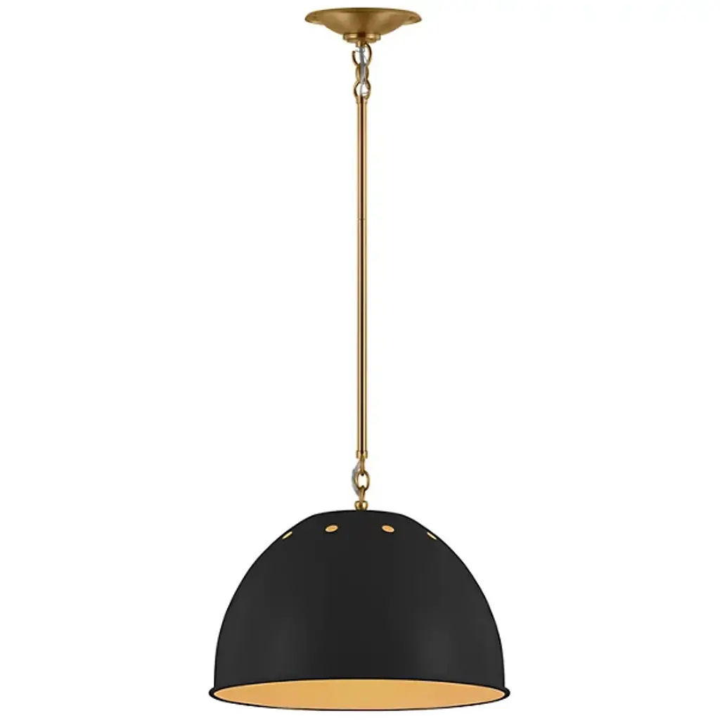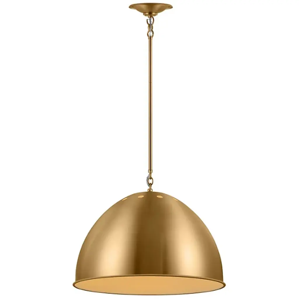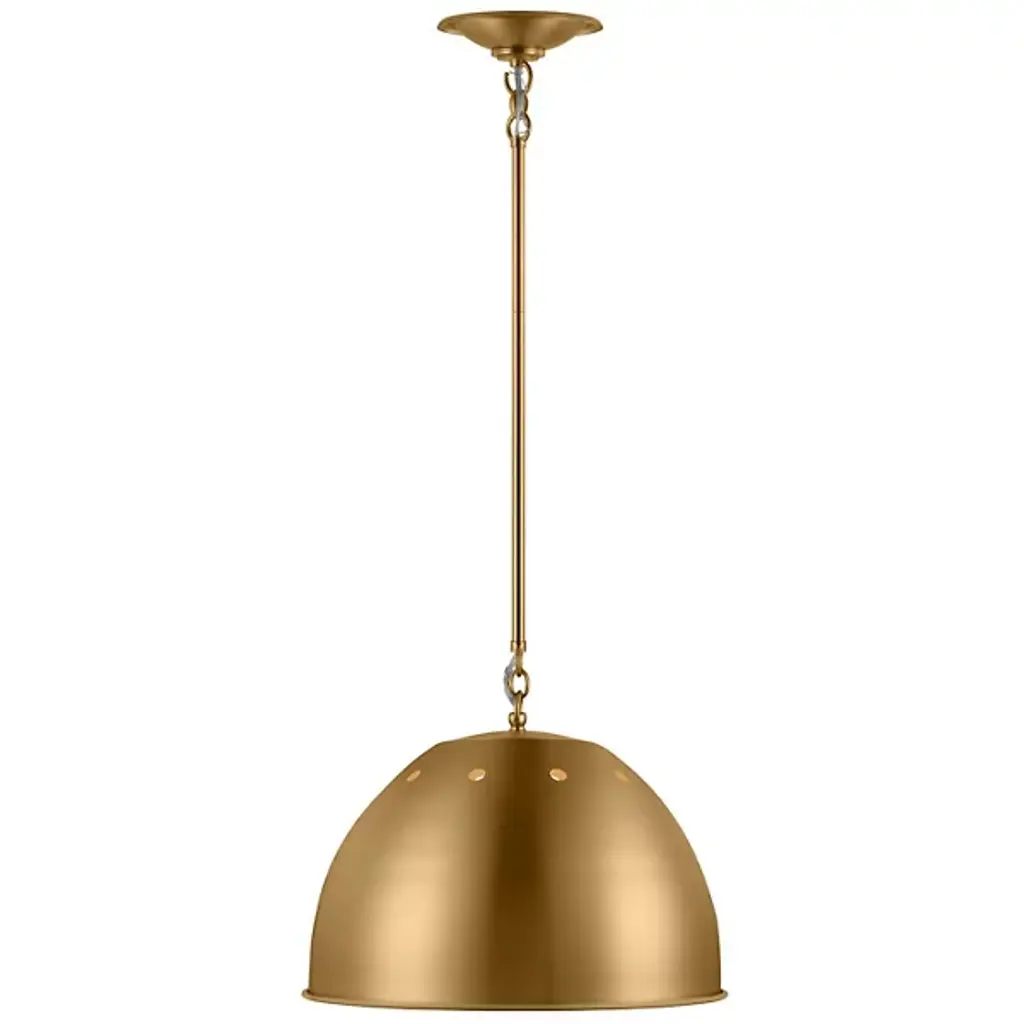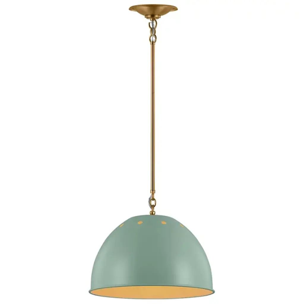 Bring sculptural simplicity to ceilings with the arcing lines and expressive design of the Robbie Pendant from Visual Comfort Studio. An intriguing retro piece suspended via slender downrod from a circular canopy, it sets strong, damp-listed lamping inside a steel dome shade embellished by vent holes on its upper surface and a slim ring rim that races around its open base. The vent holes add depth to the fixture’s structure, transmitting small beams of light up and out, accenting the blend of reflected radiance and direct downlight transmitted through the large shade.