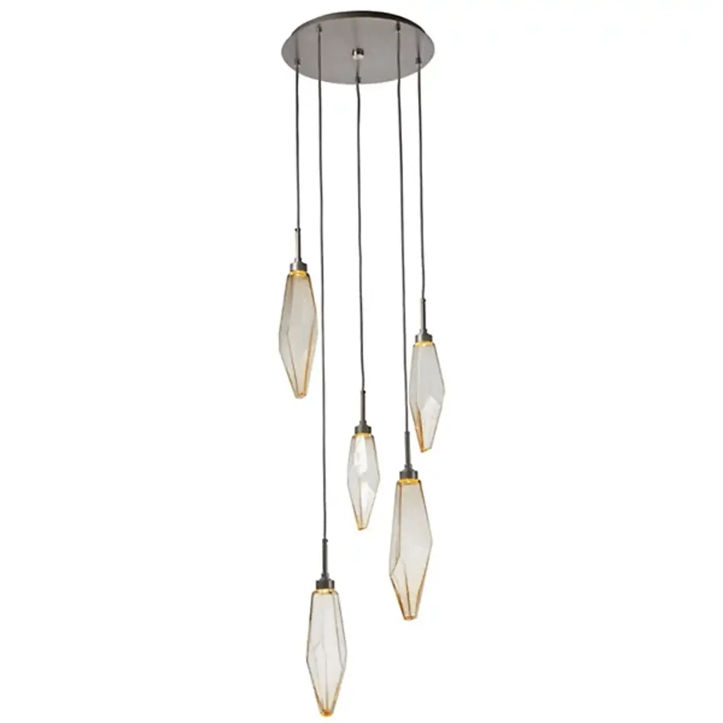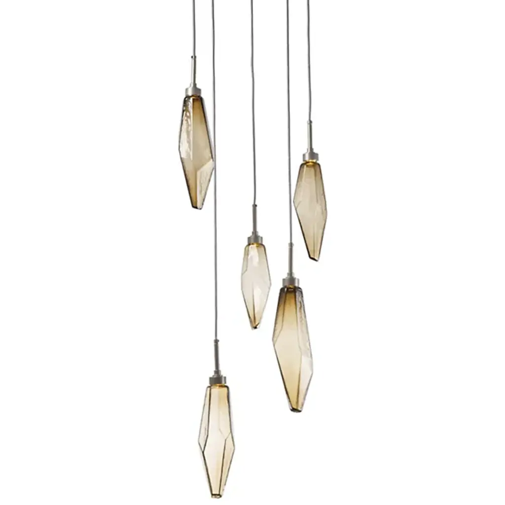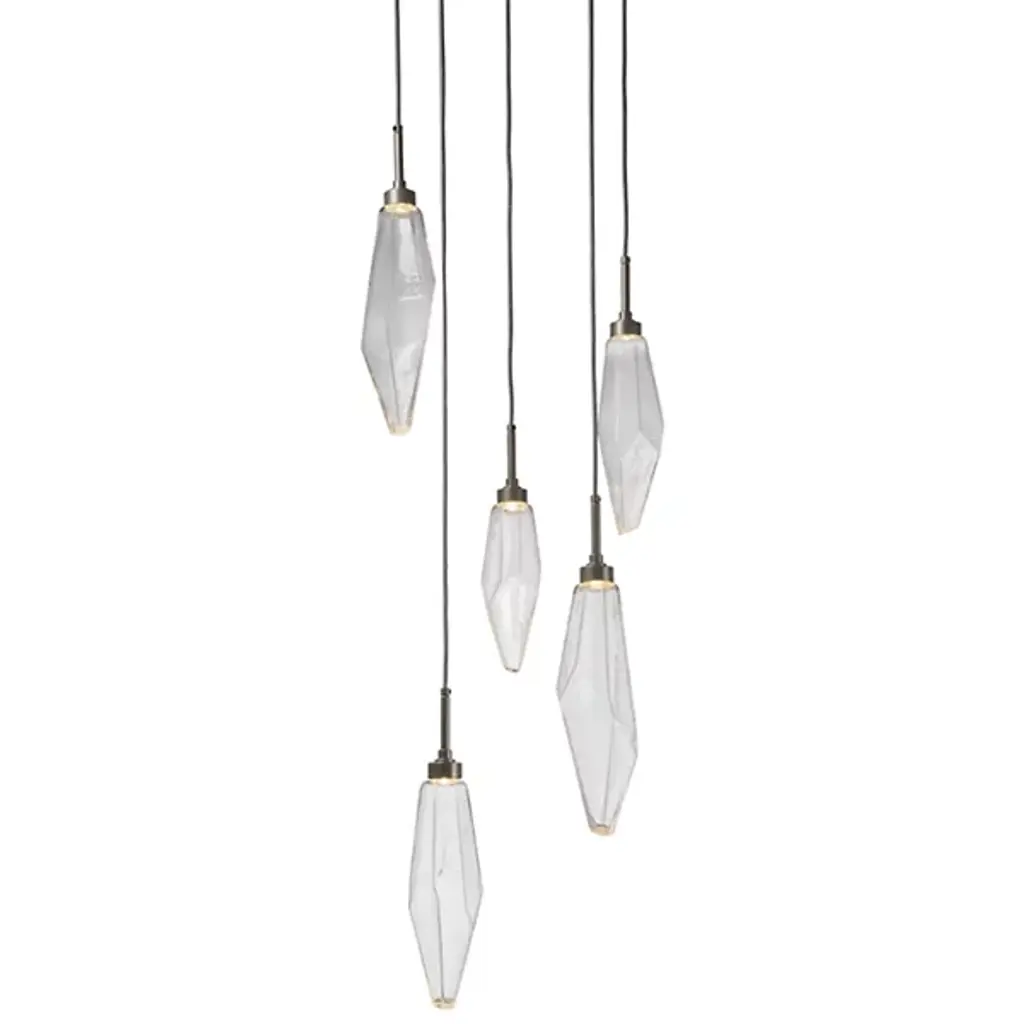 The Hammerton Studio Rock Crystal Round Multi Light LED Pendant is a handcrafted piece featuring delicate glass paired with energy efficient lighting. Each natural looking crystal is hung from its own fabric covered cord, making them all individually height adjustable for a custom look. Each glass piece is lit with its own LED light, which illuminates the space as well as gives a unique highlight effect to the glass.