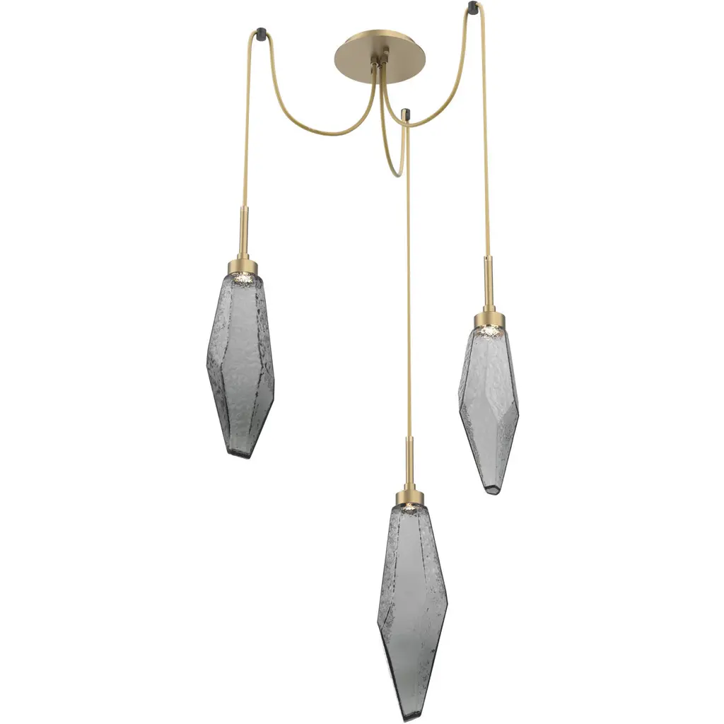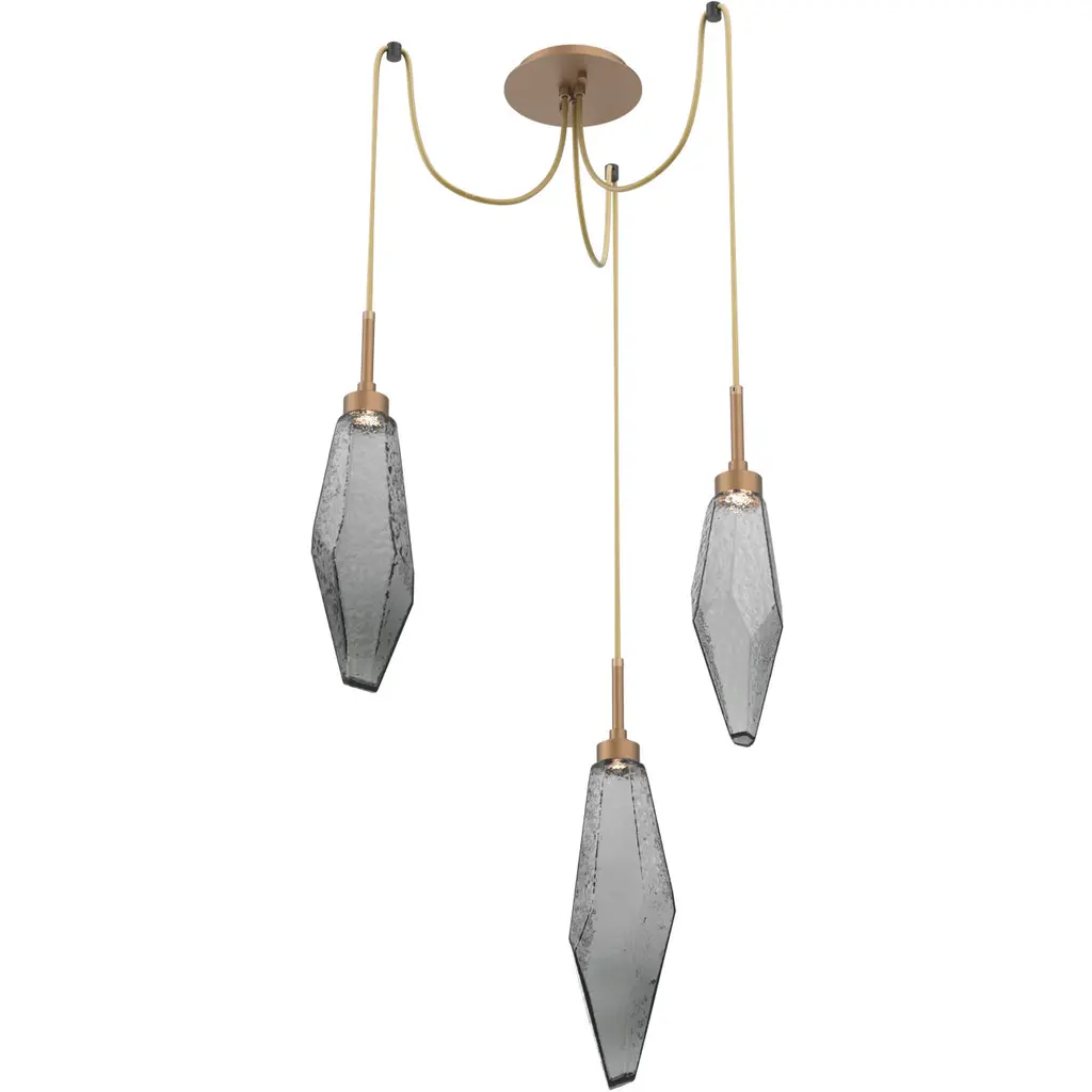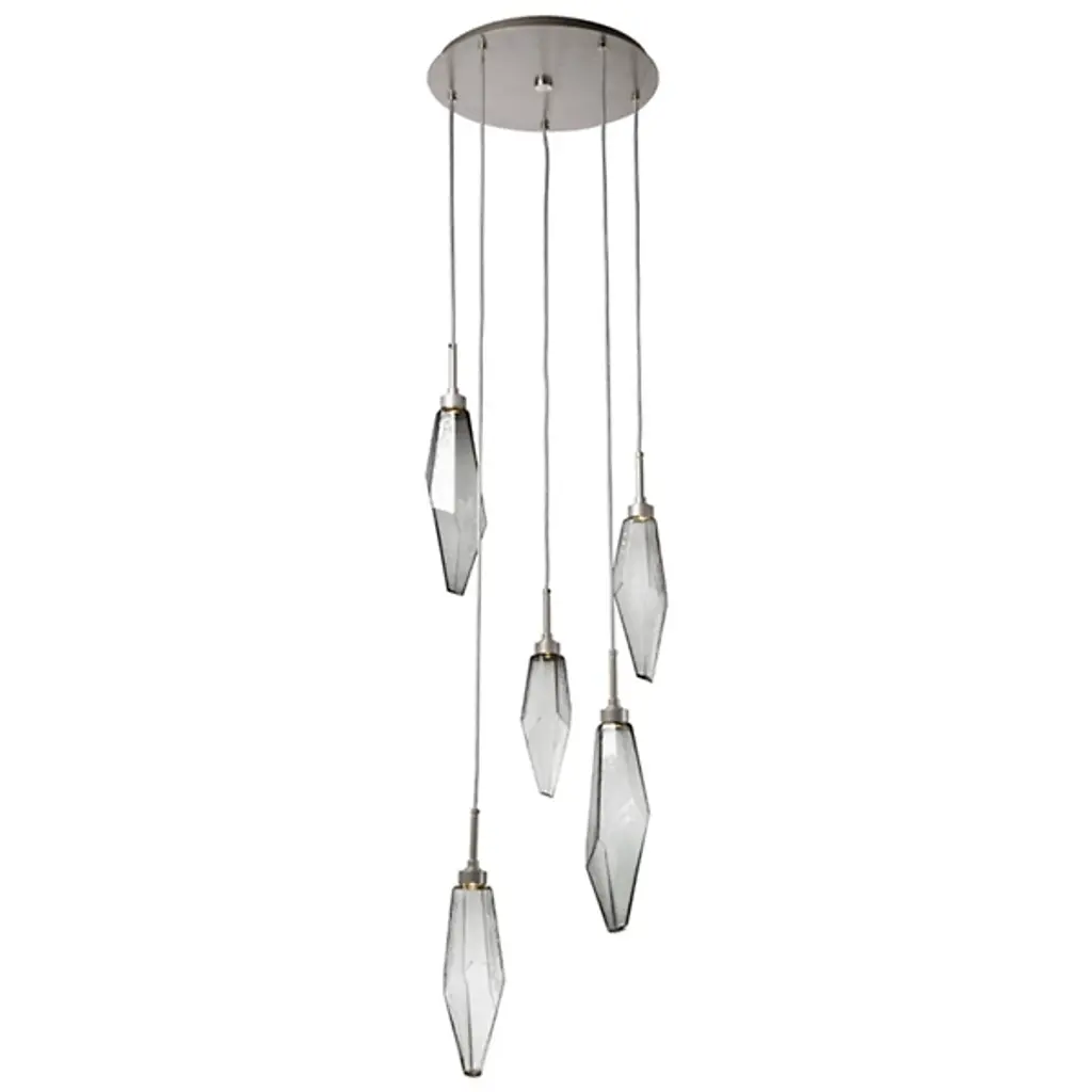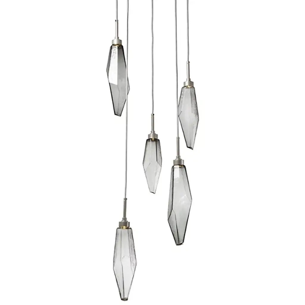 The Hammerton Studio Rock Crystal Round Multi Light LED Pendant is a handcrafted piece featuring delicate glass paired with energy efficient lighting. Each natural looking crystal is hung from its own fabric covered cord, making them all individually height adjustable for a custom look. Each glass piece is lit with its own LED light, which illuminates the space as well as gives a unique highlight effect to the glass.