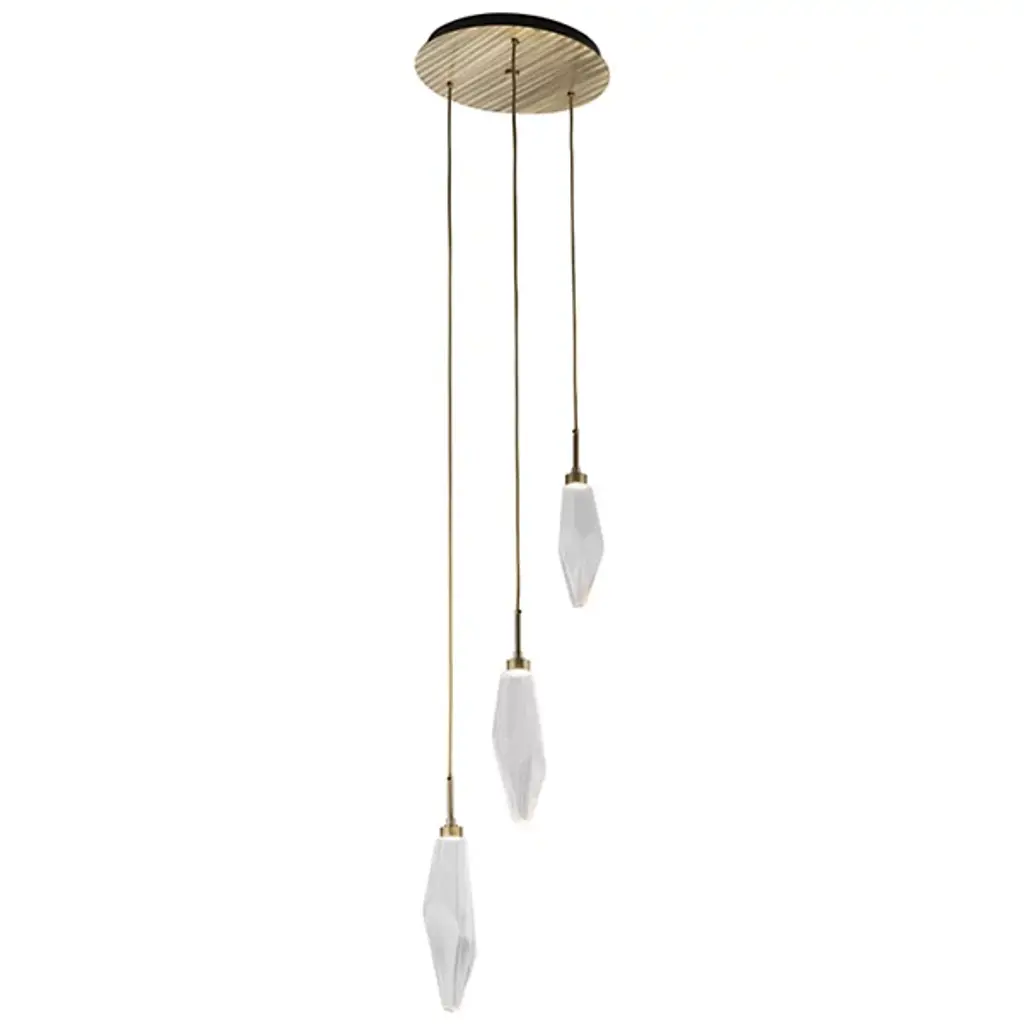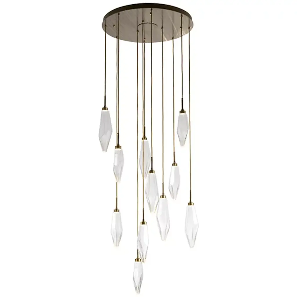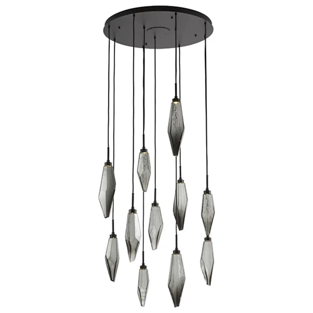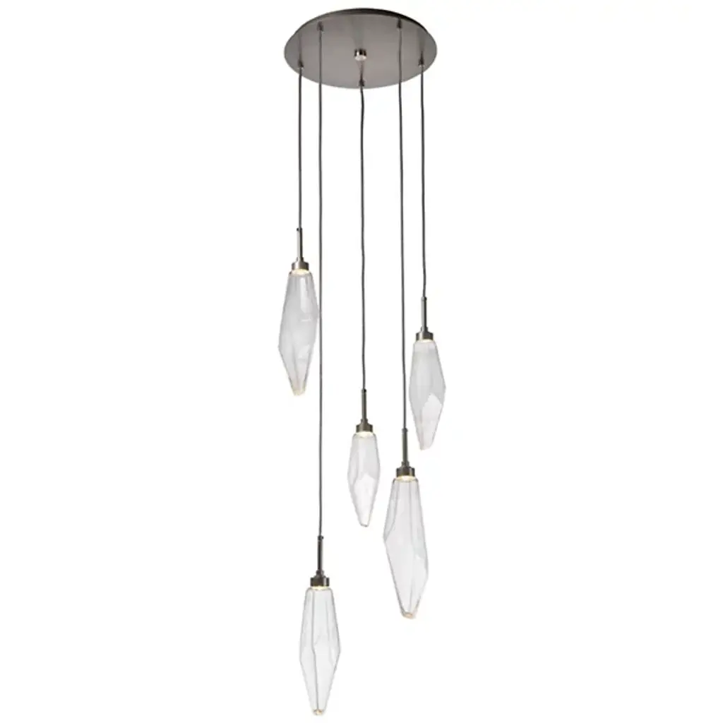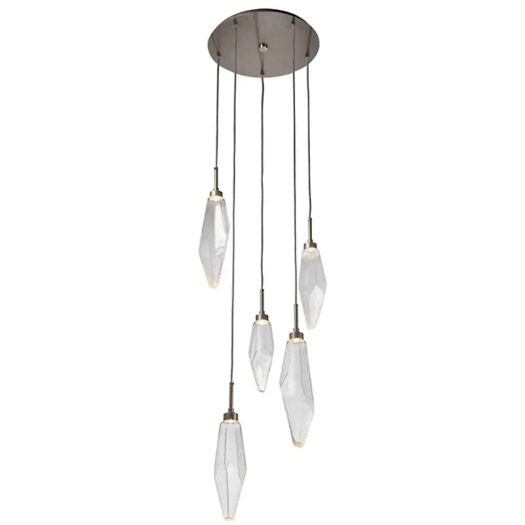 The Hammerton Studio Rock Crystal Round Multi Light LED Pendant is a handcrafted piece featuring delicate glass paired with energy efficient lighting. Each natural looking crystal is hung from its own fabric covered cord, making them all individually height adjustable for a custom look. Each glass piece is lit with its own LED light, which illuminates the space as well as gives a unique highlight effect to the glass.