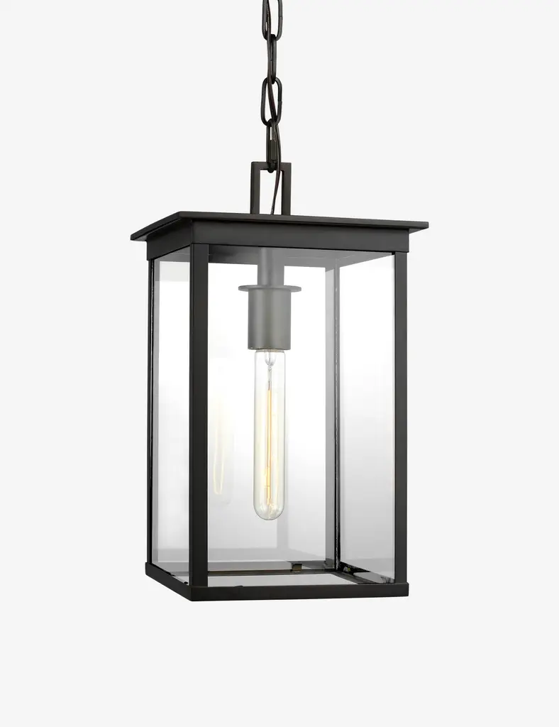 Framed in black metal and fitted with clear glass, Romary balances clean lines with industrial undertones. With its chain suspension and visible bulbs, this handing light brings timeless warmth and ambiance with a tailored edge to your space. We love this outdoor pendant for elevating a covered porch or patio with a refined lighting feature.