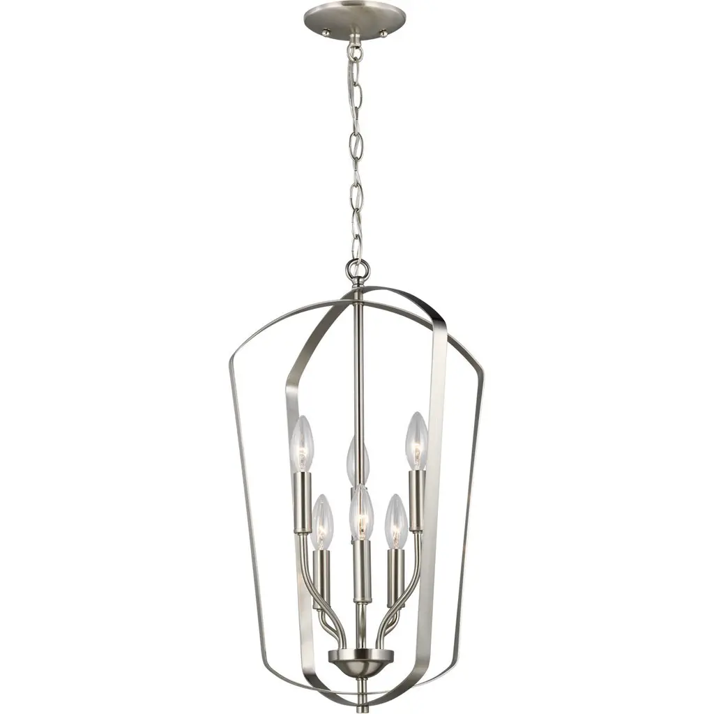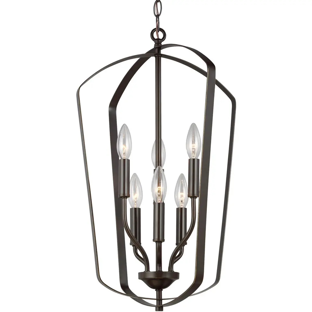 The Romee six light indoor pendant in bronze is a playful, yet simple spin on the classic lantern. With clean lines and elegant lamping holders makes Romee the perfect addition to any space without taking the spotlight from the decor, but will illuminate with superb class. The full Romee series is available in three beautiful finishes Brushed Nickel, Chrome and Heirloom Bronze with three and six light options, making it easy to add Romee to any decor.