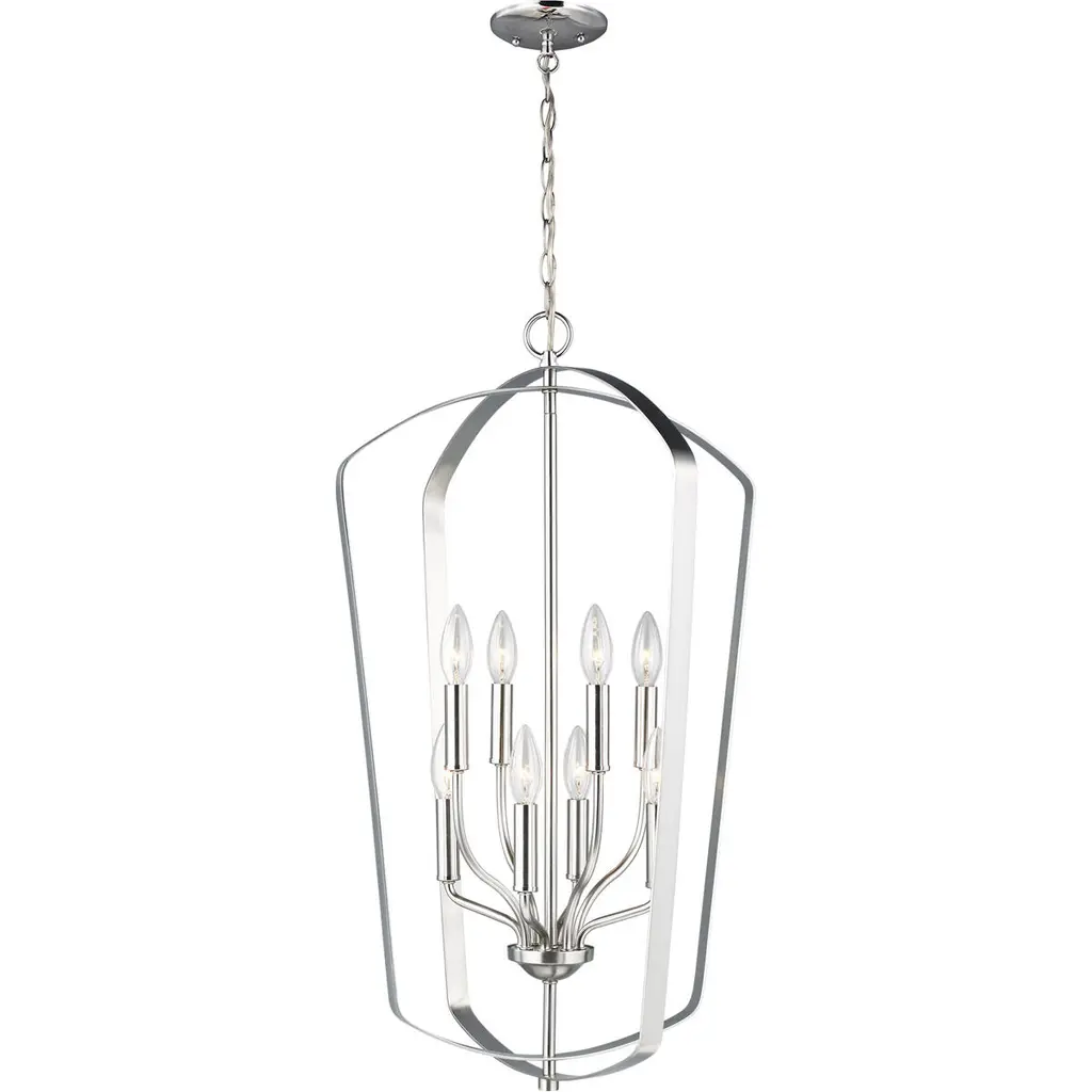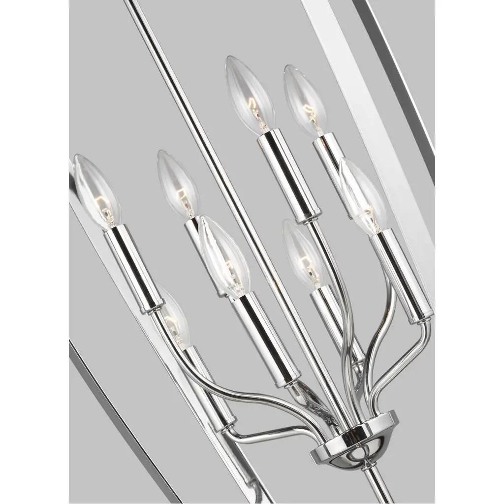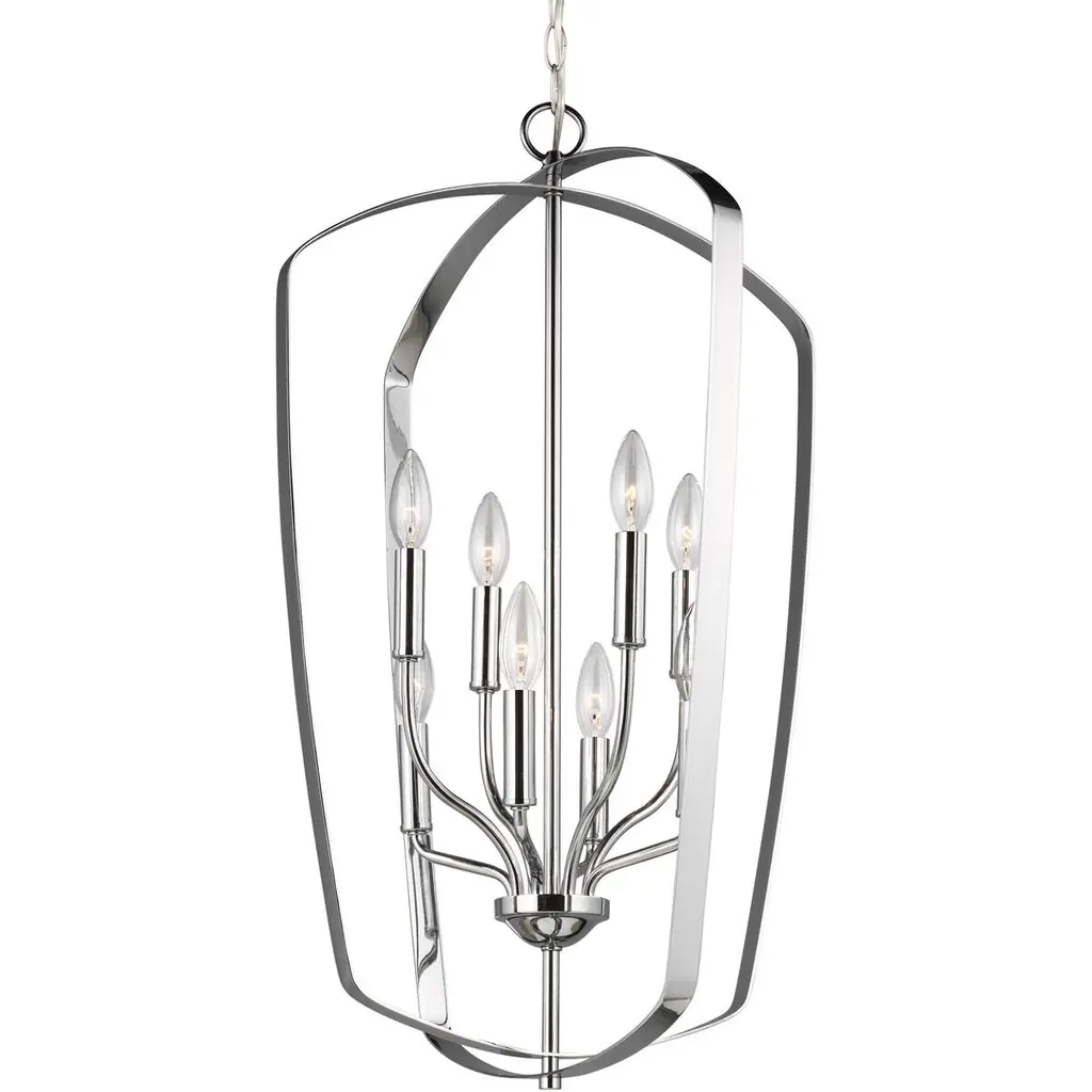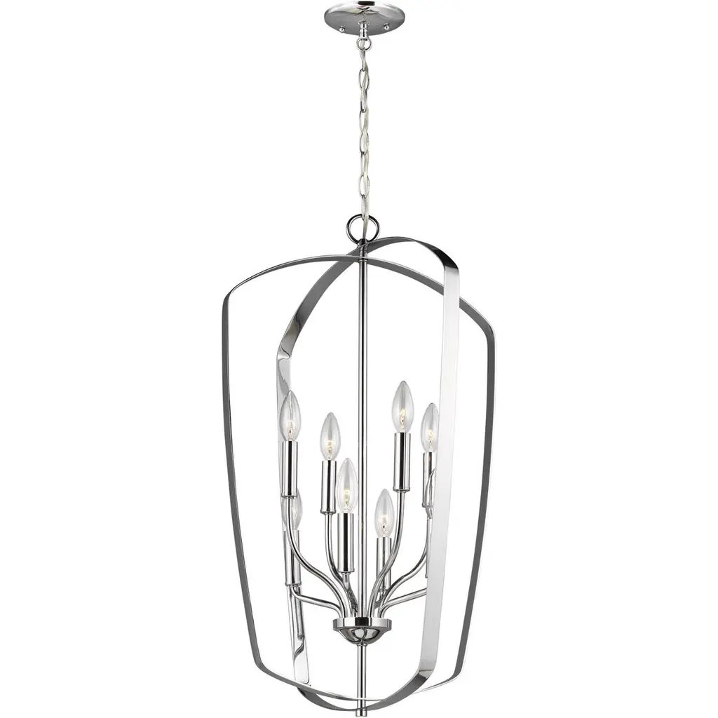 The Romee eight light indoor pendant in chrome is a playful, yet simple spin on the classic lantern. With clean lines and elegant lamping holders makes Romee the perfect addition to any space without taking the spotlight from the decor, but will illuminate with superb class. The full Romee series is available in three beautiful finishes Brushed Nickel, Chrome and Heirloom Bronze with three and six light options, making it easy to add Romee to any decor.