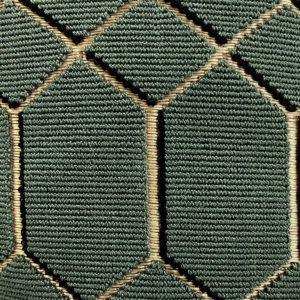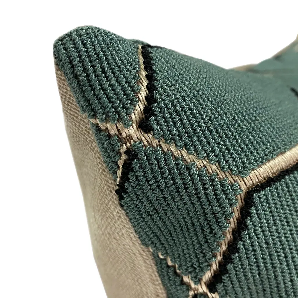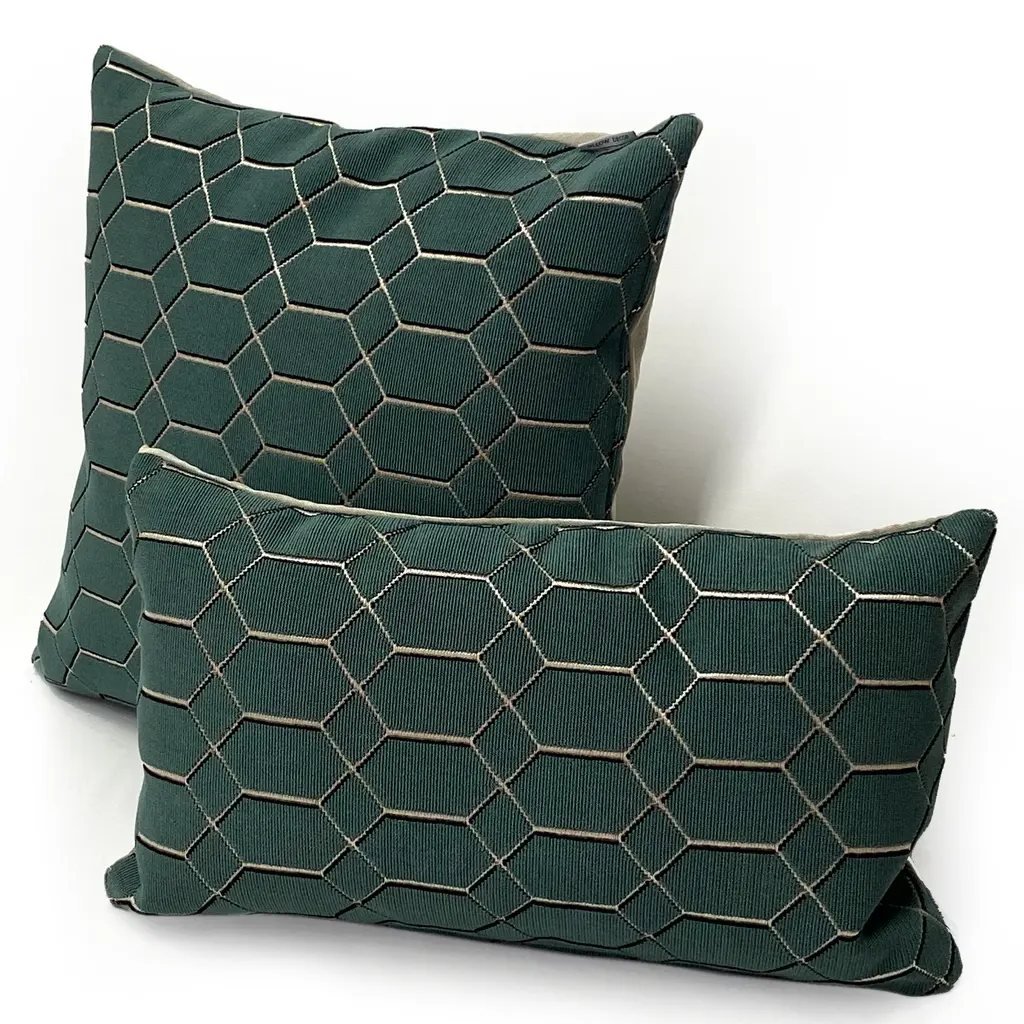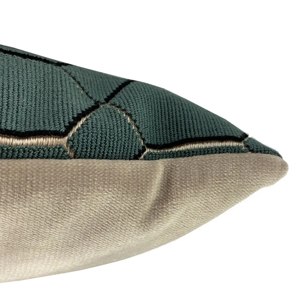 This stunning 12x20 inch lumbar pillow, crafted from Kirkby Design's Pendant Teal fabric, offers a captivating blend of style and texture. Its metallic shimmering ground beautifully contrasts with a textured loop surface, creating a striking three-dimensional geometric pattern. The result is a pillow that feels both opulent and distinctly modern, making it a perfect contemporary accent for any space. The back of the pillow is a soft velvet in a complementary taupe shade. Size: 12"x20" Rectangular Fabric: 58% Polyester/36% Acrylic/6% Viscose Design on front only. Taupe velvet fabric on back. Knife edge seams. Inside seams are reinforced for strength and durability. Hidden zipper closure Dry Clean Only Fabric from the KirbyDesign Arco Geomotric Collection Made in Canada: Designed and made in Pillow Decor's Vancouver workroom.