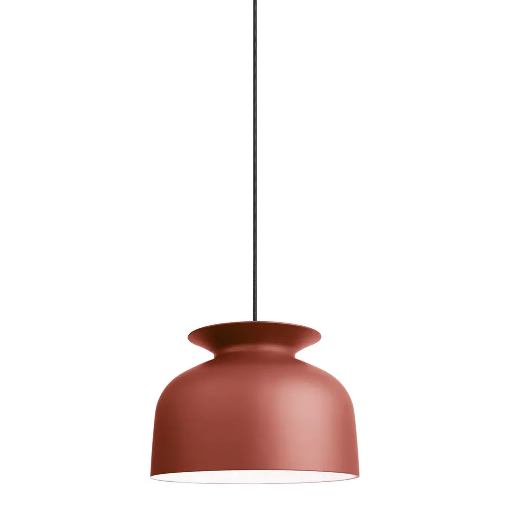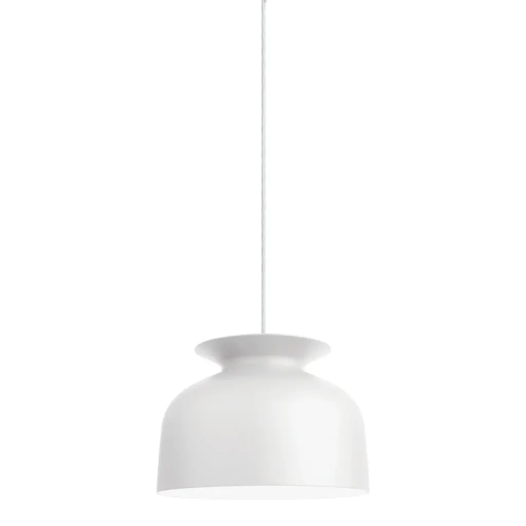 Ronde is a traditional archetype of a pendant lamp with a bell-shaped spun aluminium shade. A unique detail is the opening on the top with an overhanging collar that reminds of a jar such as a vase or an amphora. In this design the light spreads out of the spout-like opening and casts a smooth light gradient at the wire and ceiling. Ronde is in several languages the word for round, circular or rotating but it is also the flat blank used for metal spinning technique, which is rotating around a mould core and shaped to a 3-dimensional body. Canopy included. The textile cord is black, except for matte white variation, which matches the shade.