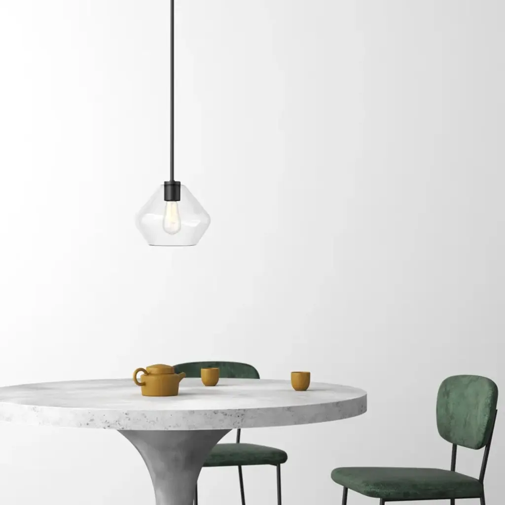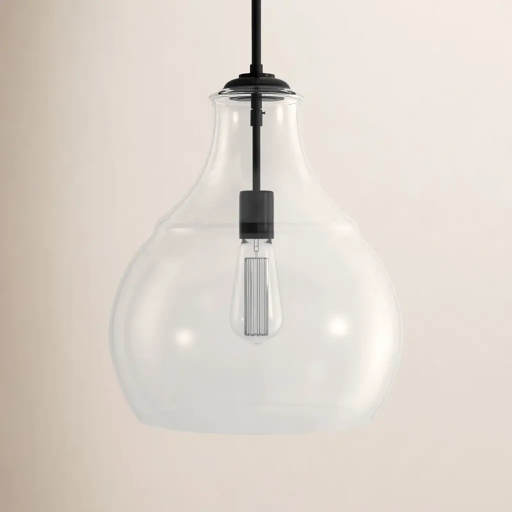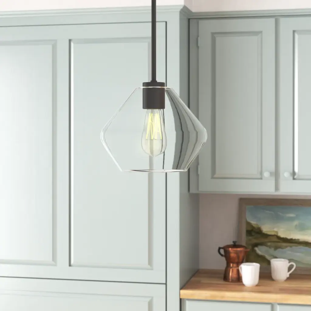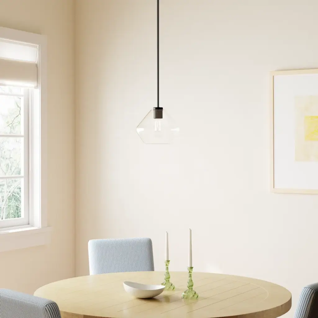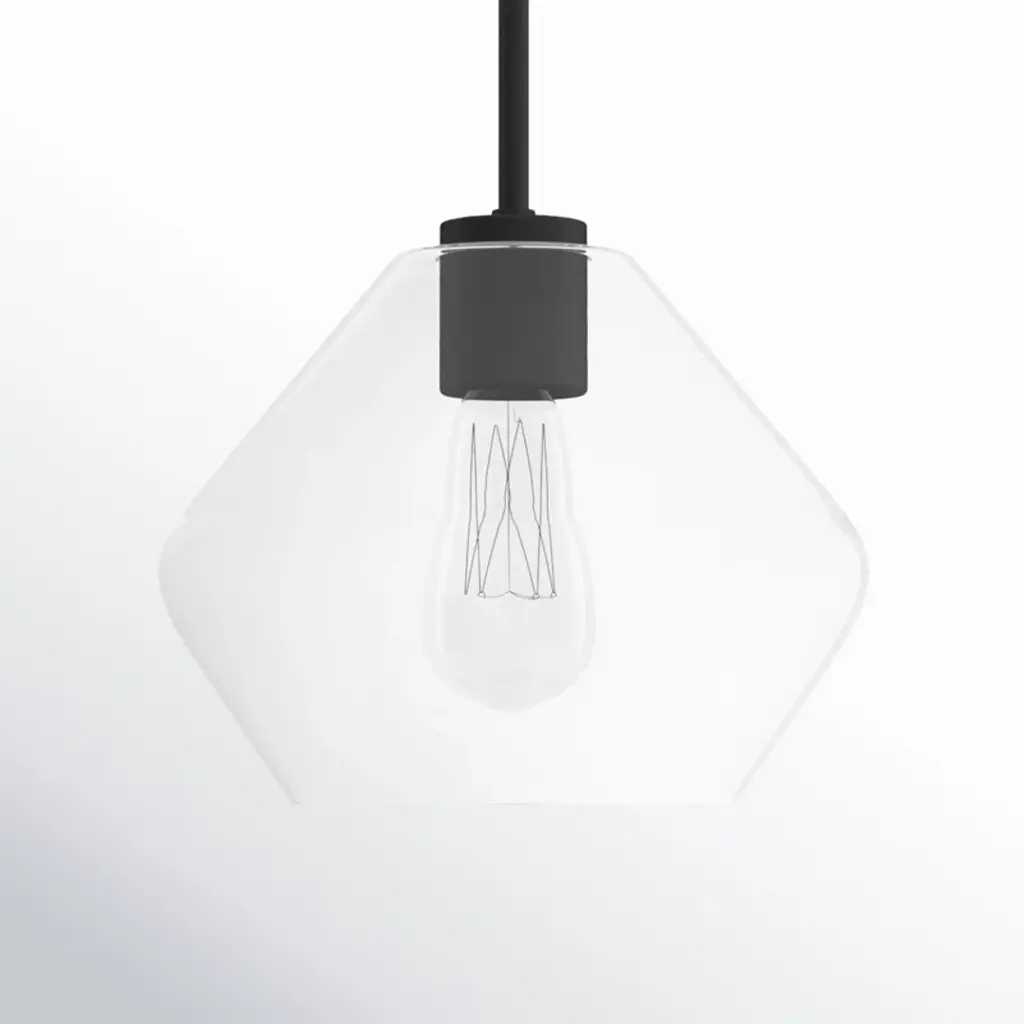 Welcome a radiant glow into your space with our single-light pendant. Crafted from gleaming steel and clear glass, this fixture shows off a soft geometric silhouette that brings a touch of modern appeal to your home. It's compatible with sloped ceilings and hangs from an adjustable downrod for versatility – whether it's brightening your kitchen island or cozy reading nook. Plus, it's safe to use in damp areas like bathrooms and covered patios.