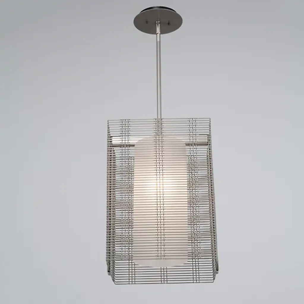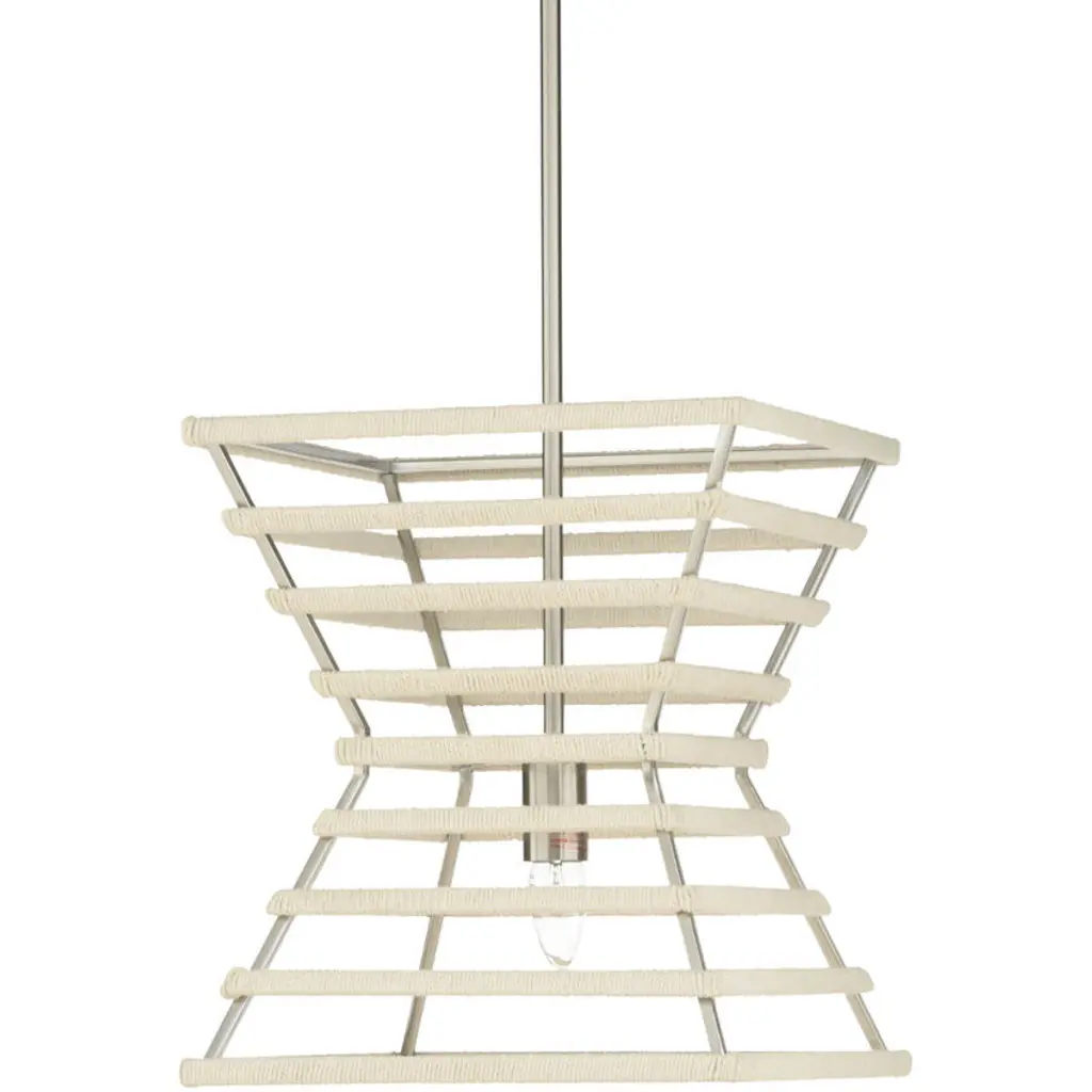 Bold with a sleek silhouette, the Rope Pendant makes a statement with pearlescent white rope wrapped around an hourglass shaped metal base with nickel finishing. It's the perfect fit for a modern or transitional setting. Designed by Elizabeth Wicker.