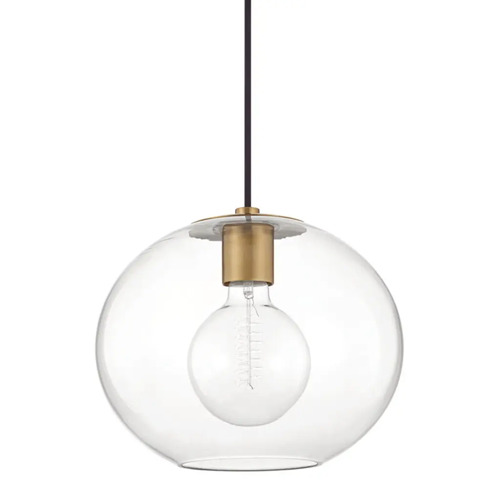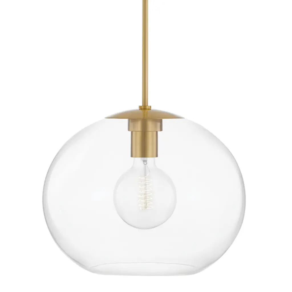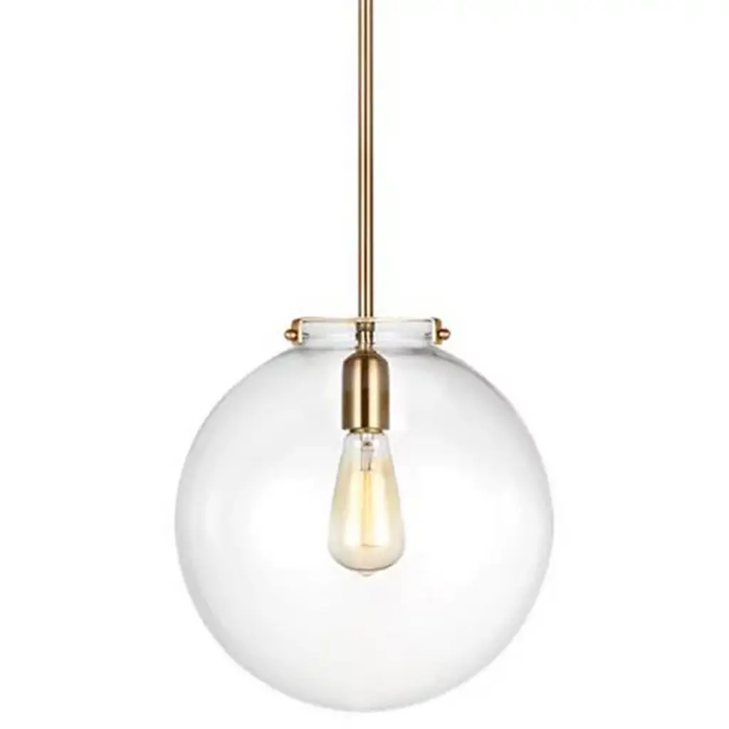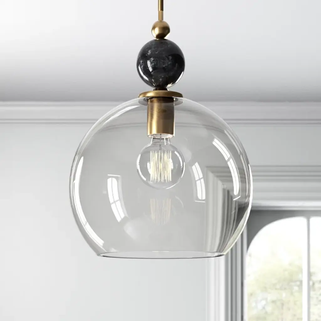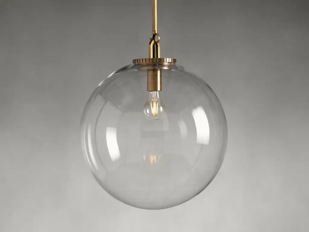 Topped with a rich black marble ball, this pendant features an oxidized aged brass finish enhancing the simple but elegant line. Finishing off this look is a clear 13-inch diameter glass globe. Supplied with 1-60 watt max Edison socket, and includes 15' wire, and 3-12" stems & 1-6" stem for adjustable installation.