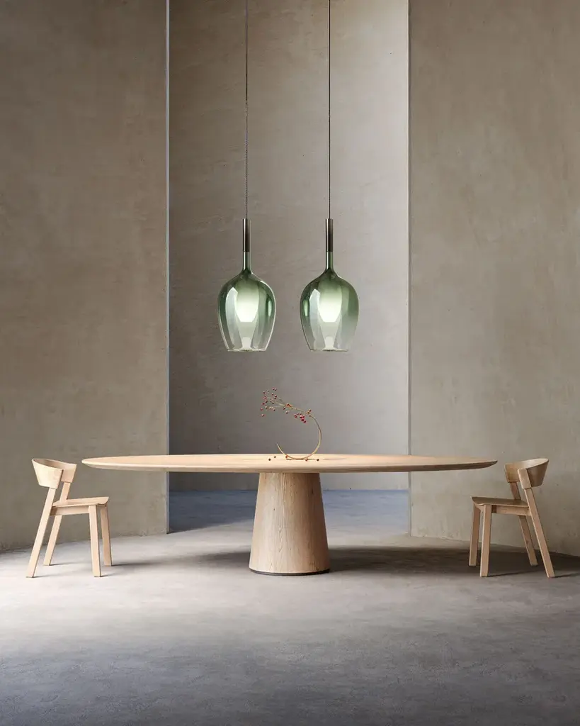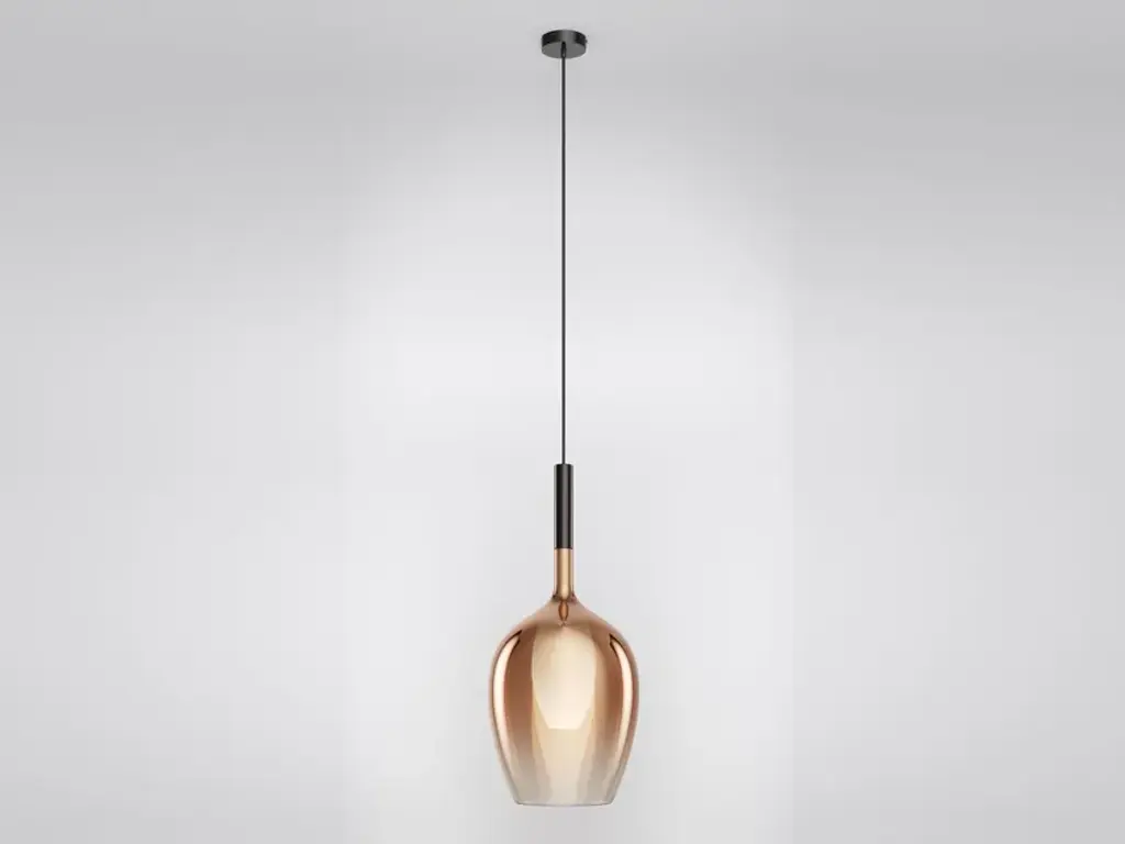 Rosè Maxi is a suspension with titanium, green water or coppered shiny coating glass diffusers and metal structure with iron grey, gold or chrome finish.Led bulbs: 1x14w - E27Rosè collection welcomes the new big version. This collection interprets the lightin the environment with an unusual and ironic look, playing with the sinuousshape and its sparkling finishes Rosè collection wants to interpret with an unusual and ironic look the light in the environment, playing with the sinuous shape and its sparkling finishes. The Rosè family consists of different combinations of wall, floor and pendant lamp.