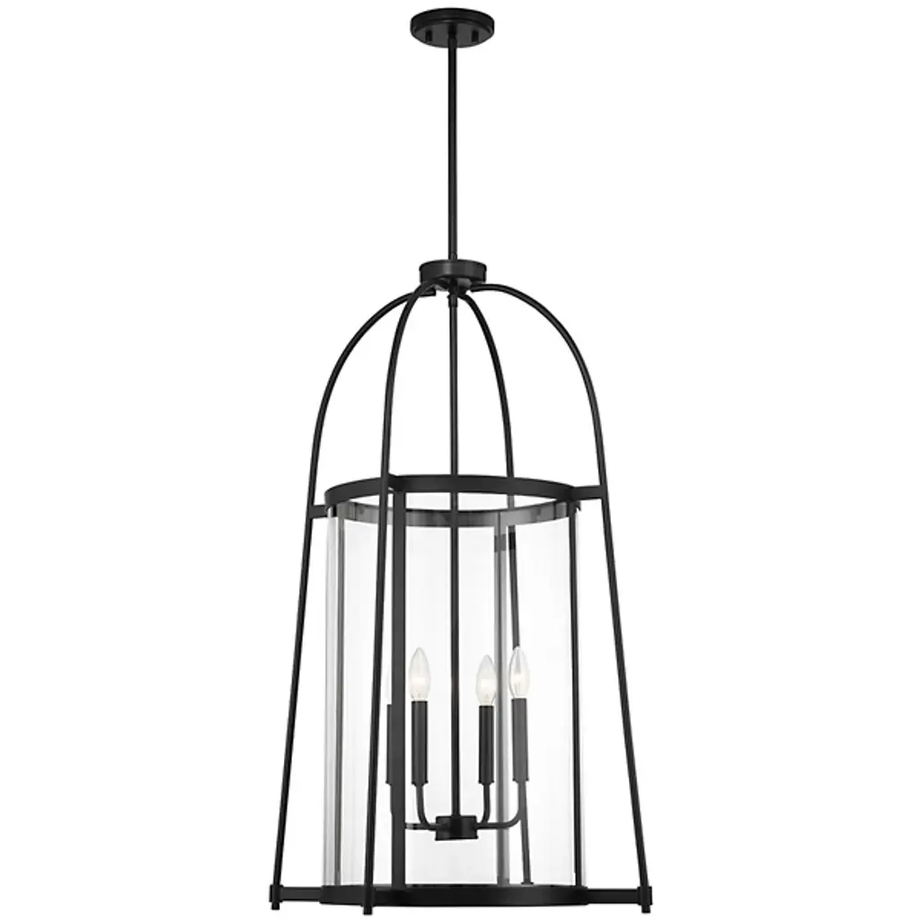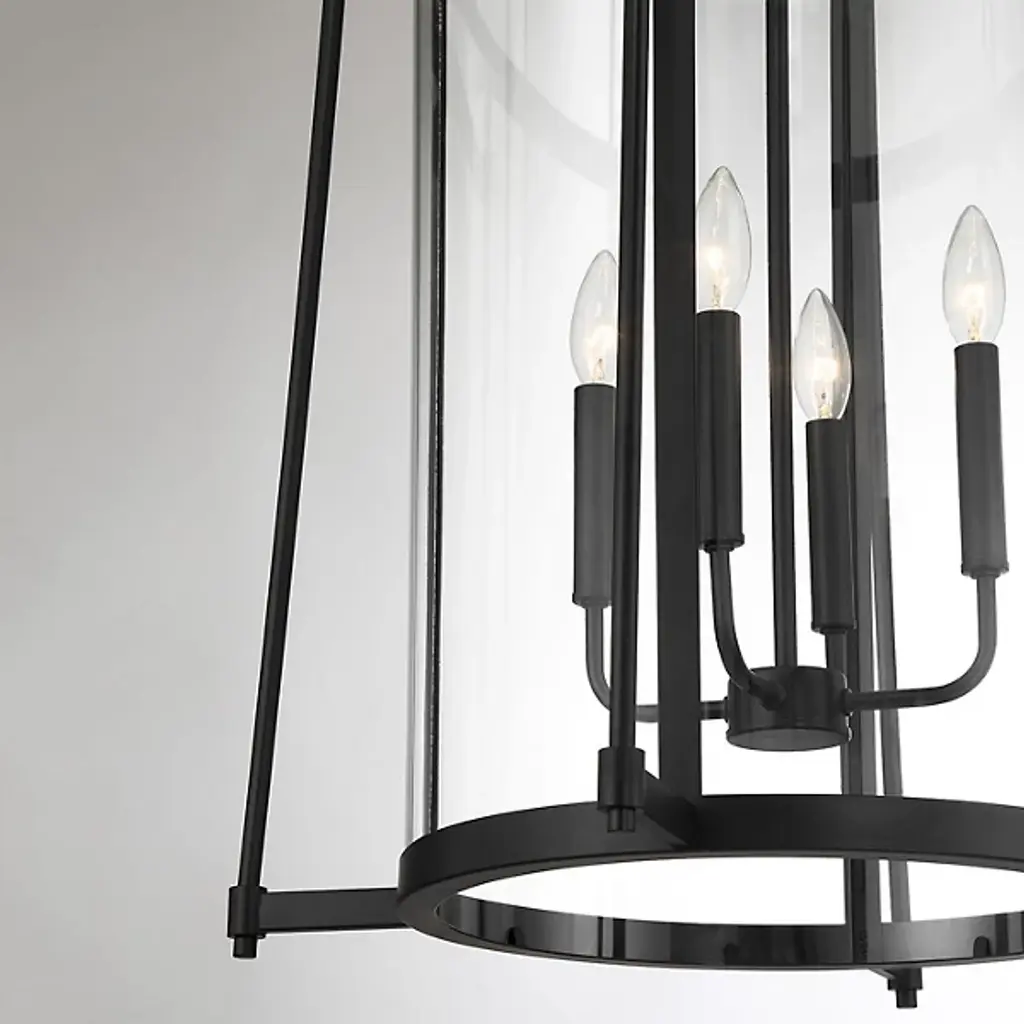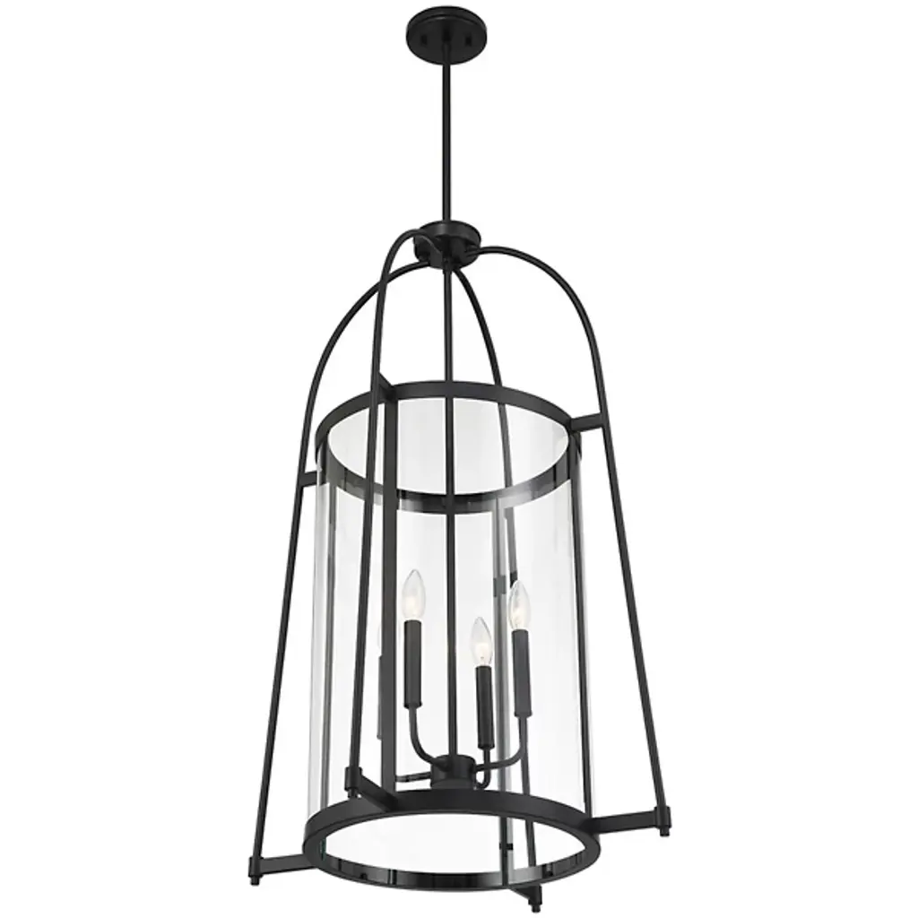 The Rosedale Pendant from Savoy House adds a sophisticated geometric presence to any space with its transitional style. The pendant matches modern elegance with vintage character. It is an open fixture made from slim metal structural elements featuring a cylindrical clear glass shade around candelabra lamping. The metal elements complement the transparency of the glass, creating a striking yet subtle lighting solution perfect for enhancing the aesthetic of any room.