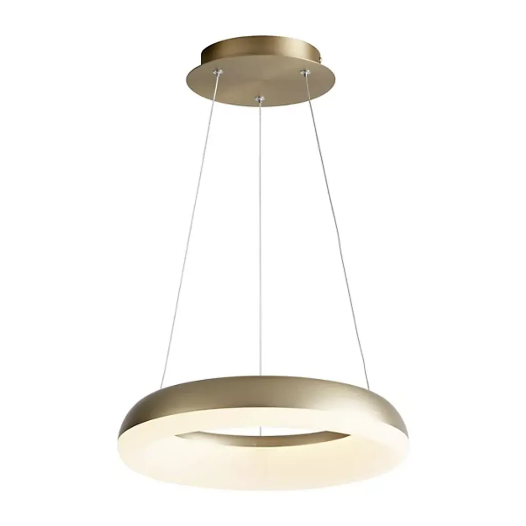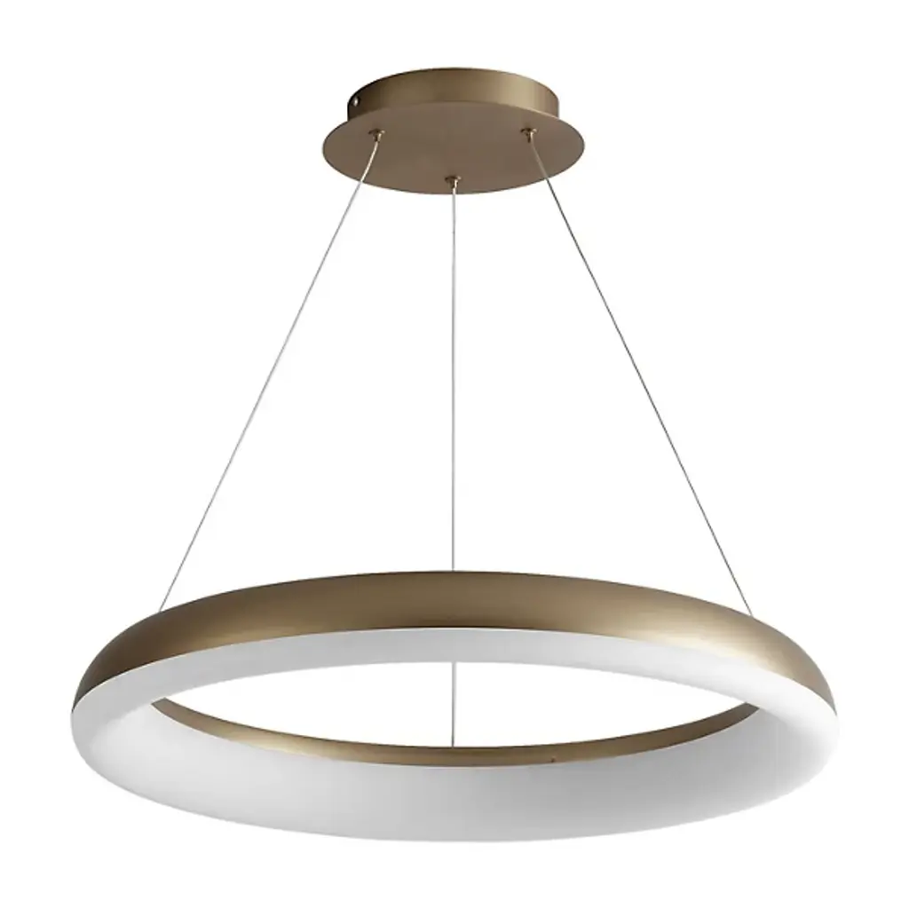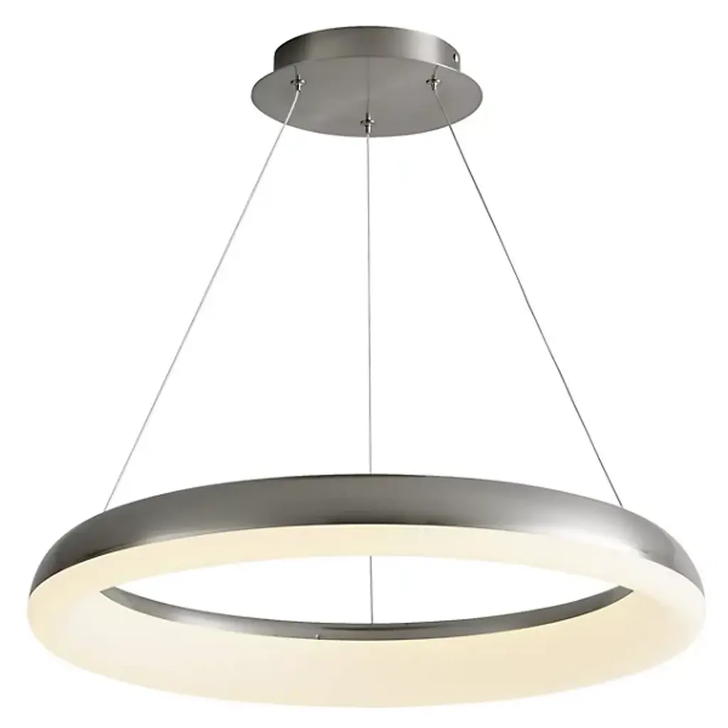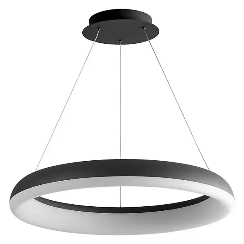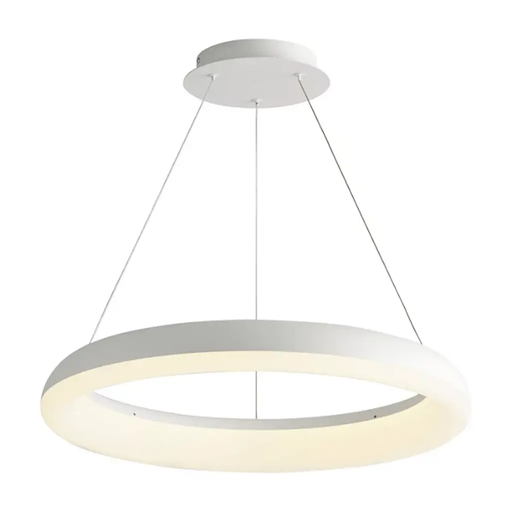 The Roswell LED Pendant by Oxygen Lighting exudes a sleek and streamlined aesthetic through its ring-shaped frame. A disc canopy sends thin cables down to a thick steel ring. A matte white acrylic diffuser seamlessly integrates into the ring’s body, creating a glowing band that widens at the piece drops. Its powerful LED is diffused through the ring to provide a blanket of energy-efficient light throughout the room, while the piece’s minimalistic design makes a modern statement in any setting.