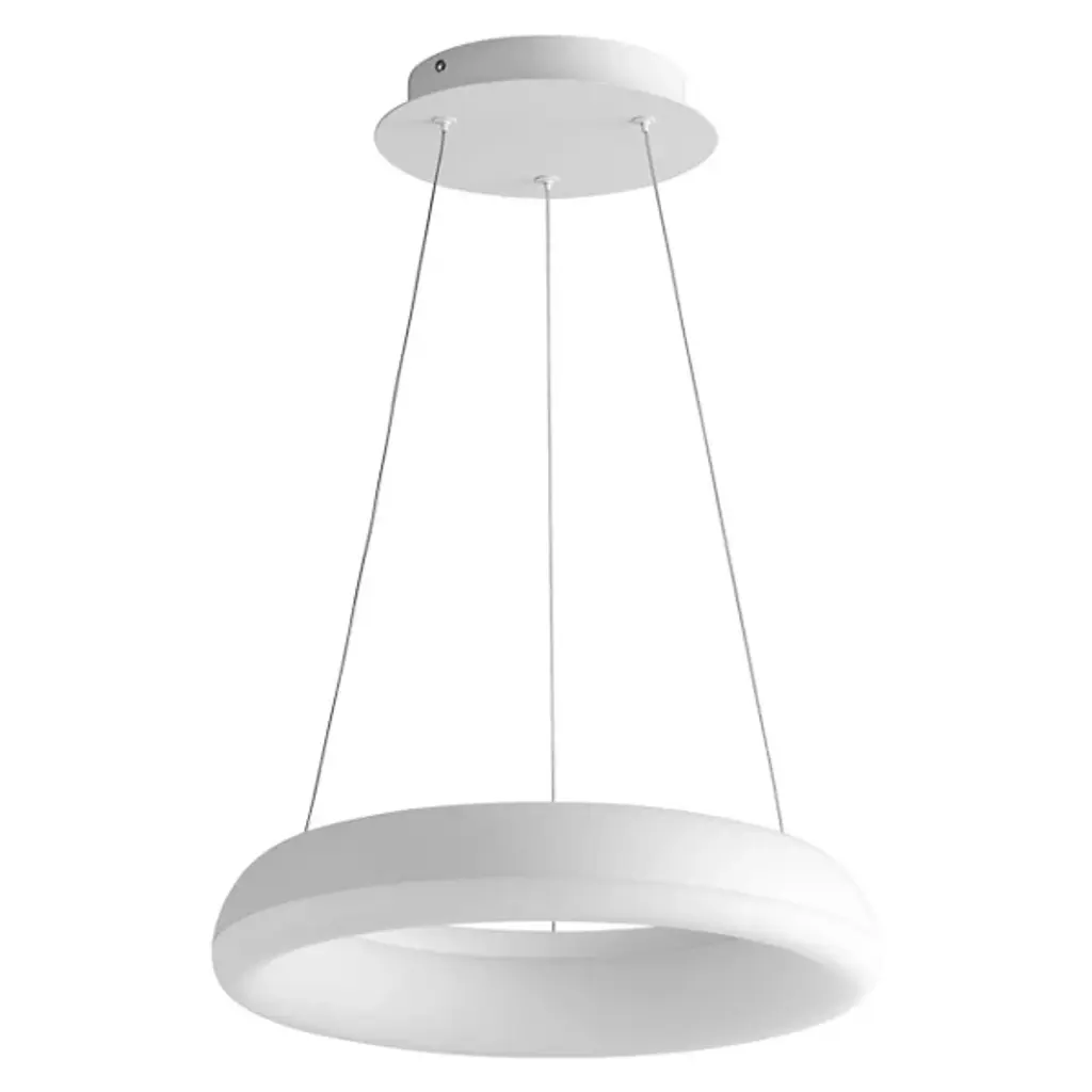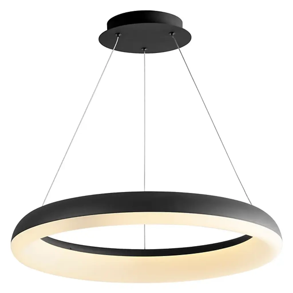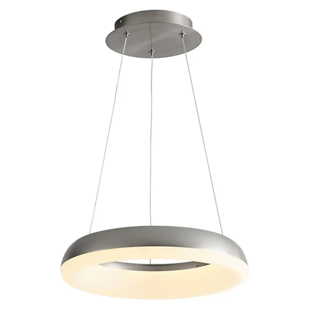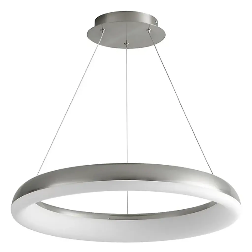 The Roswell LED Pendant by Oxygen Lighting exudes a sleek and streamlined aesthetic through its ring-shaped frame. A disc canopy sends thin cables down to a thick steel ring. A matte white acrylic diffuser seamlessly integrates into the ring’s body, creating a glowing band that widens at the piece drops. Its powerful LED is diffused through the ring to provide a blanket of energy-efficient light throughout the room, while the piece’s minimalistic design makes a modern statement in any setting.