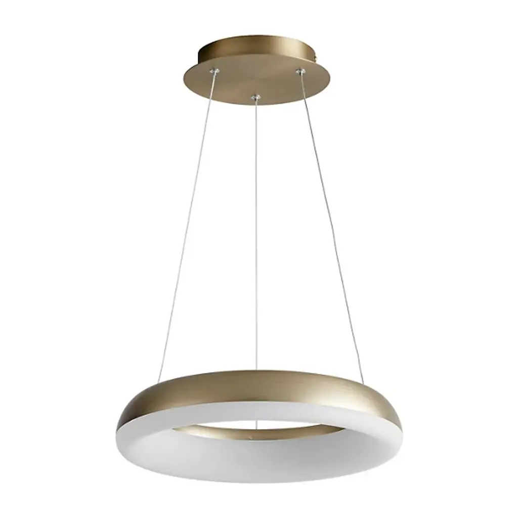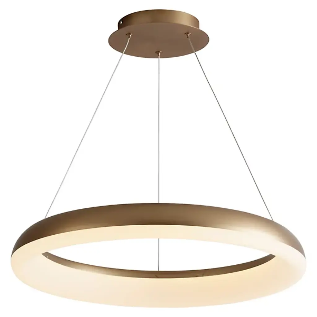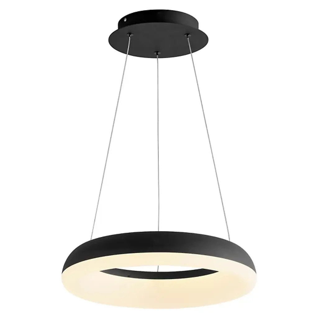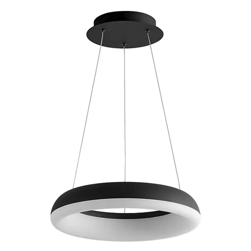 The Roswell LED Pendant by Oxygen Lighting exudes a sleek and streamlined aesthetic through its ring-shaped frame. A disc canopy sends thin cables down to a thick steel ring. A matte white acrylic diffuser seamlessly integrates into the ring’s body, creating a glowing band that widens at the piece drops. Its powerful LED is diffused through the ring to provide a blanket of energy-efficient light throughout the room, while the piece’s minimalistic design makes a modern statement in any setting.
