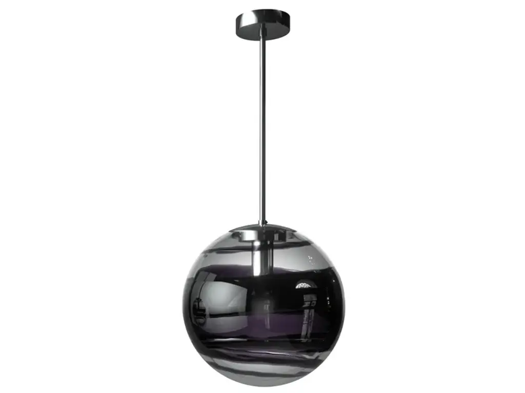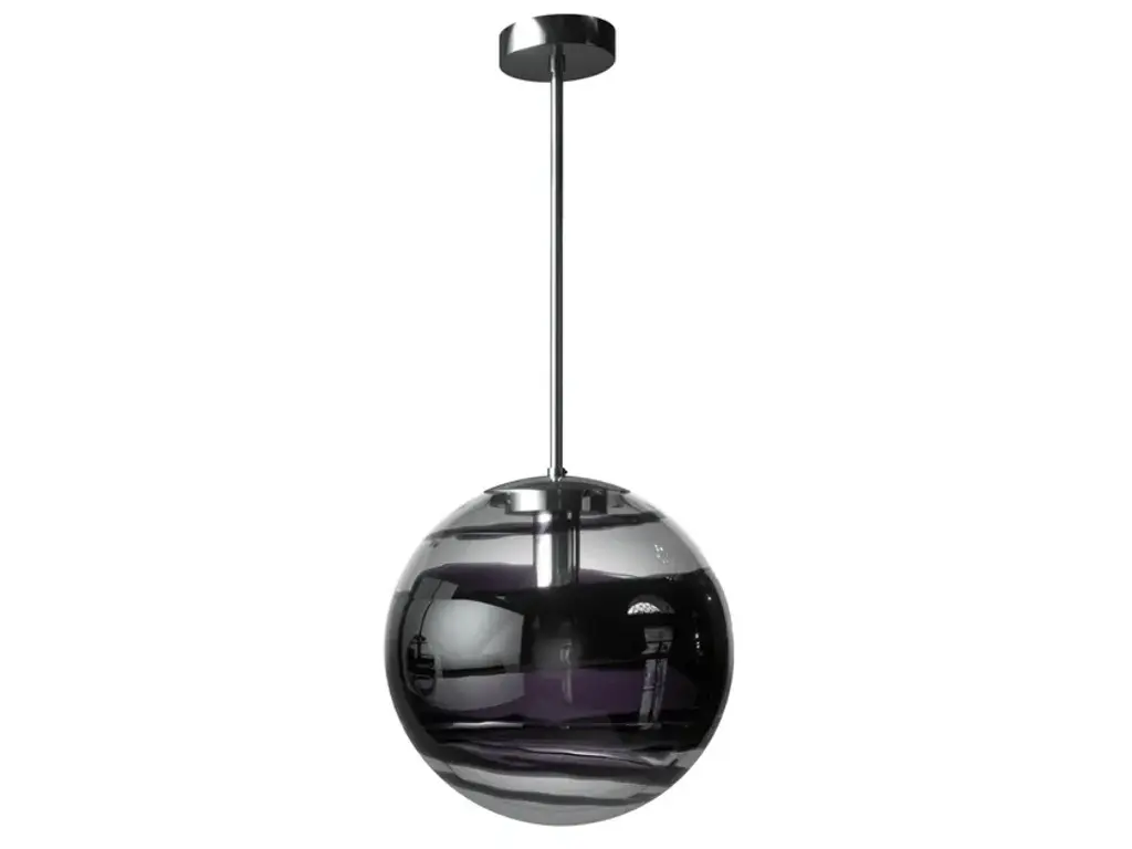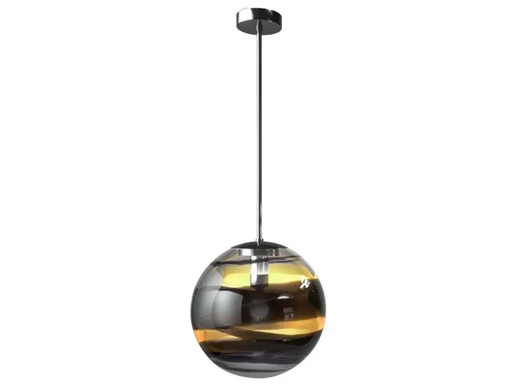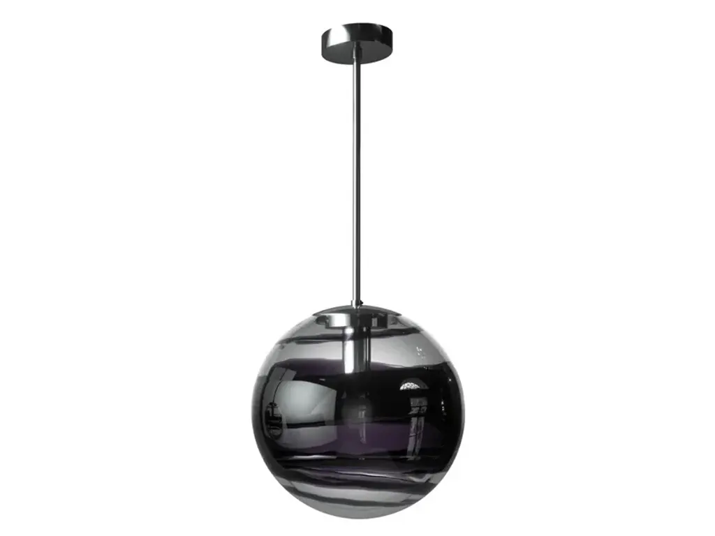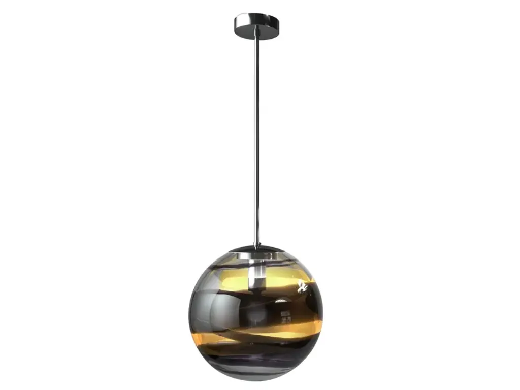 Rotondo is a suspension lamp made of band blown glass with a black nickel finish metal base. Bold shades of Black blend together with the hues of Crystal or Tea of the sphere. They enclose it, surrounding it with thin and thick lines, alternating in a seemingly random fashion, like belts or laces. A fine interplay of transparencies gives a warm and sensual glow to light passing through the glass. Rotondo is exclusively available as a pendant light.Colors:Crystal / Black / TeaCrystal / BlackLight source:Cod. 893.50 / 893.51 / 893.52 - 1 x max 8W LED E14Cod.893.55 / 893.56 / 893.57 - 1 x max 12W LED E27